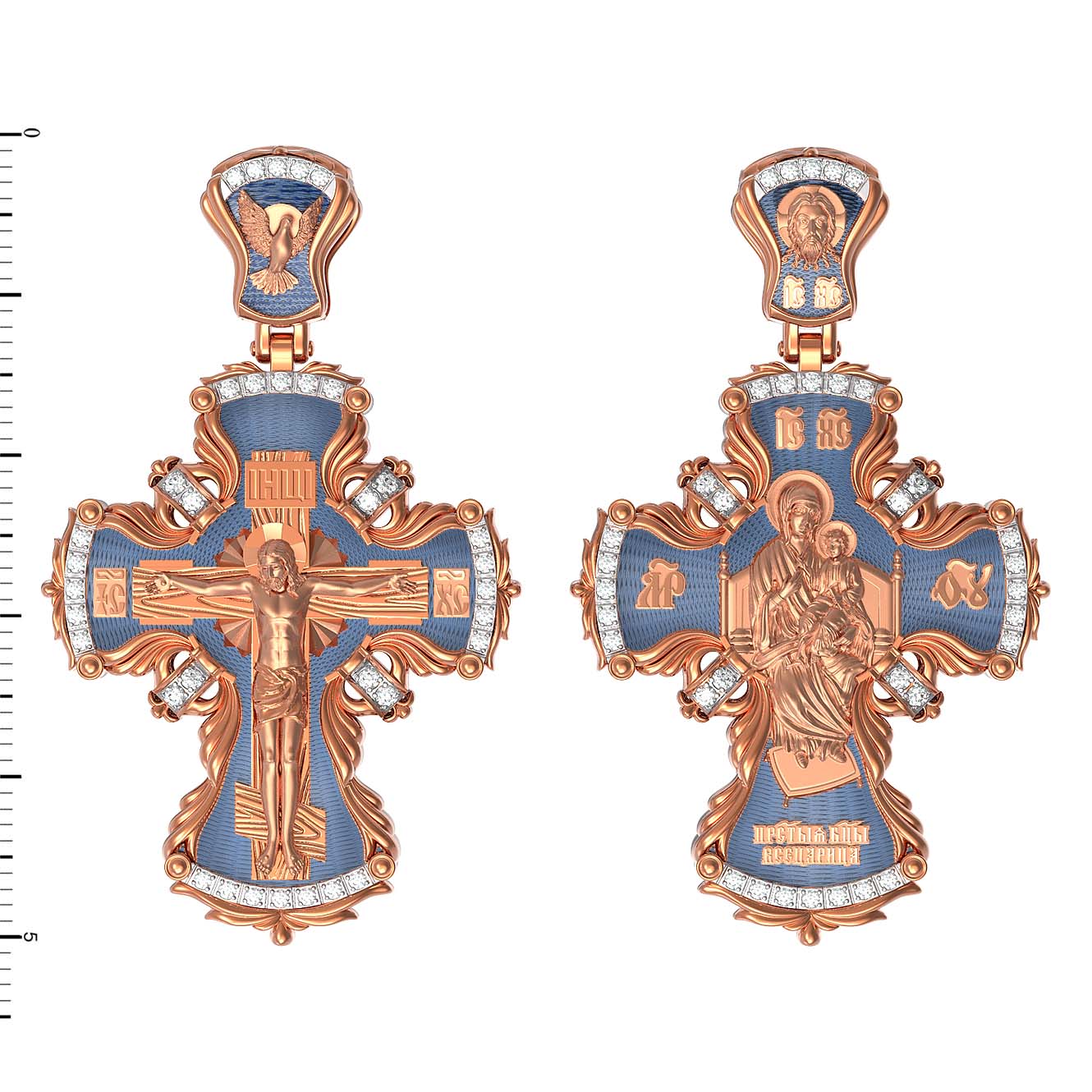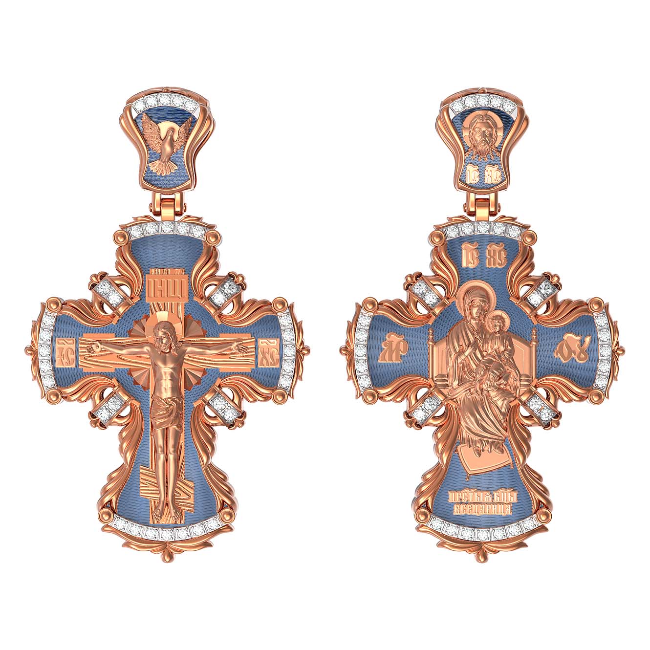 На лицевой стороне креста изображено Распятие Господа и Спасителя нашего Иисуса Христа, отдавшего Себя на смерть, чтобы другие могли жить — жить вечной жизнью, жить с Богом. Своею кровью Господь освятил крест и сделал его проводником Своей благодати, источником освящения верующих. На верхней табличке, выше головы Иисуса, расположена надпись, составленная Понтием Пилатом — «ИНЦИ». Она означает «Иисус Назорей, Царь Иудейский». Надпись «IС ХС» означает Иисус Христос помещается на разных сторонах поперечной (большой) перекладины креста. На кулонном кольце помещено изображение Духа Святого в виде голубя, сходящего с Небес.