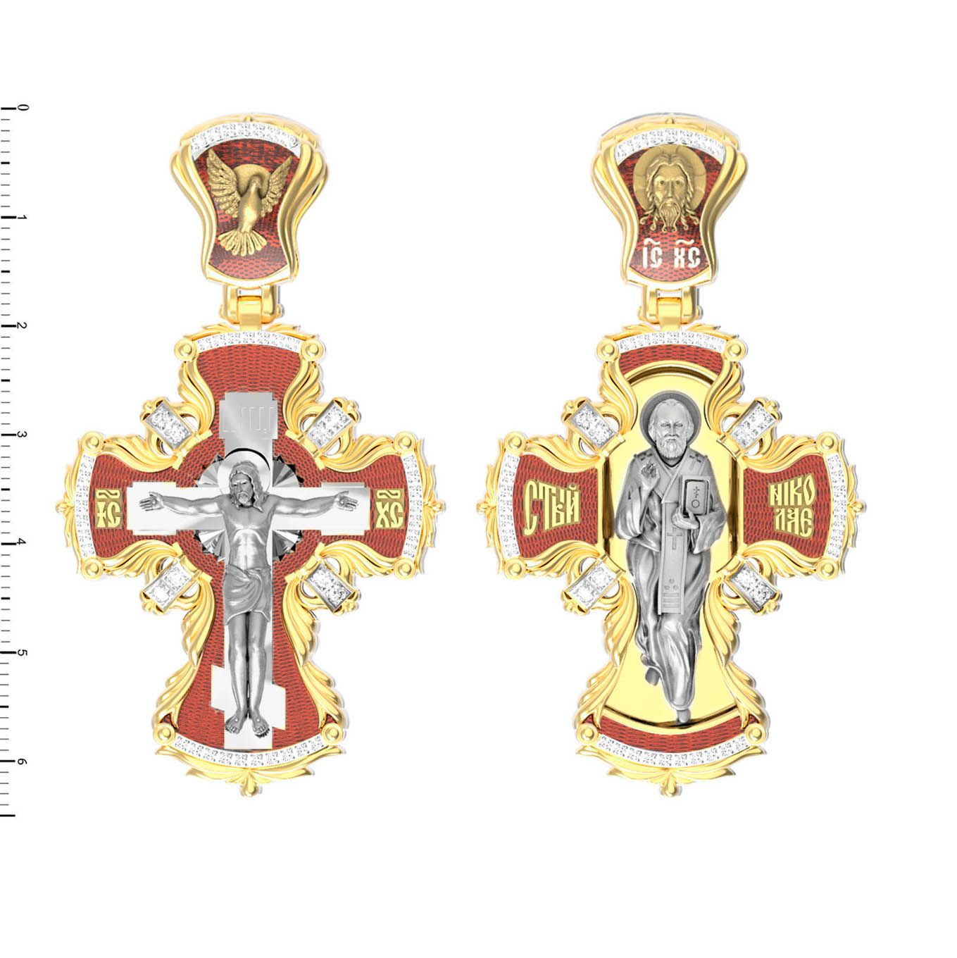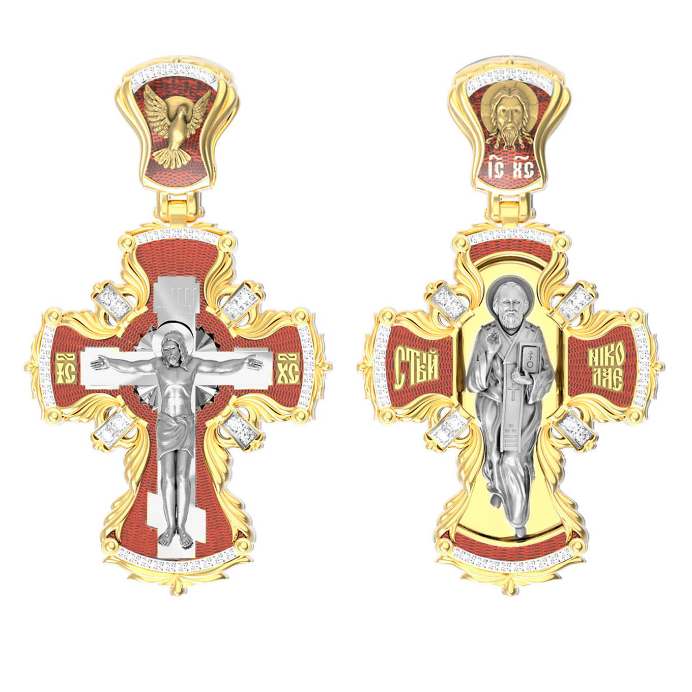 Оборотную сторону креста возглавляет икона святителя Николая Чудотворца, самого почитаемого святого не только в России, но и во всем мире. Николай Чудотворец, помощник в делах, защитник путешествующих, покровитель учащихся, утешитель обиженных и нуждающихся, целитель самых страшных и тяжелых недугов, предстатель и молитвенник за людей перед Богом. На кулонном кольце помещено изображение Спаса Нерукотворного — образ Спасителя, который Он запечатлел на плате и передал для исцеления больному проказой царю Эдессы.