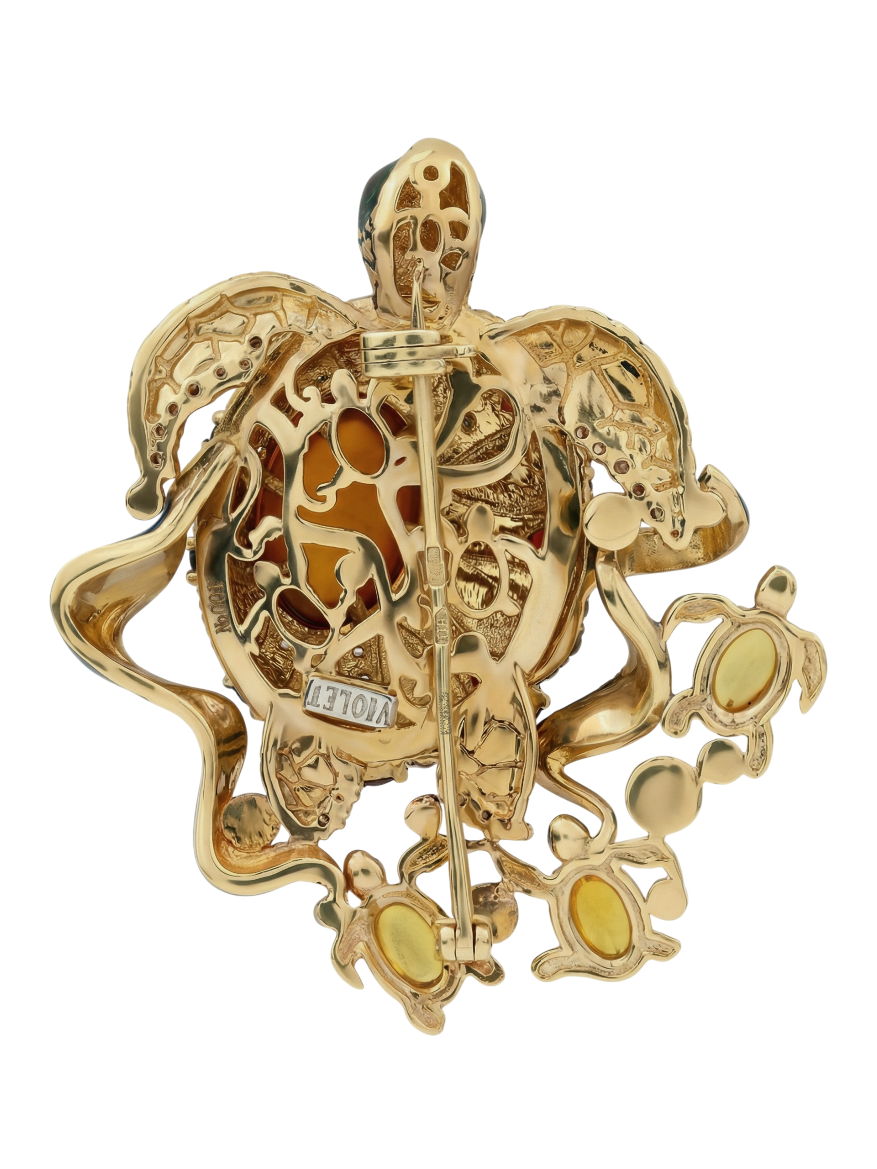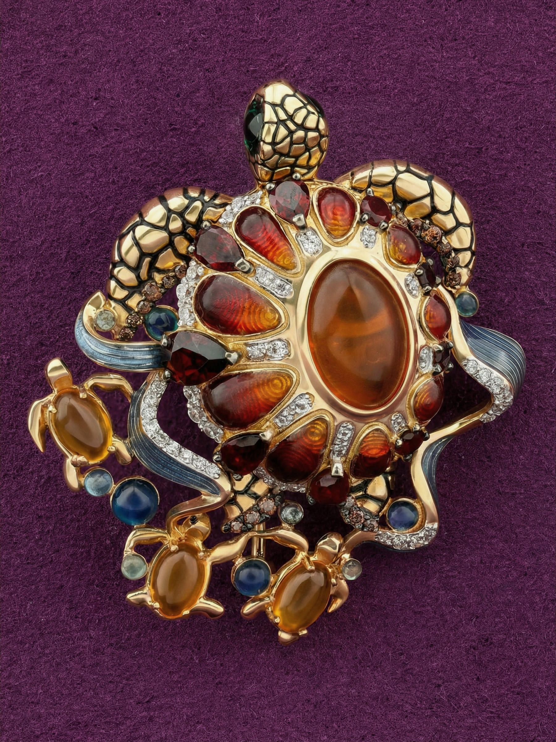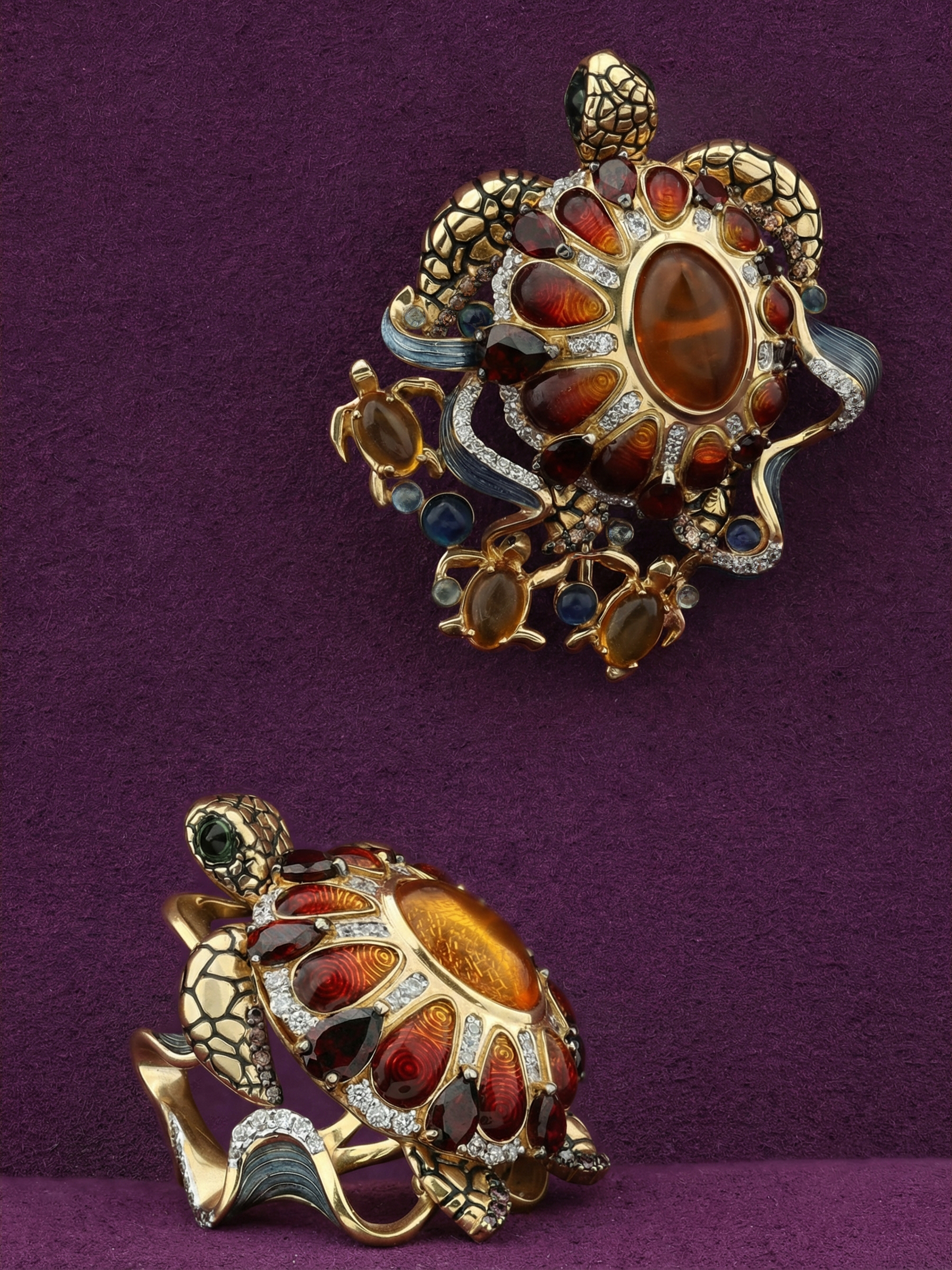 Брошь из лимонного золота c эмалью, фианитом, гранатом и янтарём