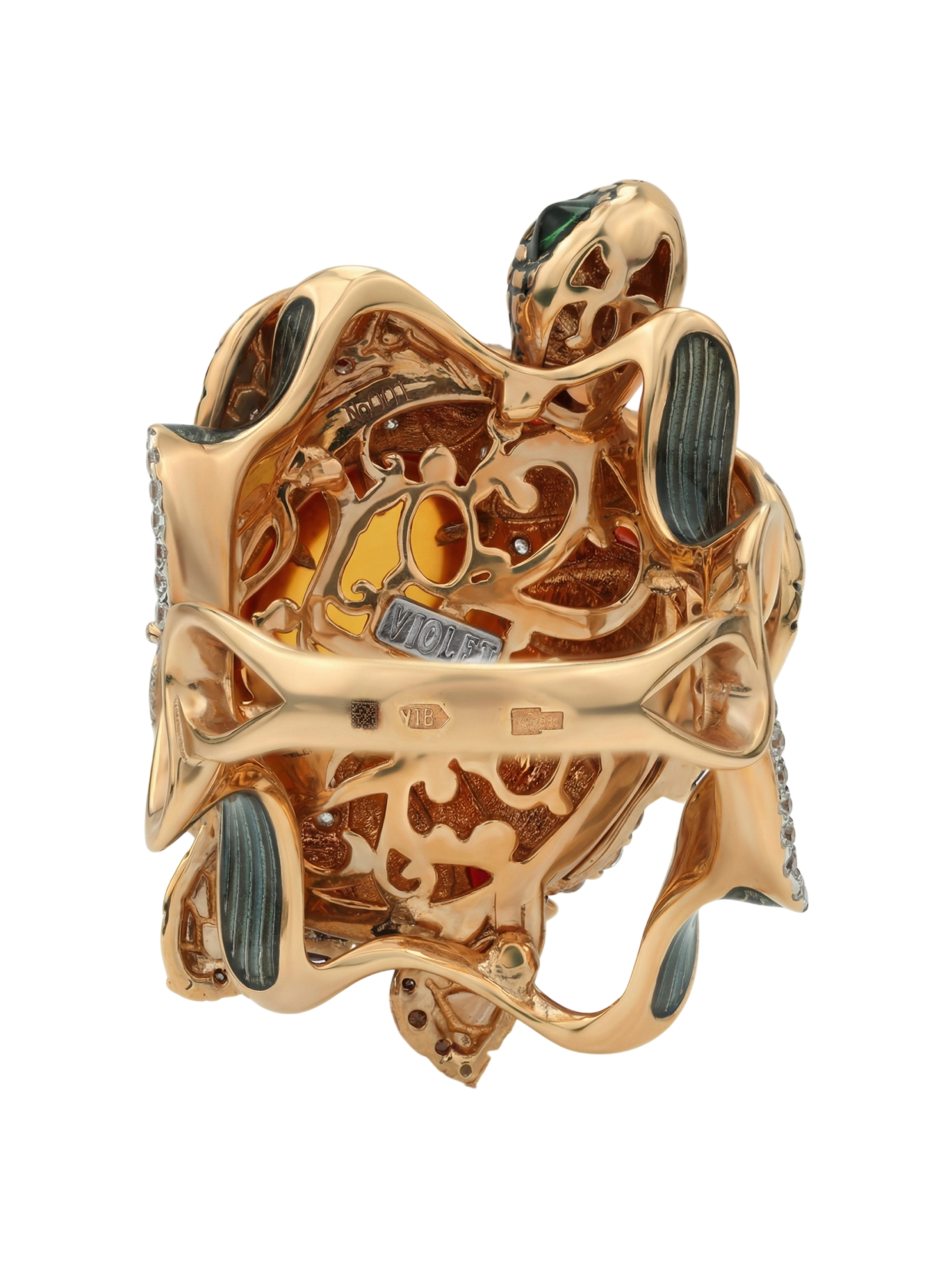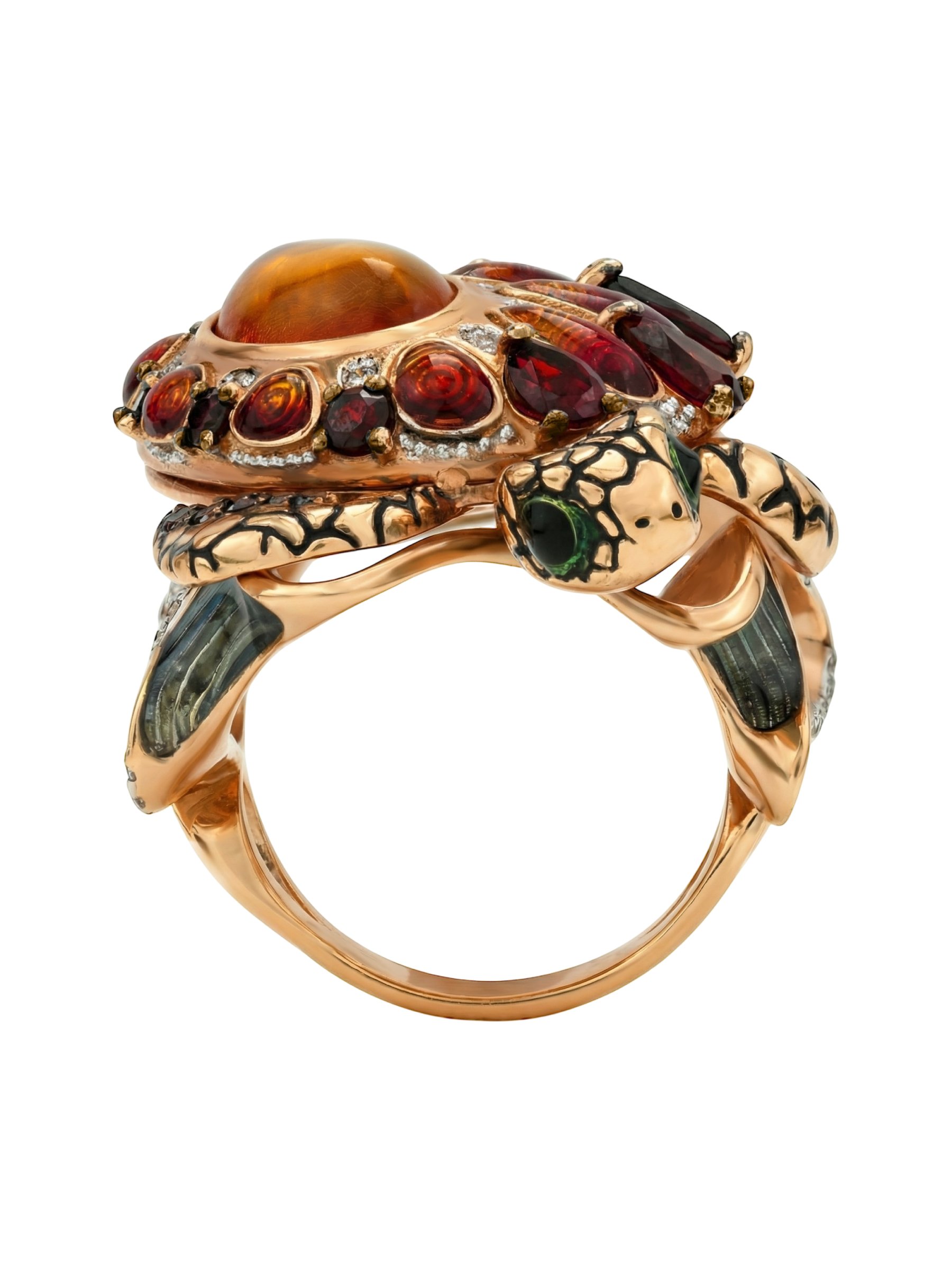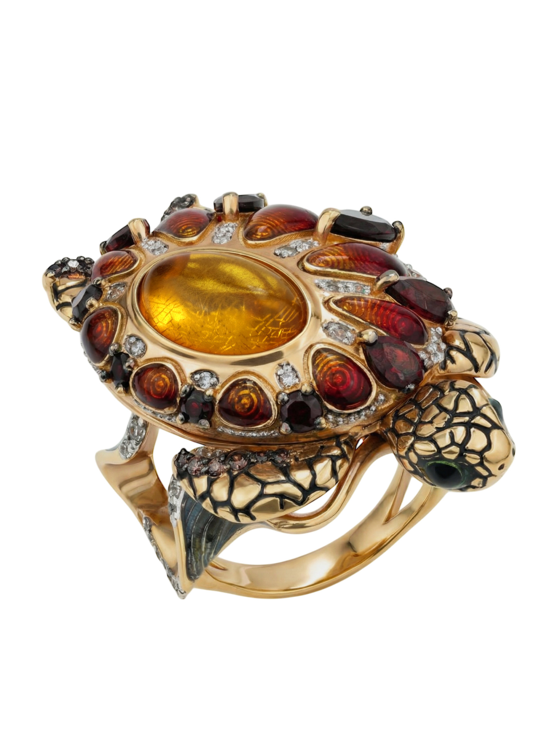 Кольцо из золота c эмалью, фианитом, гранатом и янтарём