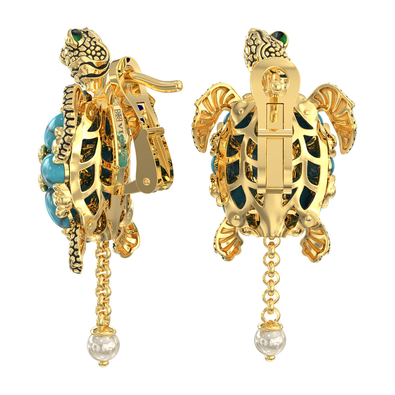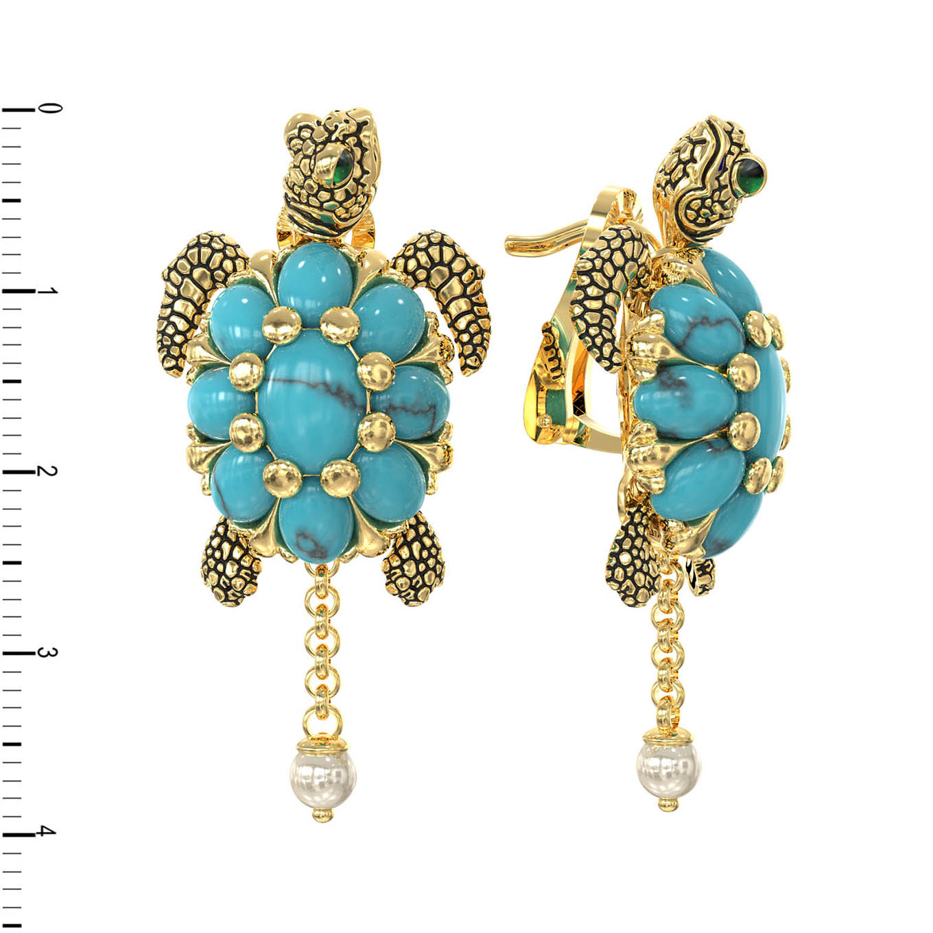 Серьги из лимонного золота c эмалью, жемчугом и бирюзой