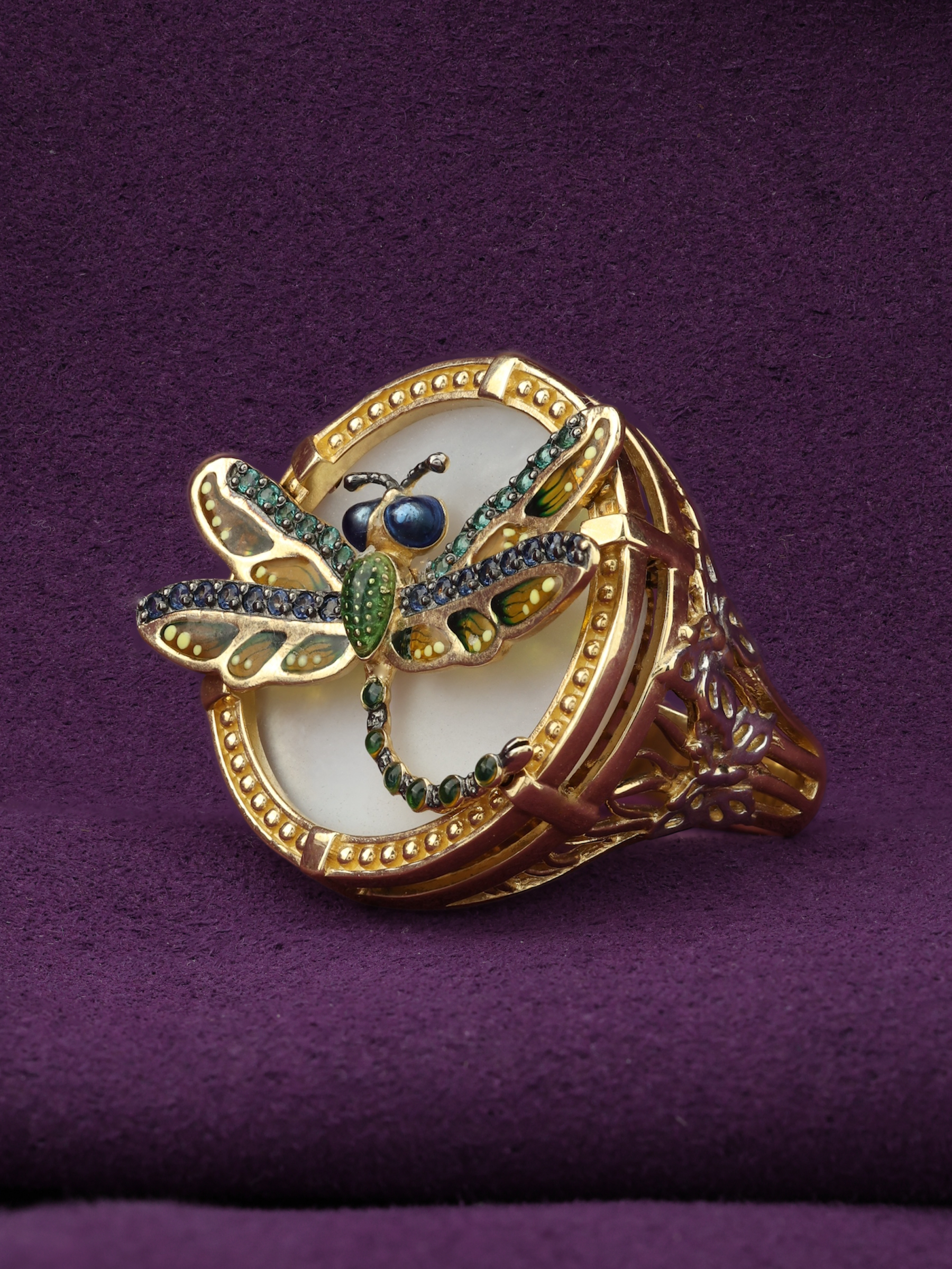 Кольцо из лимонного золота c сапфиром, изумрудом, эмалью и перламутром