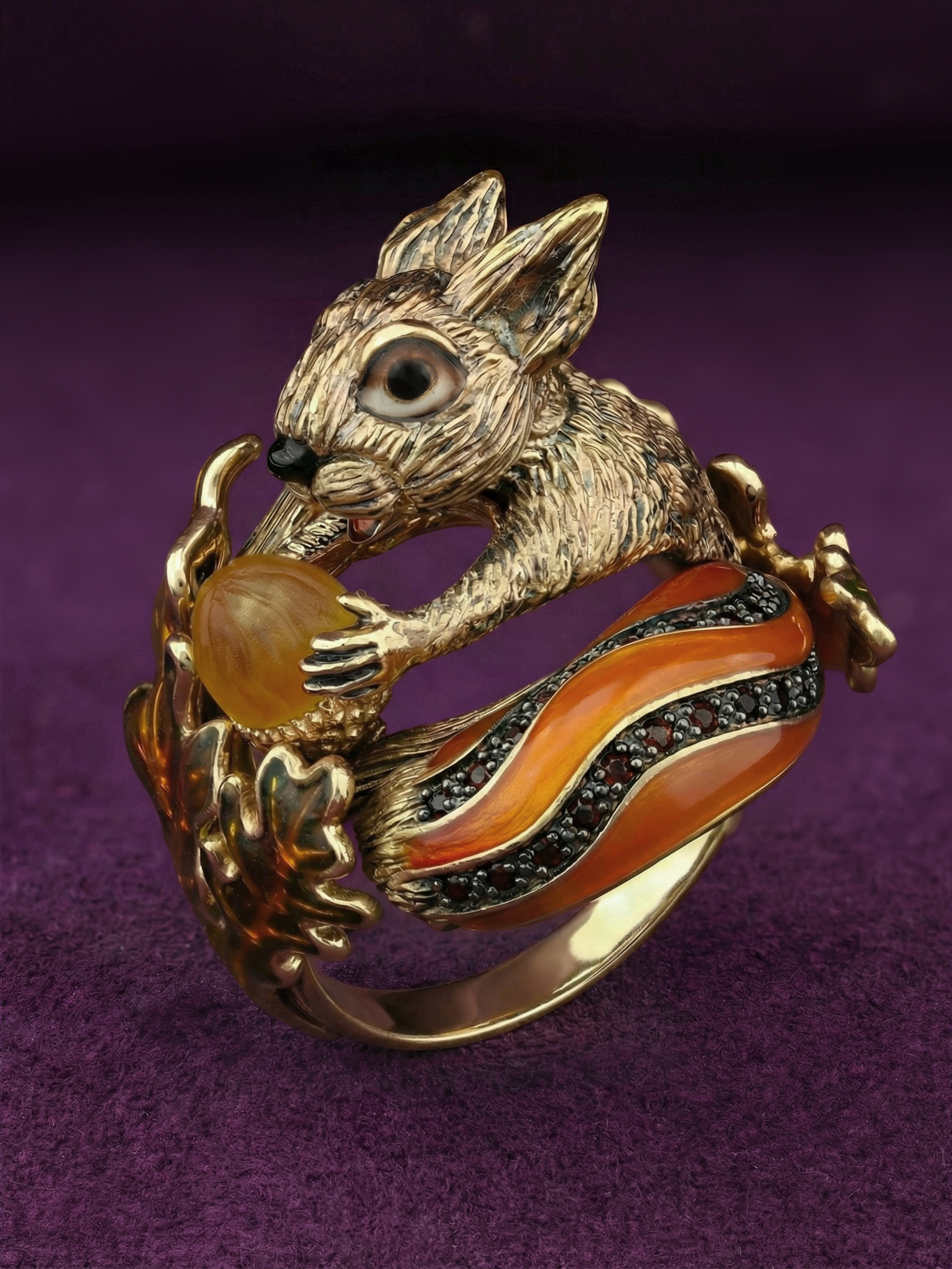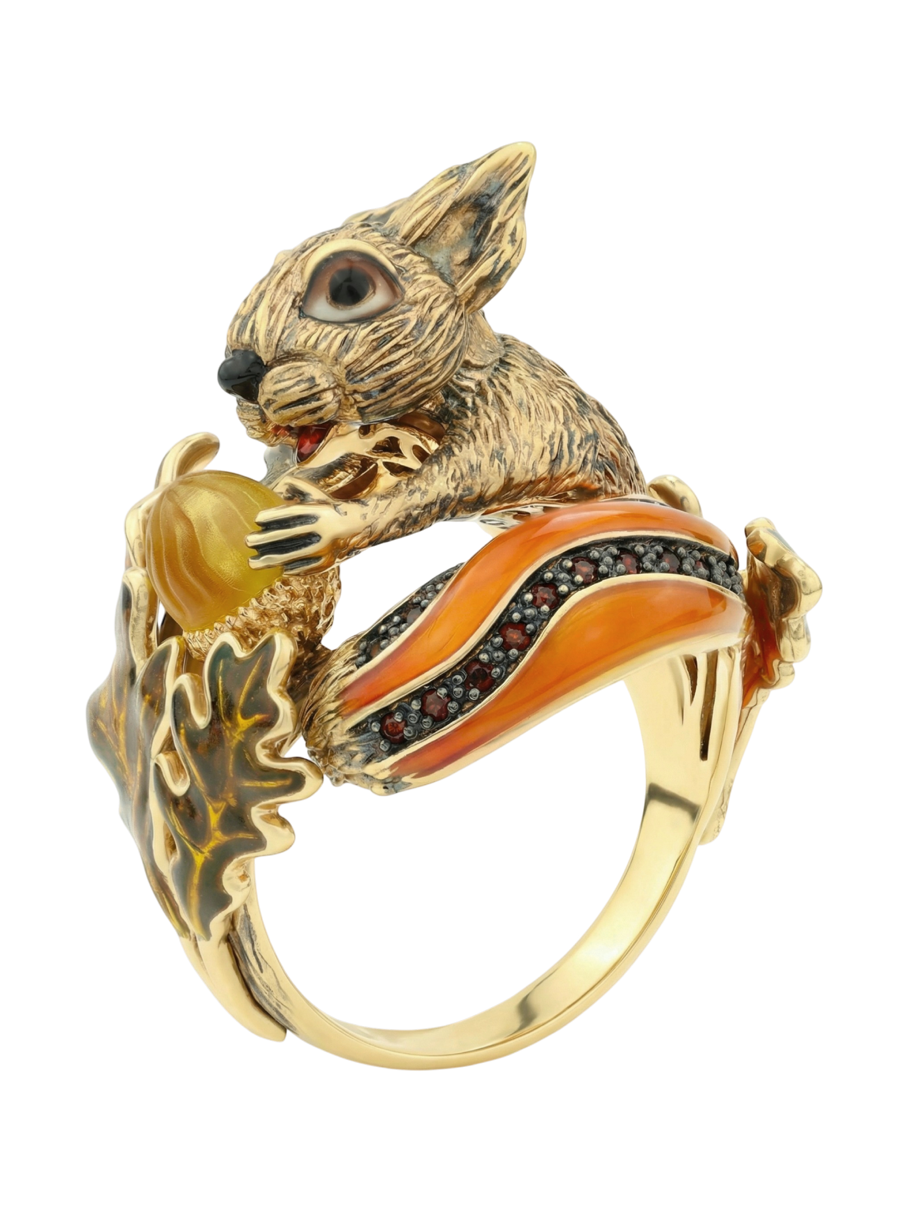 Кольцо из лимонного золота c эмалью, гранатом и янтарём