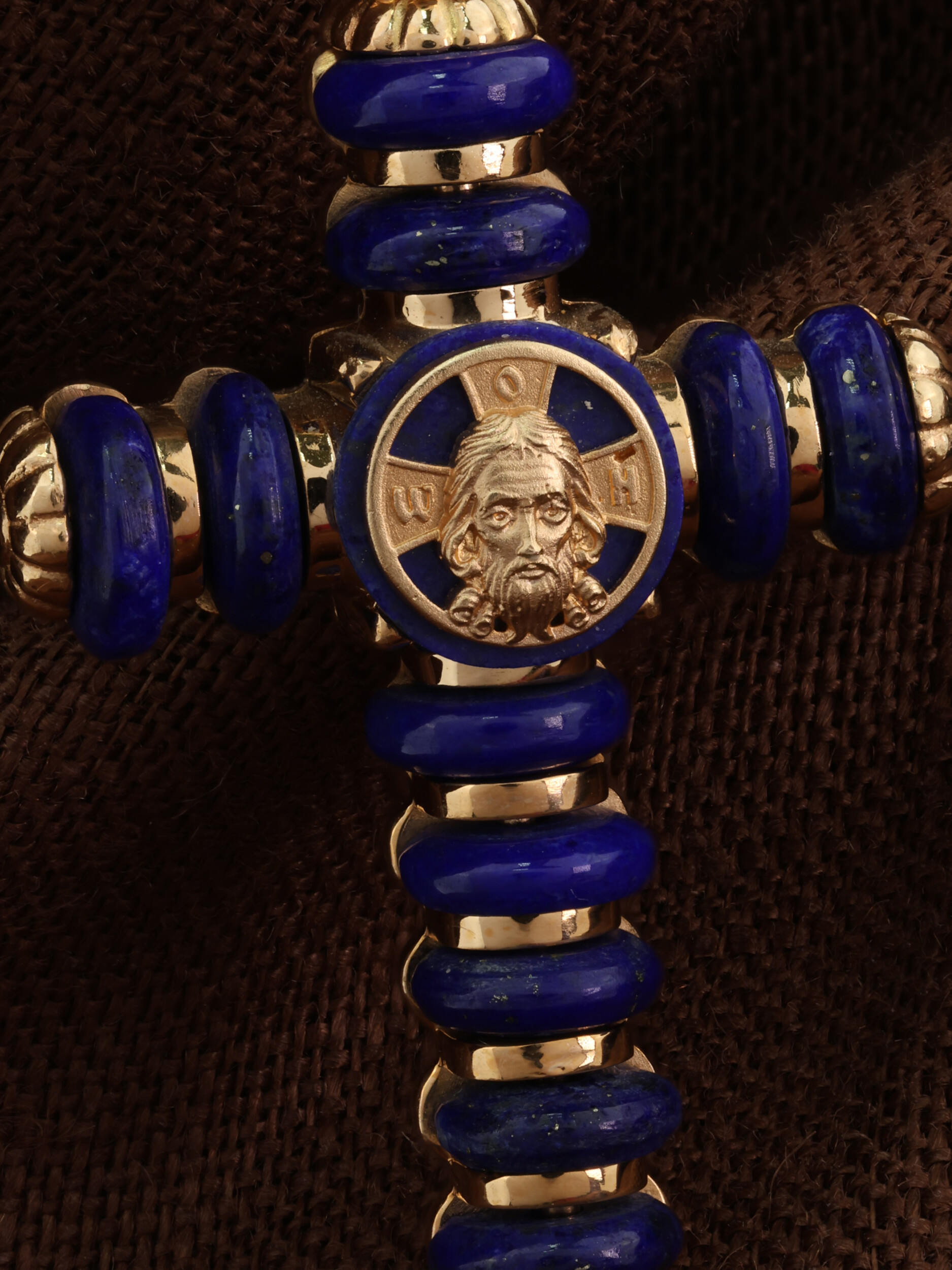 В центральной части лицевой стороны креста изображен Спас Нерукотворный — образ Господа и Спасителя нашего Иисуса Христа, чудесно отпечатавшийся на плате, котором Христос вытер свой лик. Согласно Преданию, изложенному в Четьи Минее, Авгарь V Ухама, больной проказой, послал ко Христу своего архивария Ханнана (Ананию) с письмо, в котором просил Христа прийти в Едессу и исцелить его. Ханнан же был художником, и Авгарь поручил ему, если Спаситель не сможет прийти, то написать хотя бы Его образ и принести ему. Видя, что Ханнан хочет сделать Его портрет, Христос потребовал воды, умылся, вытер Свой лик платом, и на этом плате отпечатался Его образ. Спаситель передал этот плат Ханнану с повелением отнести с ответным письмом пославшему его. Получив портрет, Авгарь исцелился от главного своего недуга, но лицо его оставалось еще поврежденным. После Пятидесятницы в Едессу пошёл святой апостол Фаддей, один из 70-ти, закончил исцеление Авгаря и обратил его в христианство. Авгарь прикрепил образ к доске и поместил в нише над городскими воротами, убрав оттуда находившегося там идола.