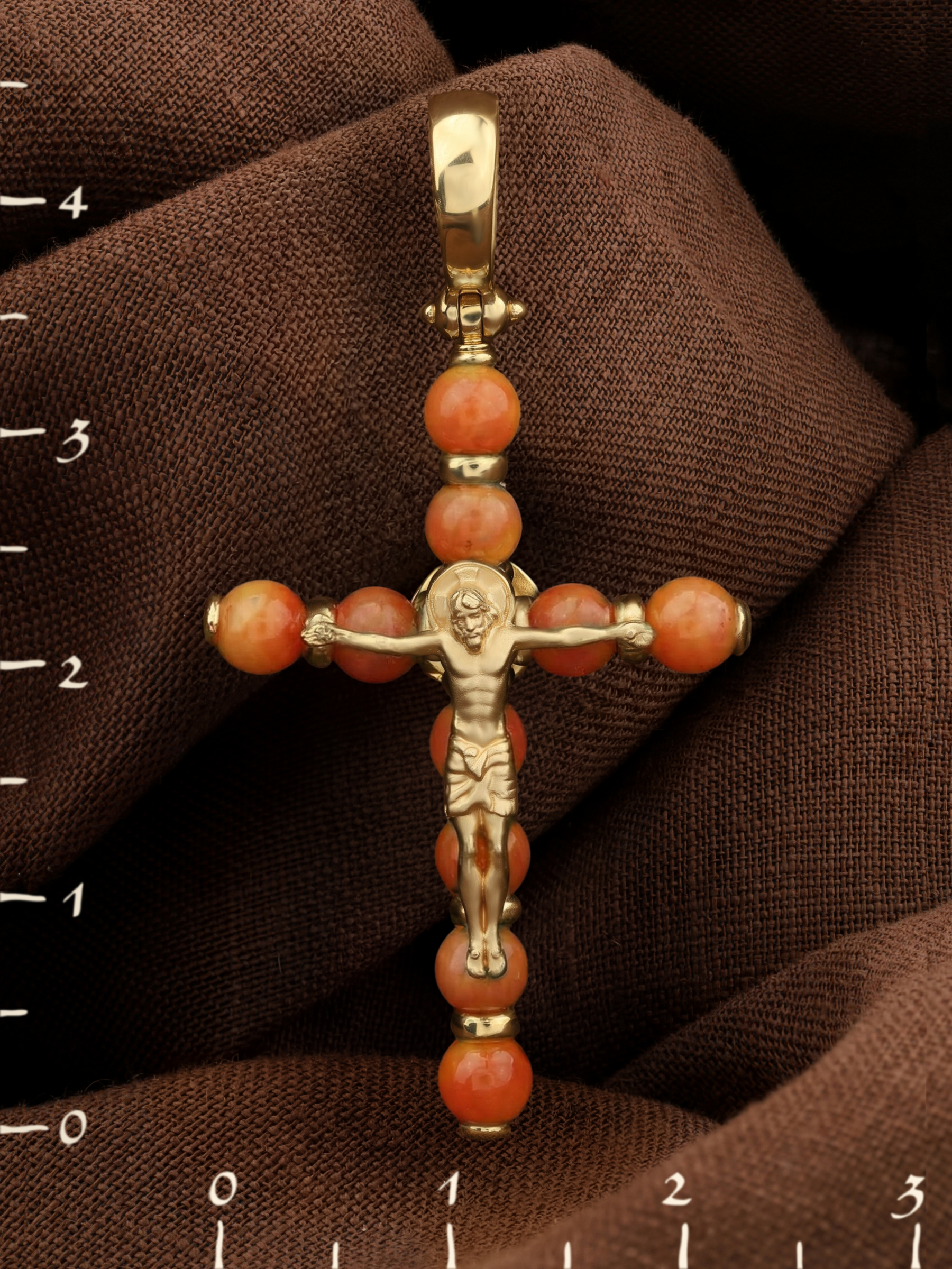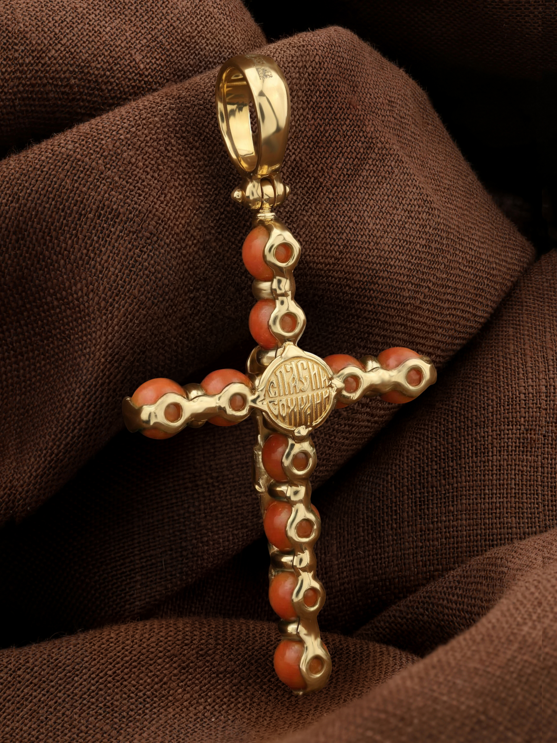 На лицевой стороне креста изображено Распятие Господа и Спасителя нашего Иисуса Христа. Своими крестными страданиями Господь смыл наши грехи, покрыл наш долг перед Богом или, на языке Писания, нас «искупил». В Голгофе сокрыта непостижимая тайна бесконечной правды и любви Бога. Крест стал символом победы добра над злом, жизни над смертью, напоминанием бесконечной Божьей любви, предметом радости. Воплотившийся Сын Божий Своею кровью освятил крест и сделал его проводником Своей благодати, источником освящения верующих. На верхней табличке, выше головы Иисуса, расположена надпись, составленная Понтием Пилатом — «IНЦI». Она означает «Иисус Назорей, Царь Иудейский». Надпись «IC» «ХC», означает Иисус Христос, помещаются на разных сторонах поперечной перекладины креста. Христос в Своей Божественной любви, над которой смерть не властна и которая, страдая, и не страдает в обычном смысле, простирает к людям со Креста Свои объятия, в которые призывается и привлекается весь мир. Поэтому Тело Его не висит, а торжественно покоится на Кресте.