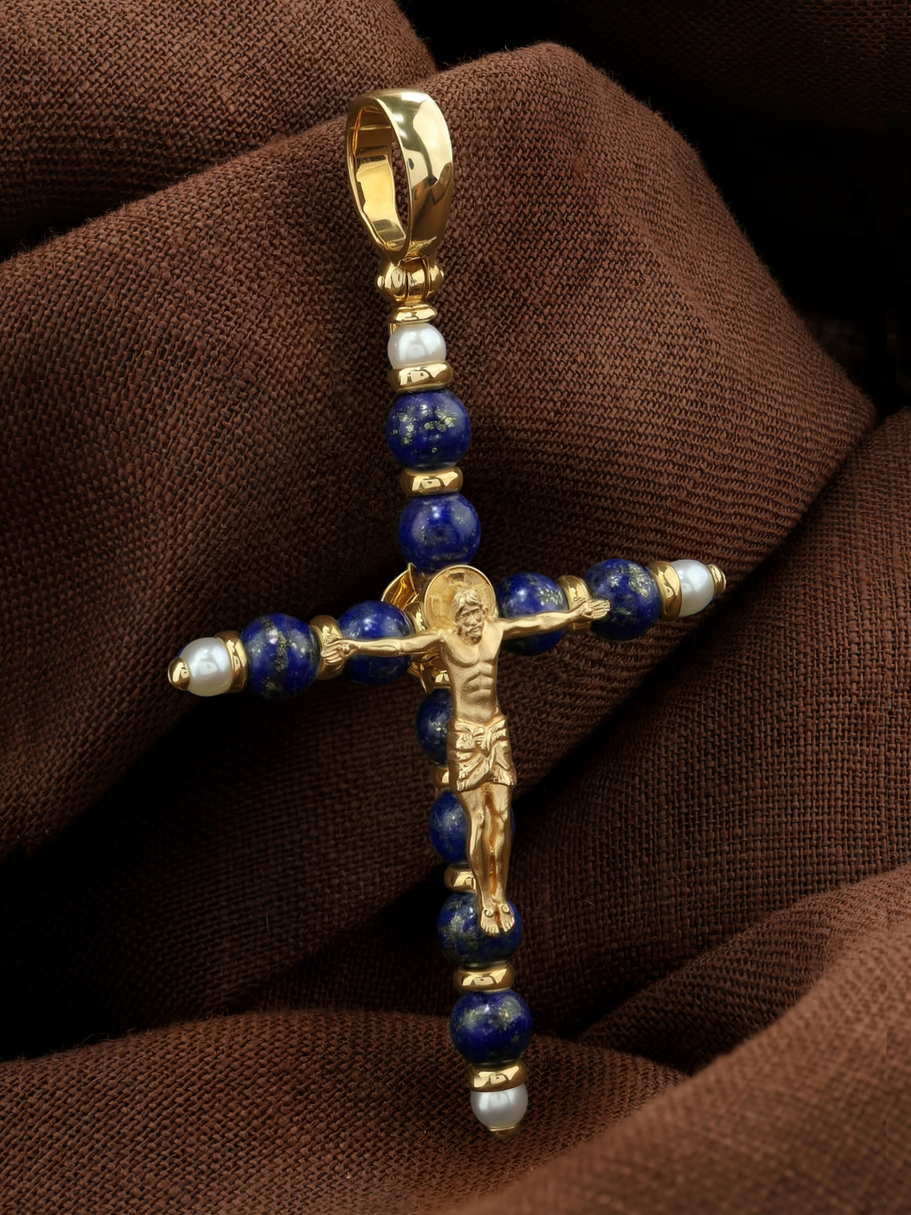 Крест из лимонного золота c жемчугом и лазуритом