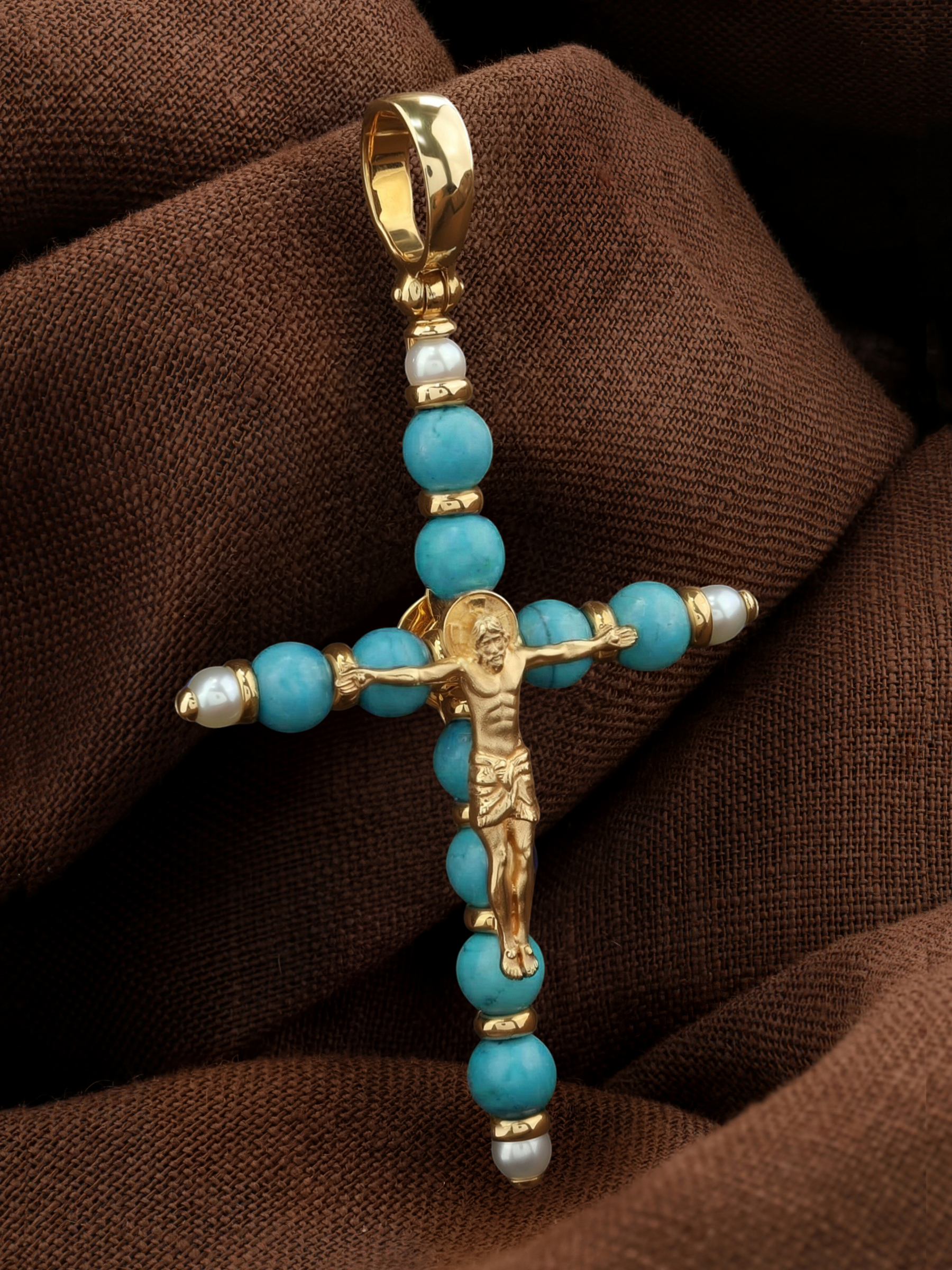 Крест из лимонного золота c жемчугом и бирюзой