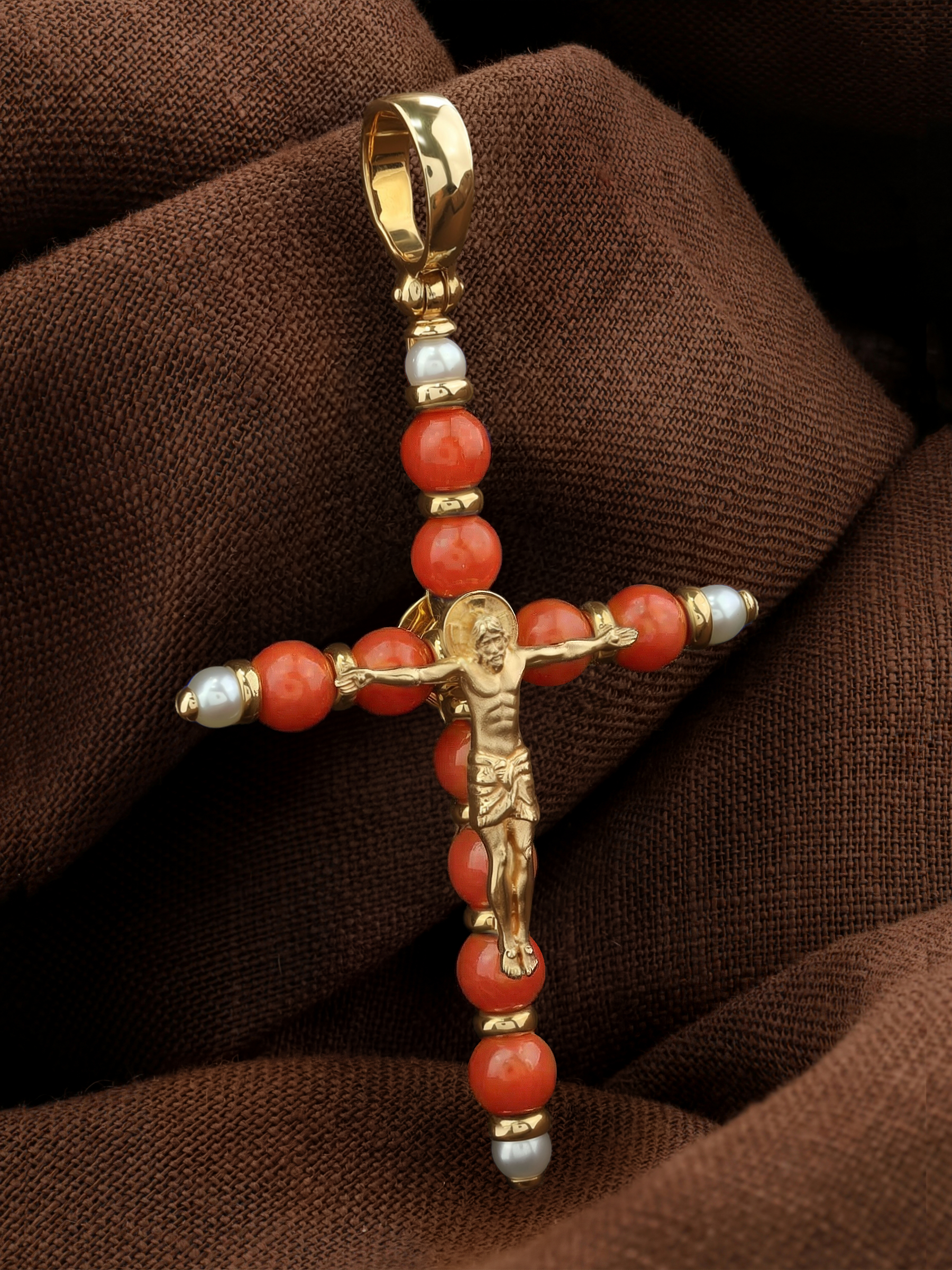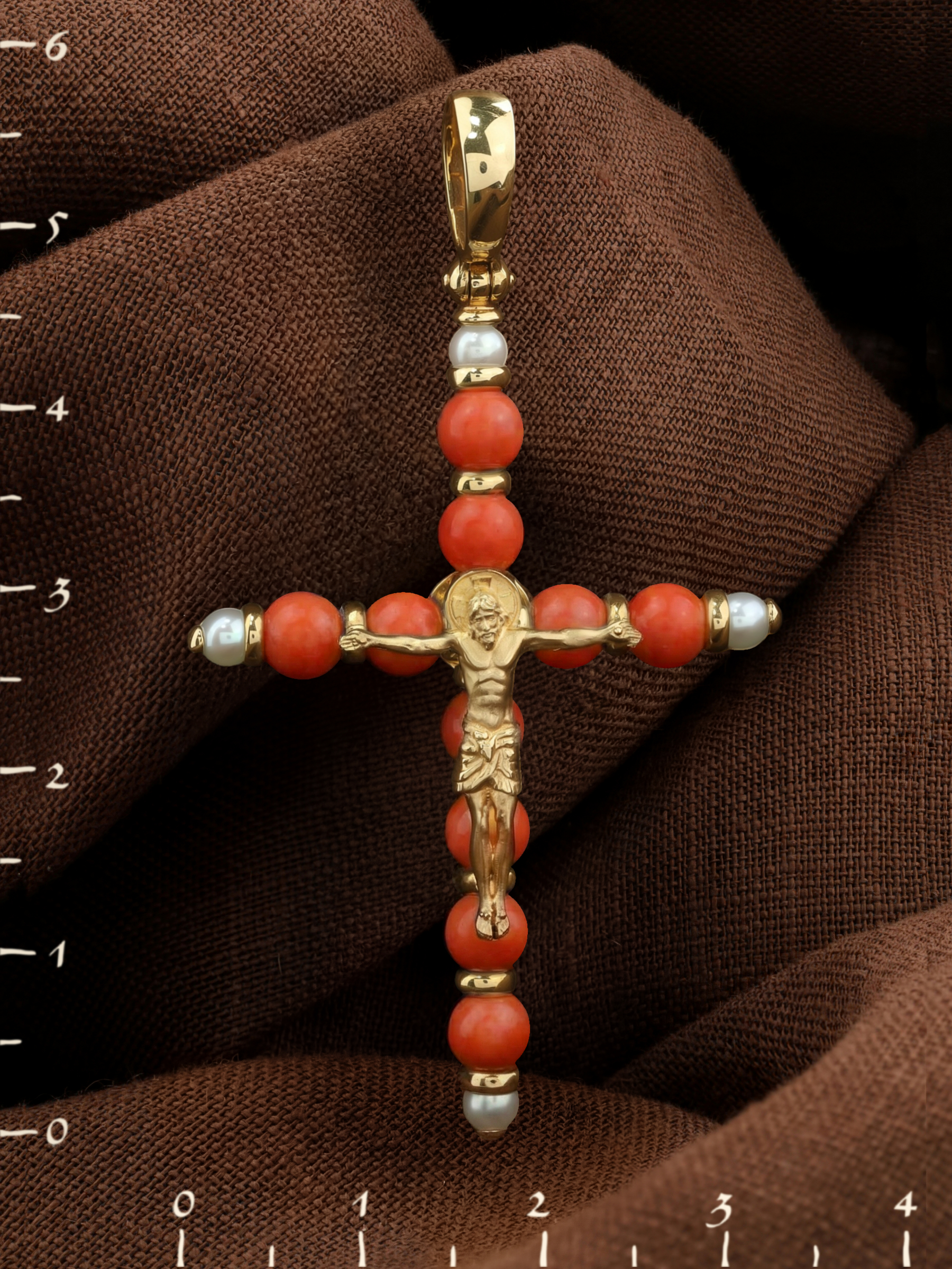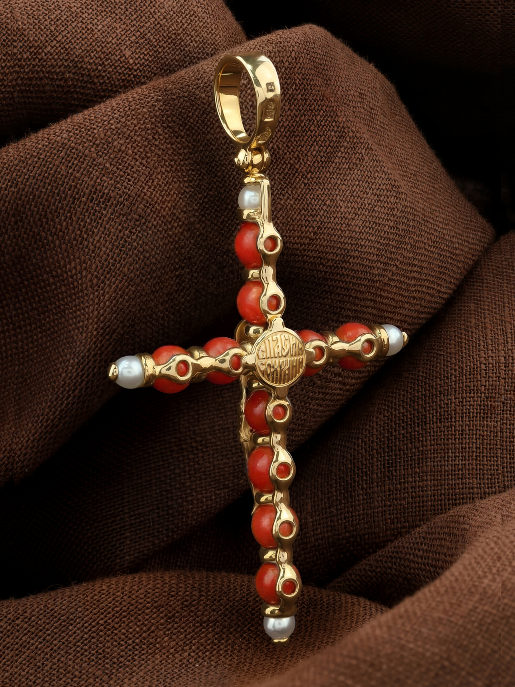 Крест из лимонного золота c жемчугом и кораллом
