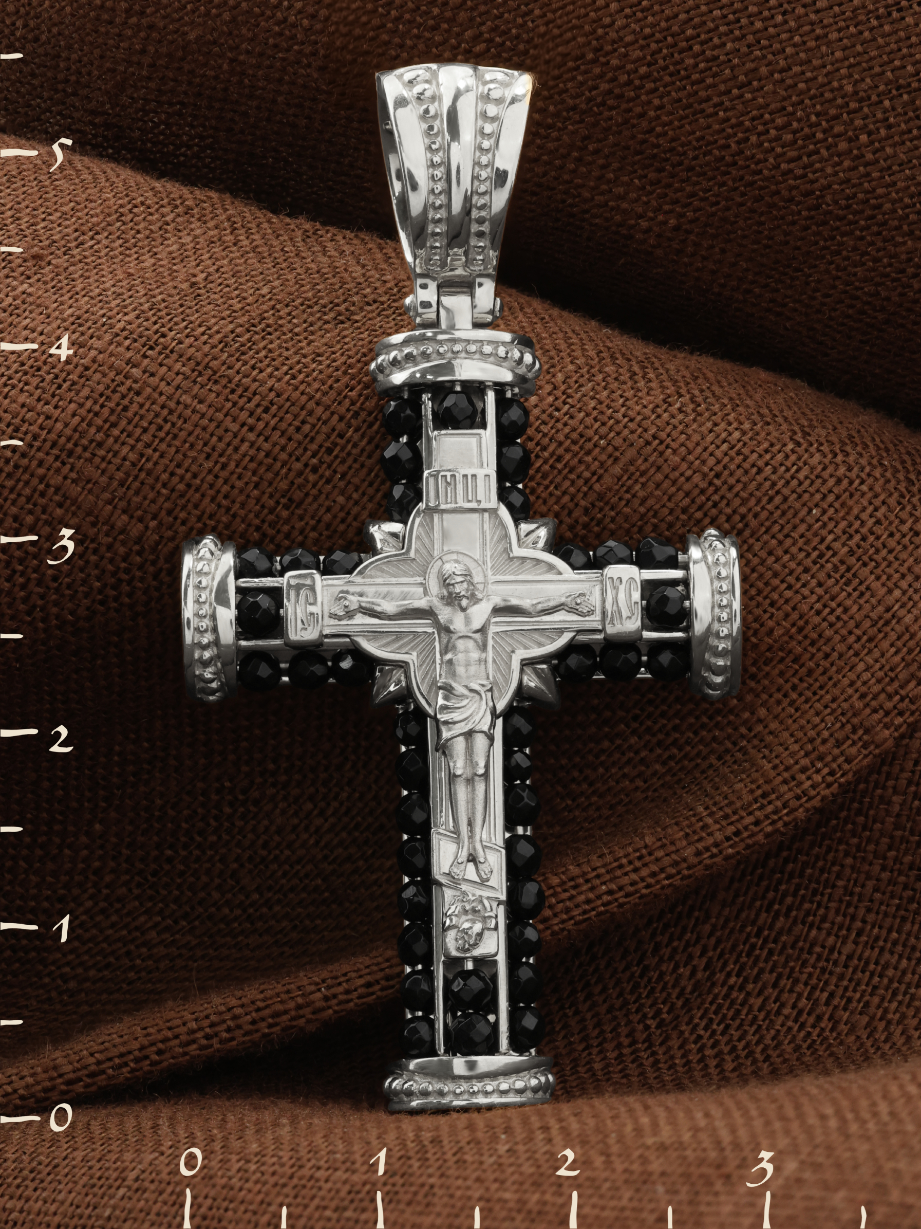 На лицевой стороне креста изображено Распятие Господа и Спасителя нашего Иисуса Христа. Своими крестными страданиями Господь смыл наши грехи, покрыл наш долг перед Богом или, на языке Писания, нас «искупил». В Голгофе сокрыта непостижимая тайна бесконечной правды и любви Бога. Крест стал символом победы добра над злом, жизни над смертью, напоминанием бесконечной Божьей любви, предметом радости. Воплотившийся Сын Божий Своею кровью освятил крест и сделал его проводником Своей благодати, источником освящения верующих. На верхней табличке, выше головы Иисуса, расположена надпись, составленная Понтием Пилатом — «IНЦI». Она означает «Иисус Назорей, Царь Иудейский». Надпись «IC» «ХC», означает Иисус Христос, помещаются на разных сторонах поперечной перекладины креста. Христос в Своей Божественной любви, над которой смерть не властна и которая, страдая, и не страдает в обычном смысле, простирает к людям со Креста Свои объятия, в которые призывается и привлекается весь мир. Поэтому Тело Его не висит, а торжественно покоится на Кресте.