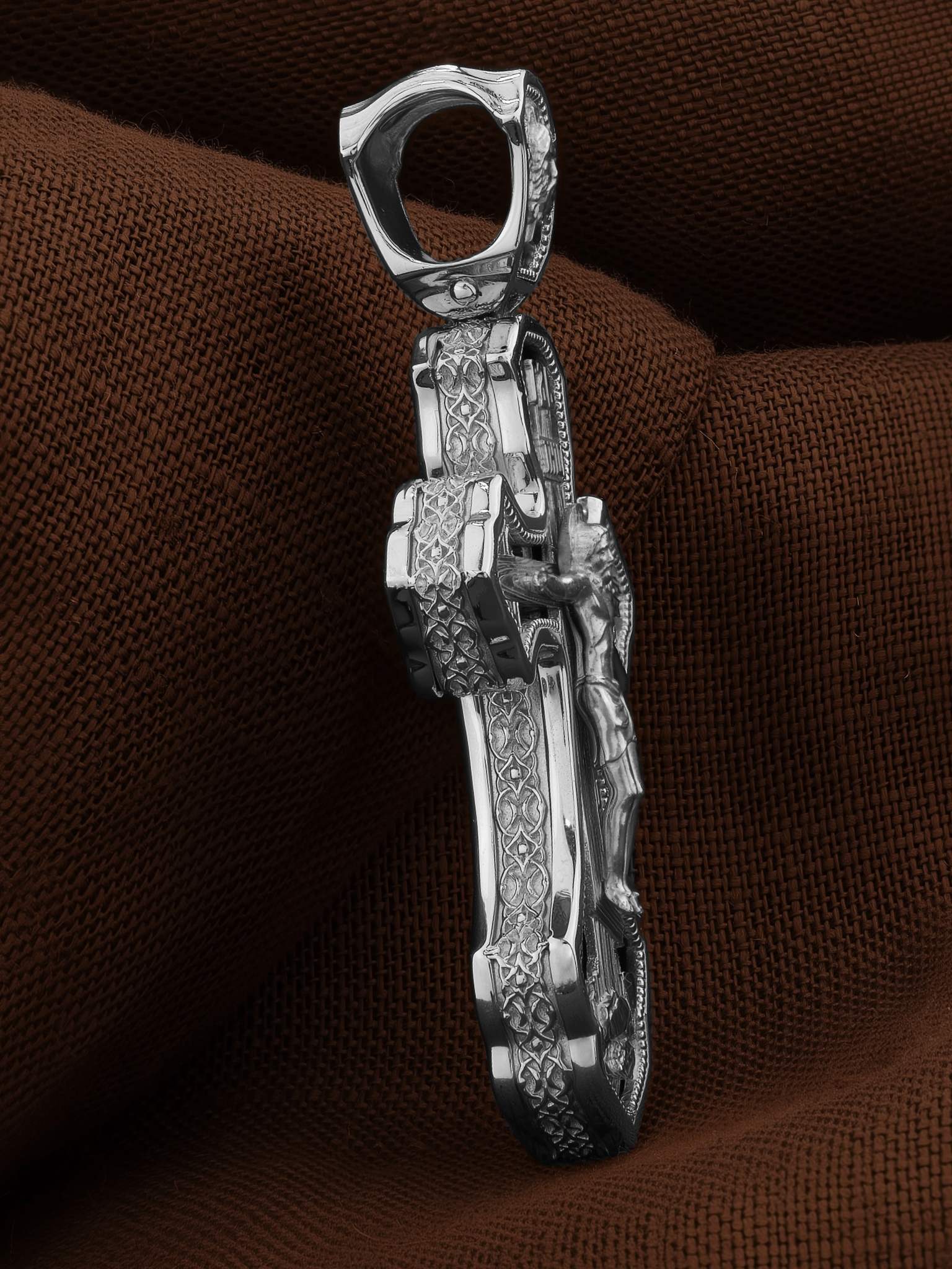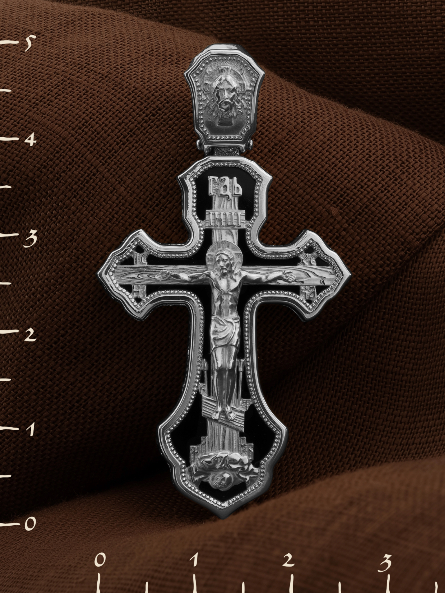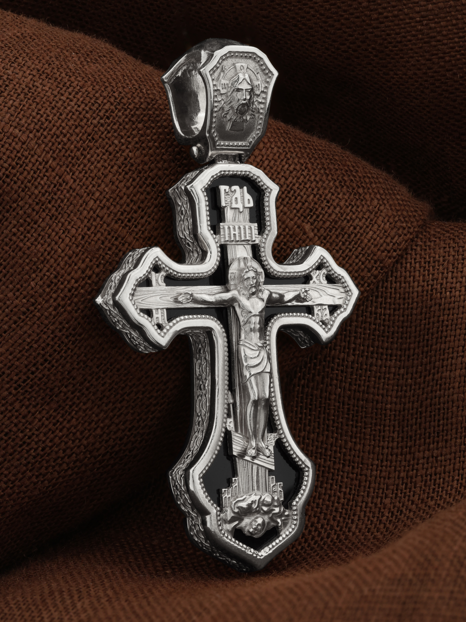 На лицевой стороне креста изображено Распятие Господа и Спасителя нашего Иисуса Христа. Христос, подвергнутый на кресте мучительной казни, своими страданиями искупил нас от древнего греха и даровал нам жизнь вечную. Без Распятия не было бы Воскресения Христова, и поэтому Крест из орудия казни обратился в святыню, в которой действует Благодать Божия. Распятие сопровождается каноническими надписями. Над Распятием размещена надпись «ГДЬ», что означает Господь. Верхняя перекладина символизирует титло — табличку, на которой, согласно Евангелию, расположена надпись, составленная Понтием Пилатом на трех языках — «IНЦI». Она означает «Иисус Назорей, Царь Иудейский». Надписи «IC» «ХC», что означает Иисус Христос, и «НИКА», что означает «победитель», помещаются на разных сторонах поперечной перекладины креста. Вдоль креста изображены копие сотника Лонгина и трость с губкой и буквы «К» и «Т». Надпись «МЛРБ» — «место лобное рай бысть», что означает место лобное стало раем, размещены в нижней части креста. Крест стоит на горе камней, символизирующих Голгофу. В ее основании различается череп — это голова Адама. На кулонном кольце изображен Нерукотворный образ Господа и Спасителя нашего Иисуса Христа, чудесно отпечатавшийся на плате, которым Христос вытер свой лик.