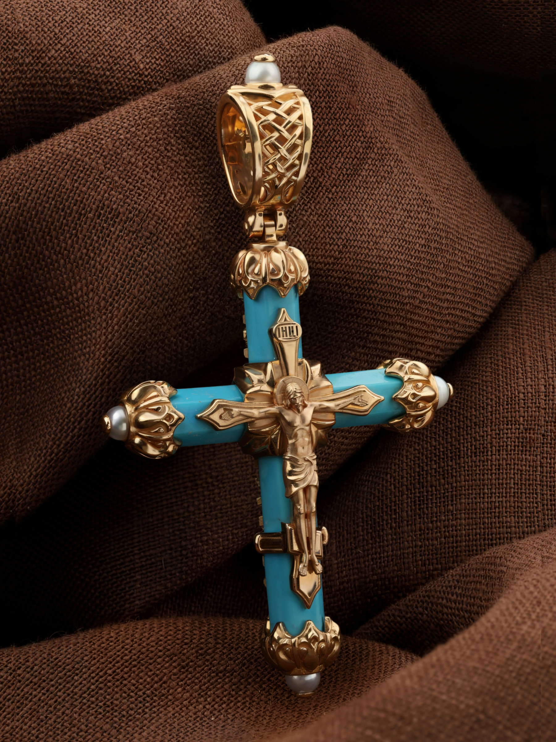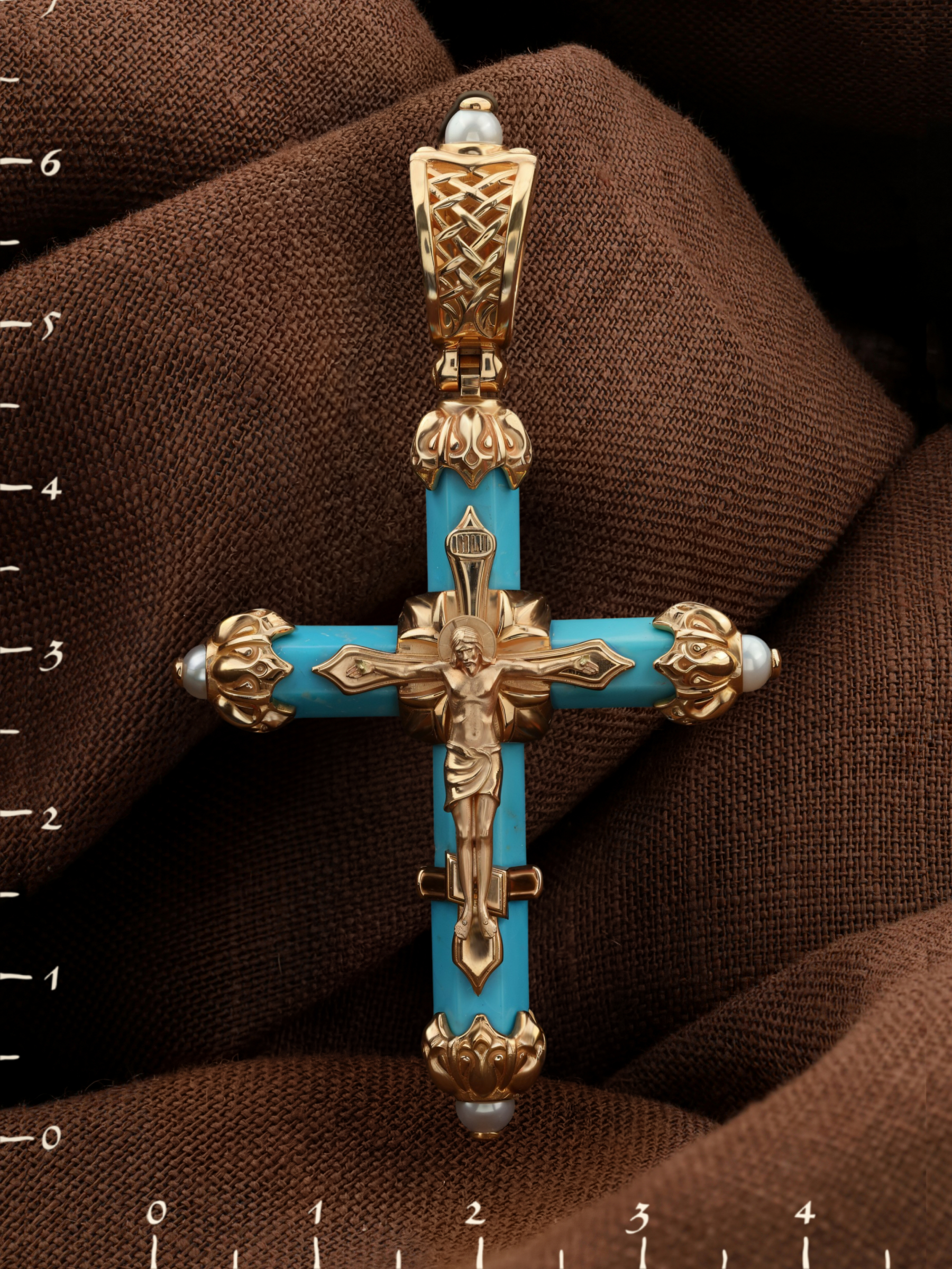 Крест из золота c жемчугом и бирюзой