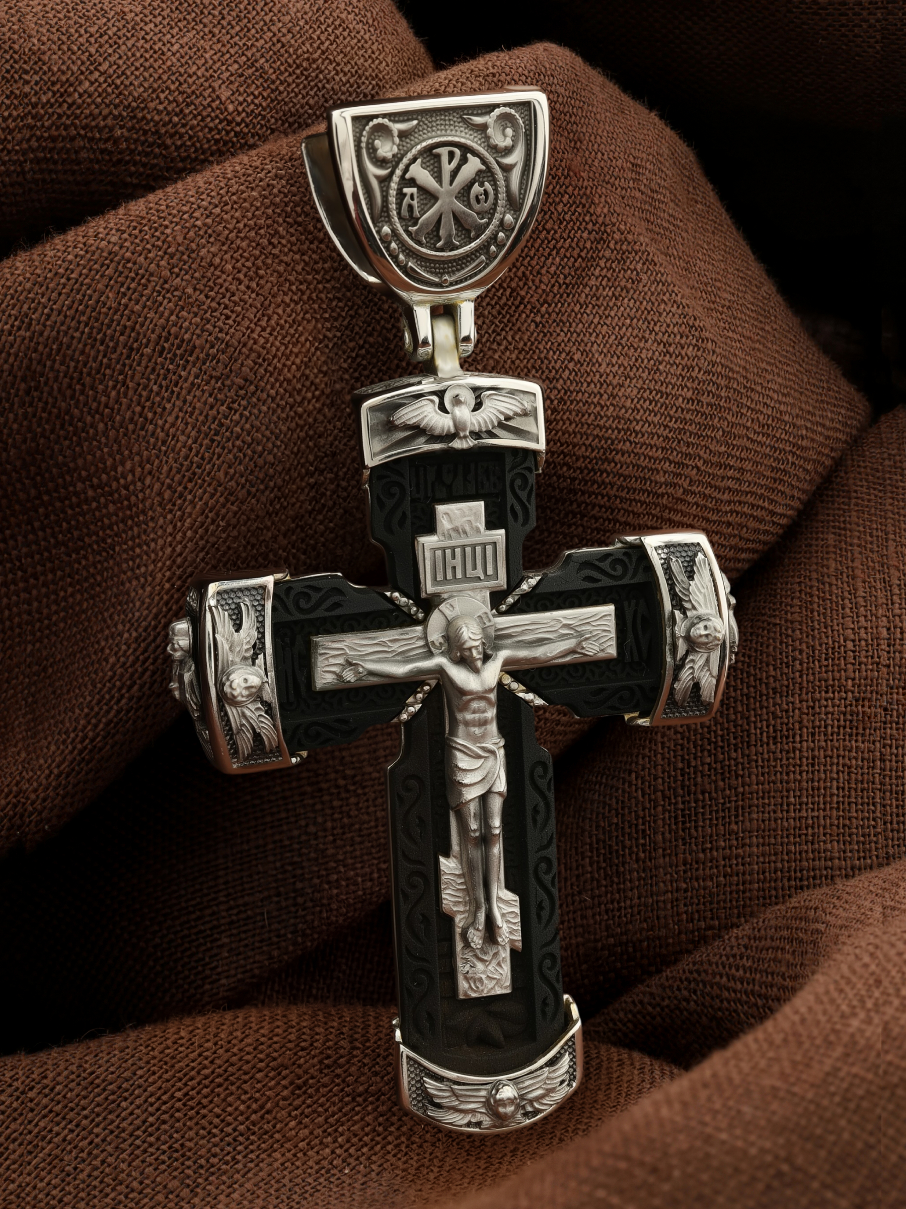 На лицевой стороне креста изображено Распятие, потому что это орудие казни Иисус Христос сделал орудием победы над грехом и смертью. Своими страданиями Он искупил грехи человечества, умерев и сошествовав во ад, победил сатану, освободил души праведников от вечной смерти и открыл им небесные врата рая. Жертва Христа сделала возможным спасение для каждого человека. На православном кресте Христос не умирает, а свободно простирает руки, ладони Иисуса открыты, будто он хочет обнять все человечество, даря им свою любовь и открывая путь к вечной жизни.