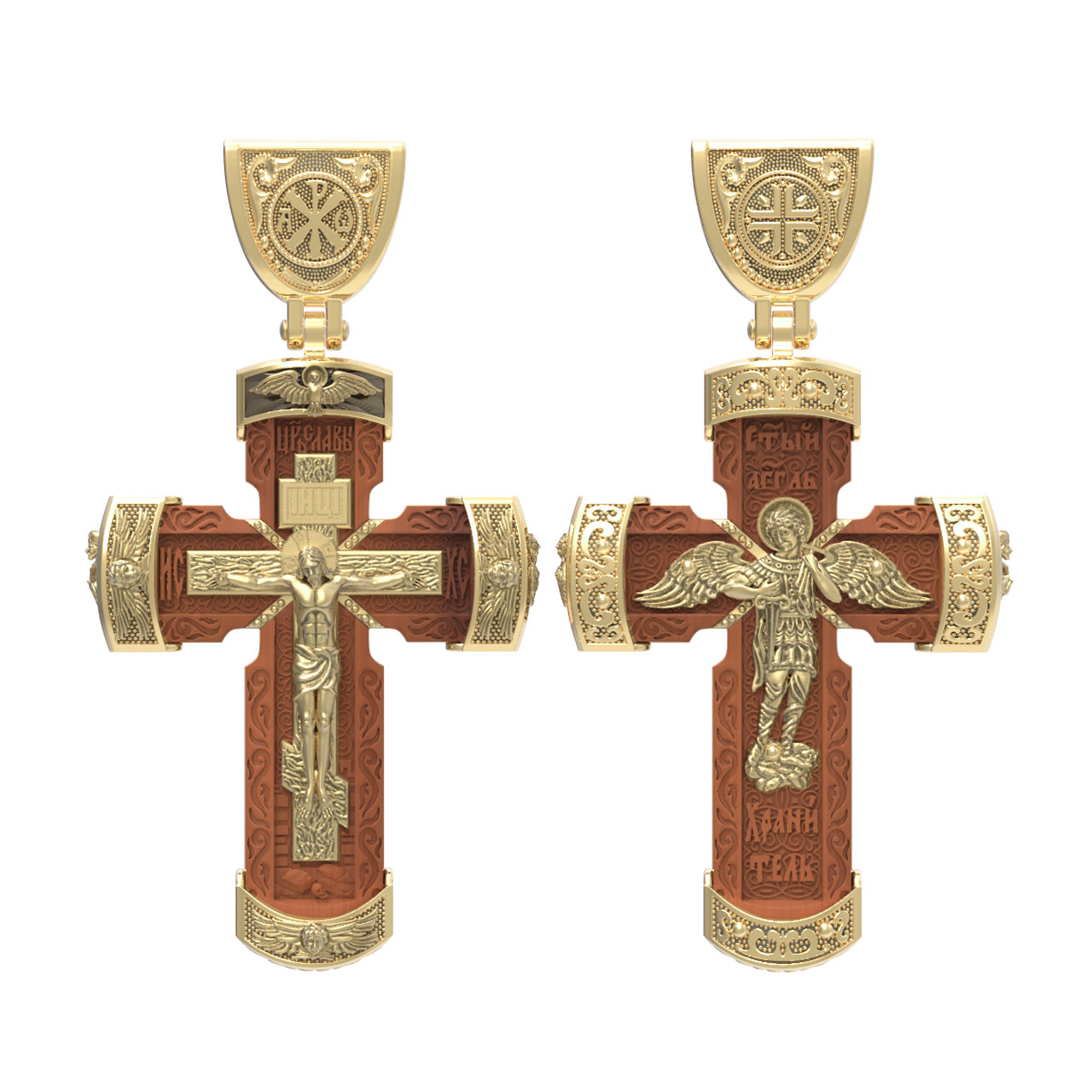 В центре оборота креста изображен Ангела Хранителя с традиционными атрибутами в руках: крестом, которым он осеняет человека, и мечом для прогнания бесов. По Православному учению, каждому, принявшему святое крещение, дается Господом Ангел Хранитель, который сопровождает человека всю его жизнь, помогая в добрых делах и охраняя от нападок злых духов. Святые отцы утверждают, что только верующий человек имеет рядом с собой Ангела Хранителя: «Тем, которые сподобились крещения и возносятся на высоту добродетелей, даны от Бога Ангелы, заботящиеся о них и содействующие им. В этом уверяет нас Господь, когда говорит, что есть Ангелы Хранители у всякого, кто верует в Него» (преп. Анастасий Синаит). Но Ангел Хранитель пребывает с христианином, если только мы не прогоним его греховными делами, поскольку «как дым разгоняет пчел, так и грех прогоняет от нас Ангела Хранителя» (свт. Василий Великий). Но и после завершения земного пути Ангел Хранитель не покидает христианина, а помогает душе преодолеть воздушные мытарства на пути в Царство Небесное.