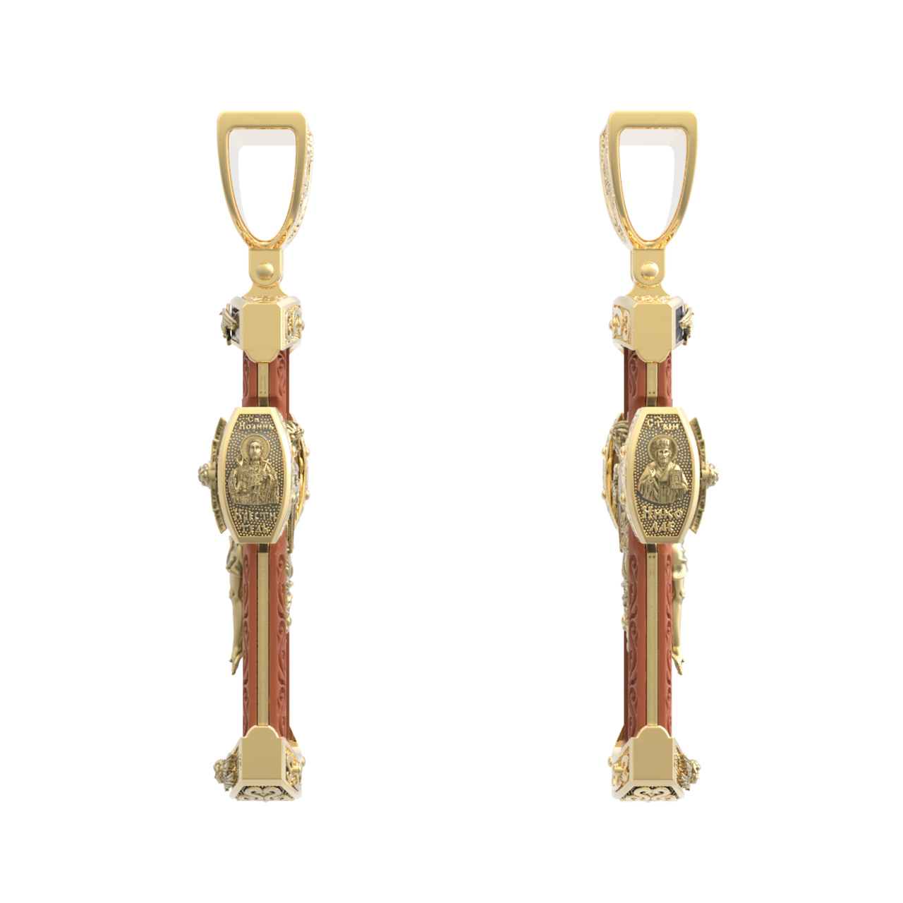 На торце изделия с левой стороны помещена икона Святого Николая Чудотворца — самый почитаемый в Православной Церкви, которого еще называют Николай Угодник за то, что он угодил своей жизнью Богу. Николай Чудотворец, помощник в делах, покровитель учащихся, утешитель обиженных и нуждающихся, целитель самых страшных и тяжелых недугов, предстатель и молитвенник за людей перед Богом. Также Святитель Николай Чудотворец известен своими молитвами за путешественников, когда непрестанный ветер и бушующие волны утихают и корабль заходит в спокойную гавань. На торце изделия с правой стороны — икона Святого Иоанна Крестителя. Святой Иоанн был последним пророком Израиля. Он призывал к покаянию, предвозвещая приближение Царствия Небесного (Мф. 3, 2), и удостоился стать Крестителем Христа. Иисус Христос говорит о нем: «Сей есть о котором написано: «Вот, Я посылаю Ангела Моего пред лицем Твоим, который приготовит путь Твой пред Тобою» (Лк. 7, 27). И еще: «Из рожденных женами нет ни одного пророка больше Иоанна Крестителя» (Лк. 7, 28).
