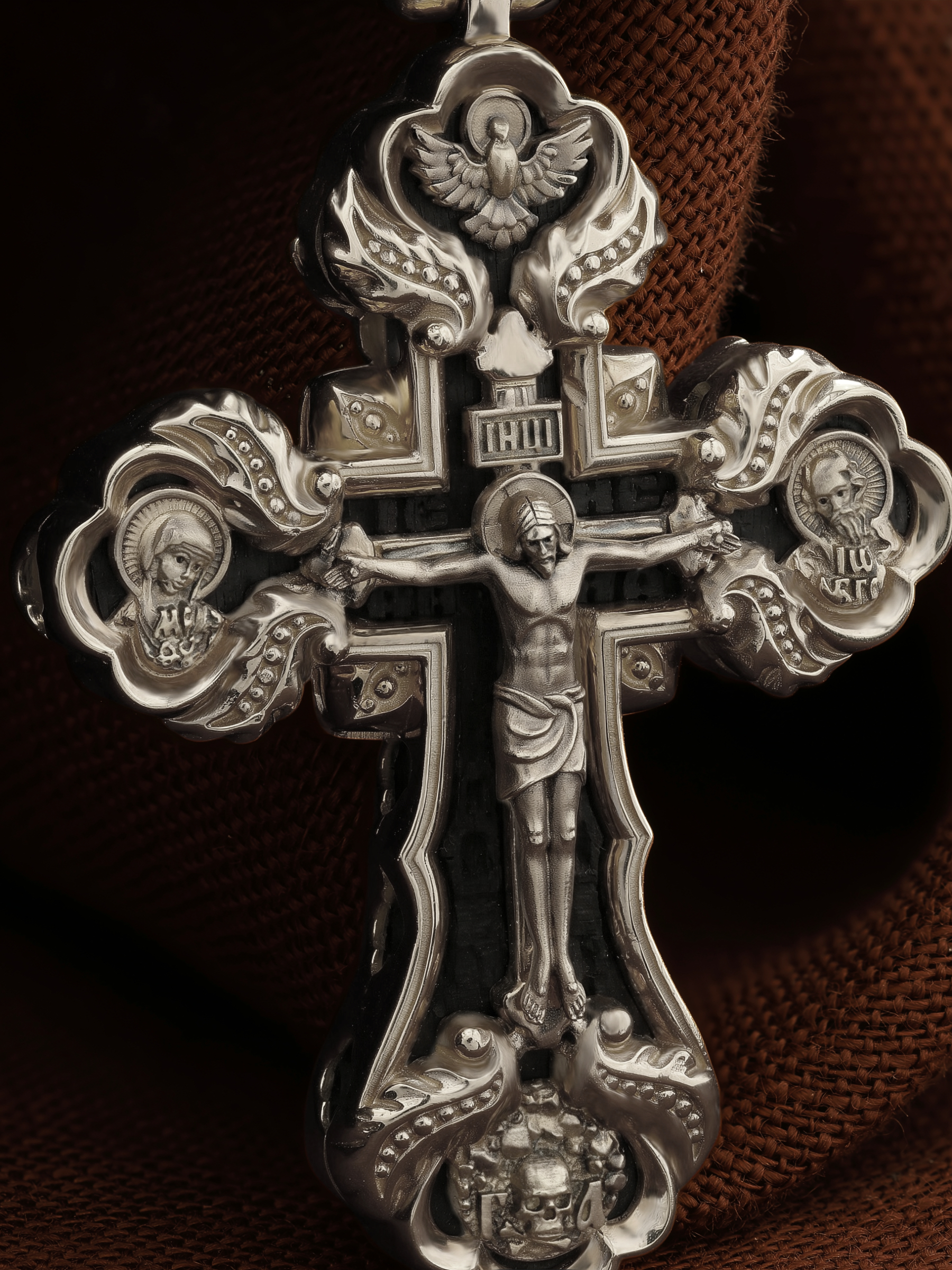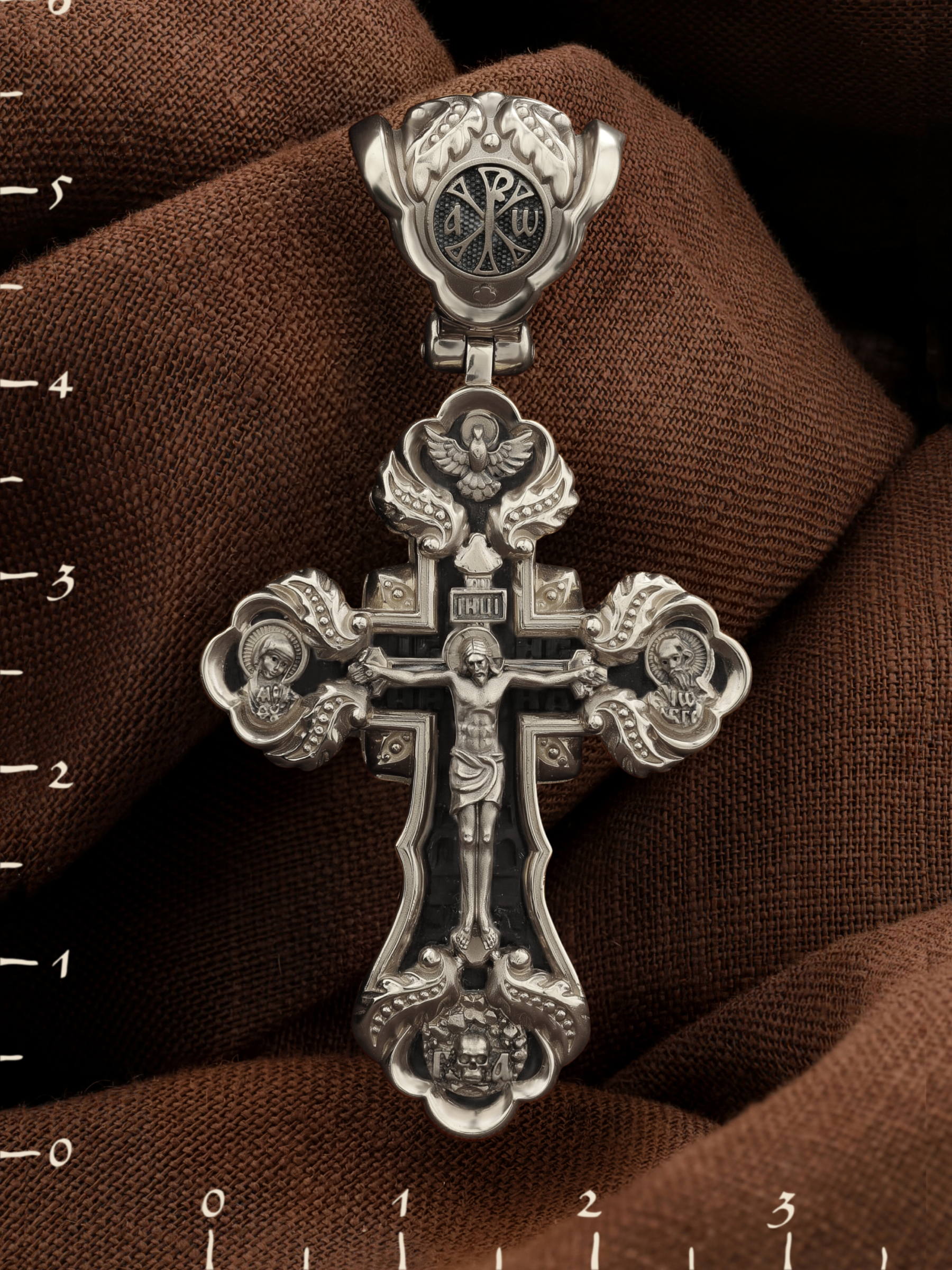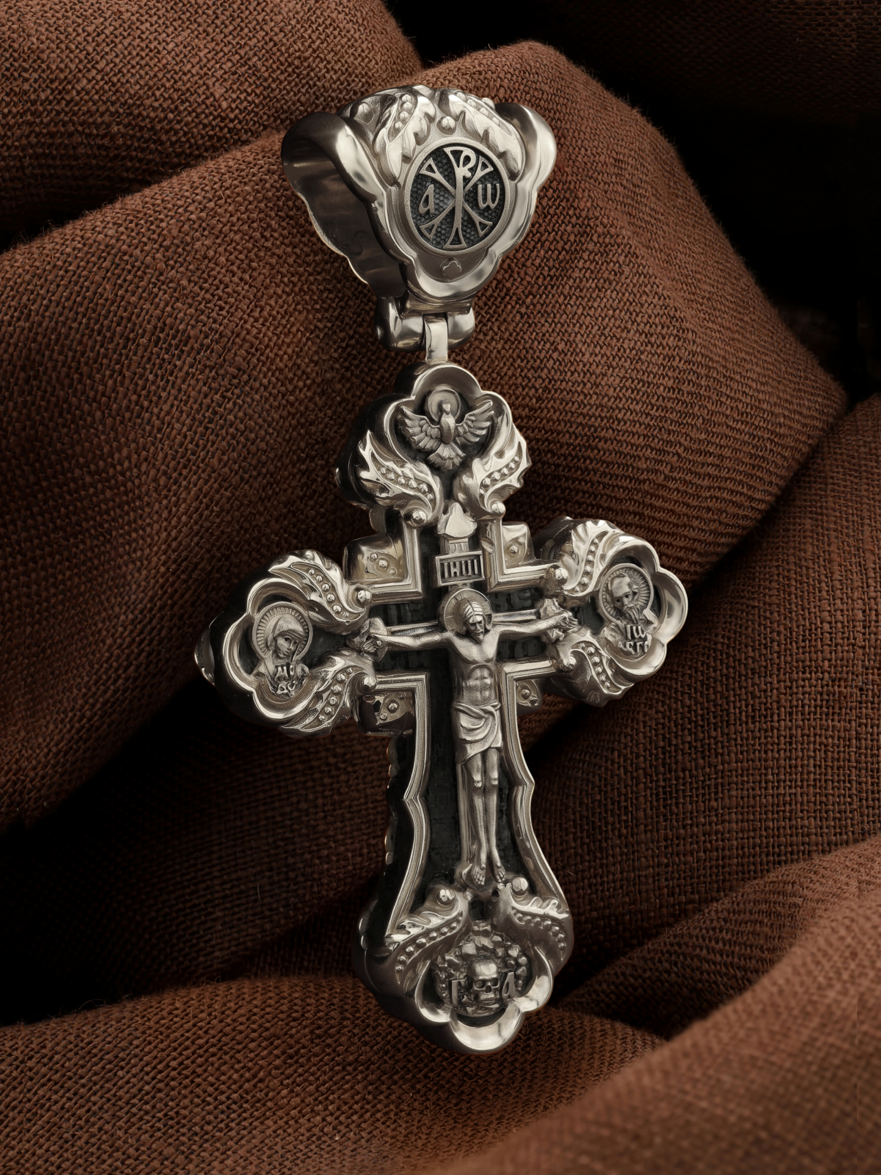 На лицевой стороне креста изображено Распятие Господа и Спасителя нашего Иисуса Христа. Крест- символ спасения и искупления рода человеческого, знамение победы над смертью и адом. Иисус Христос, как искупительная жертва освобождения человечества от власти греха, умер крестной смертью и в третий день воскрес. На верхней табличке, выше головы Иисуса, расположена надпись, составленная Понтием Пилатом — «ИНЦИ». Она означает «Иисус Назорей, Царь Иудейский». Над перекладиной написано сокращенно имя Спасителя «IC» «XC» — Иисус Христос. Ниже перекладины написано слово «НИКА» (греч. — Победитель). Крест стоит на горе камней, символизирующих Голгофу. В ее основании различается череп и надписи «Г.А.» — это голова Адама. Слева от Распятия помещен лик Пречистой Богородицы, скорой помощницы и заступницы рода Христианского. Слева изображен апостол и евангелист Иоанн Богослов, один из ближайших учеников Иисуса Христа. Над Распятием — изображение Духа Святого в виде голубя, сходящего с Небес. На кулонном кольце помещен крест.