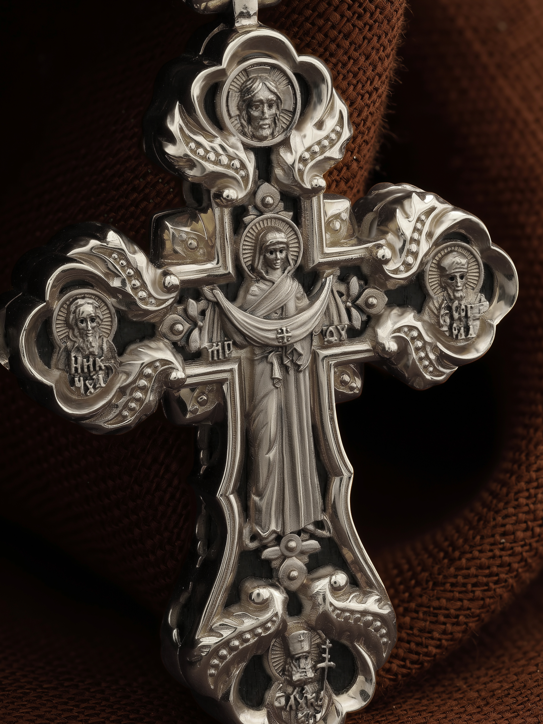 Центральную часть оборотной стороны креста украшает икона «Покров Пресвятой Богородицы». В руках Божьей Матери находится омофор, который она распростерла над людьми, покрывая их от всякого зла. Выше образа изображен Спас Нерукотворный, ниже — Святитель Лука (Войно-Ясенецкий). Слева от Распятия изображен Святитель Николай Чудотворец, архиепископ Мир Ликийских, справа — Преподобный Сергий, игумен Радонежский, Чудотворец. На кулонном кольце помещено изображение шестикрылого Серафима.