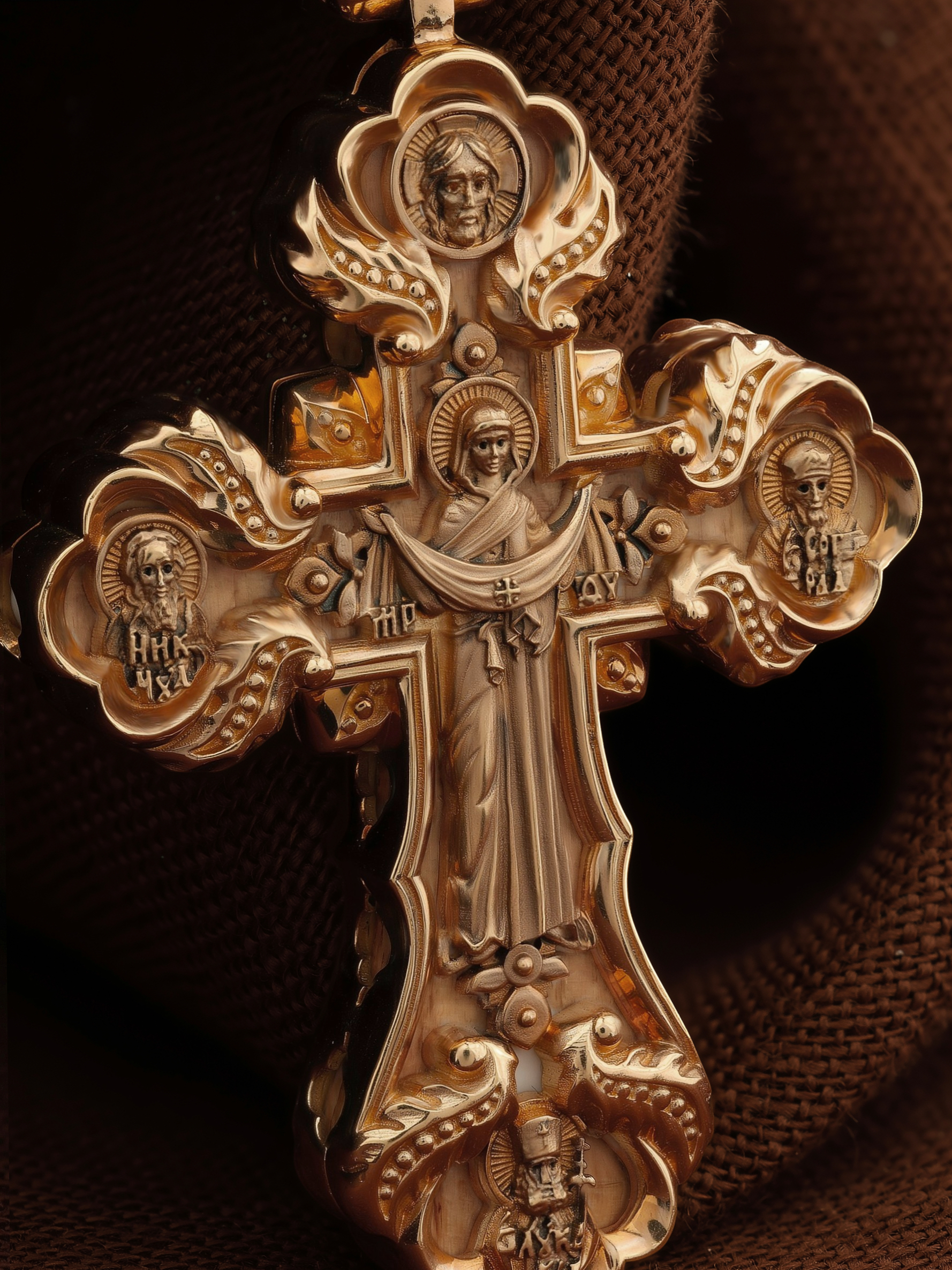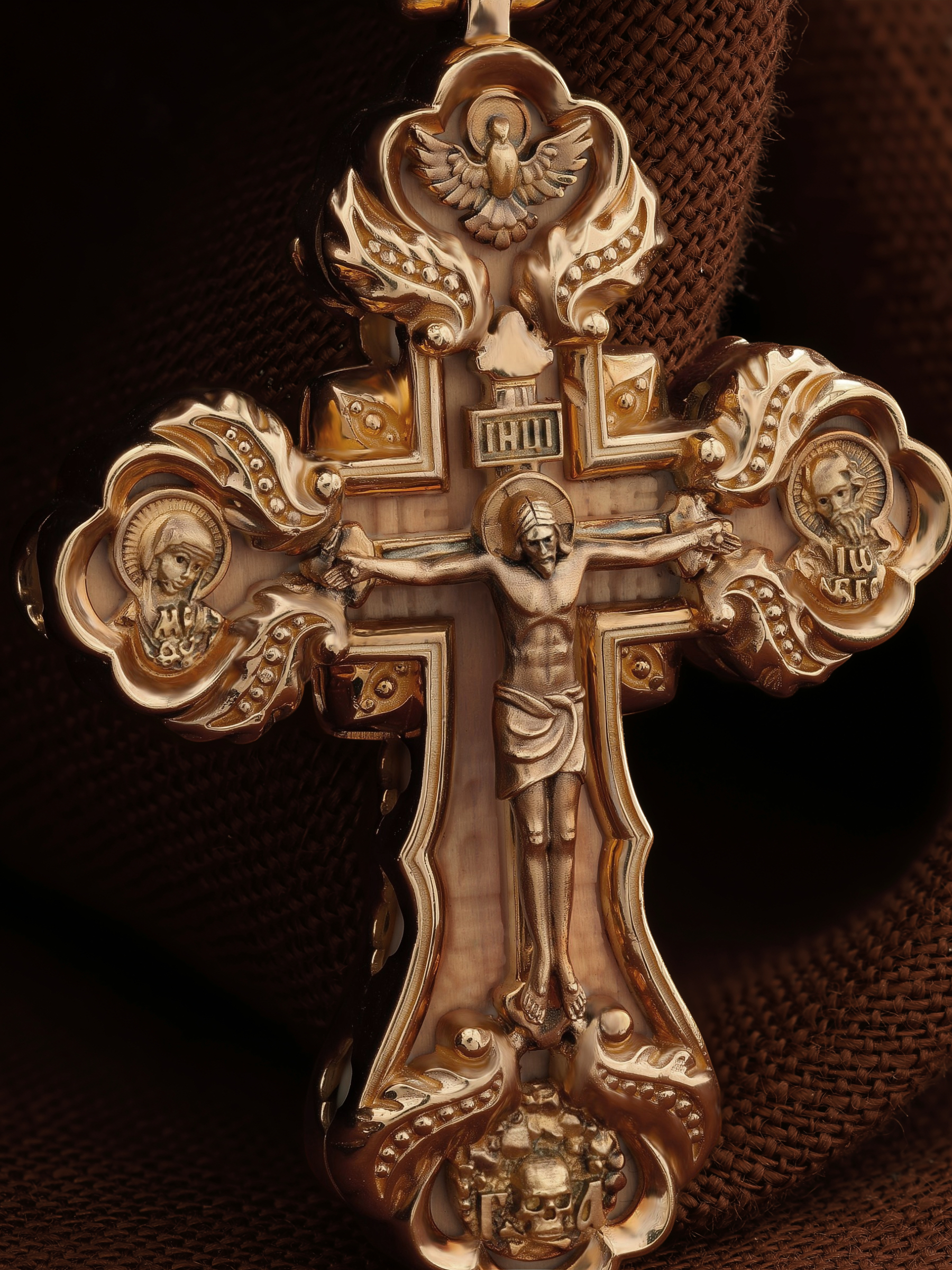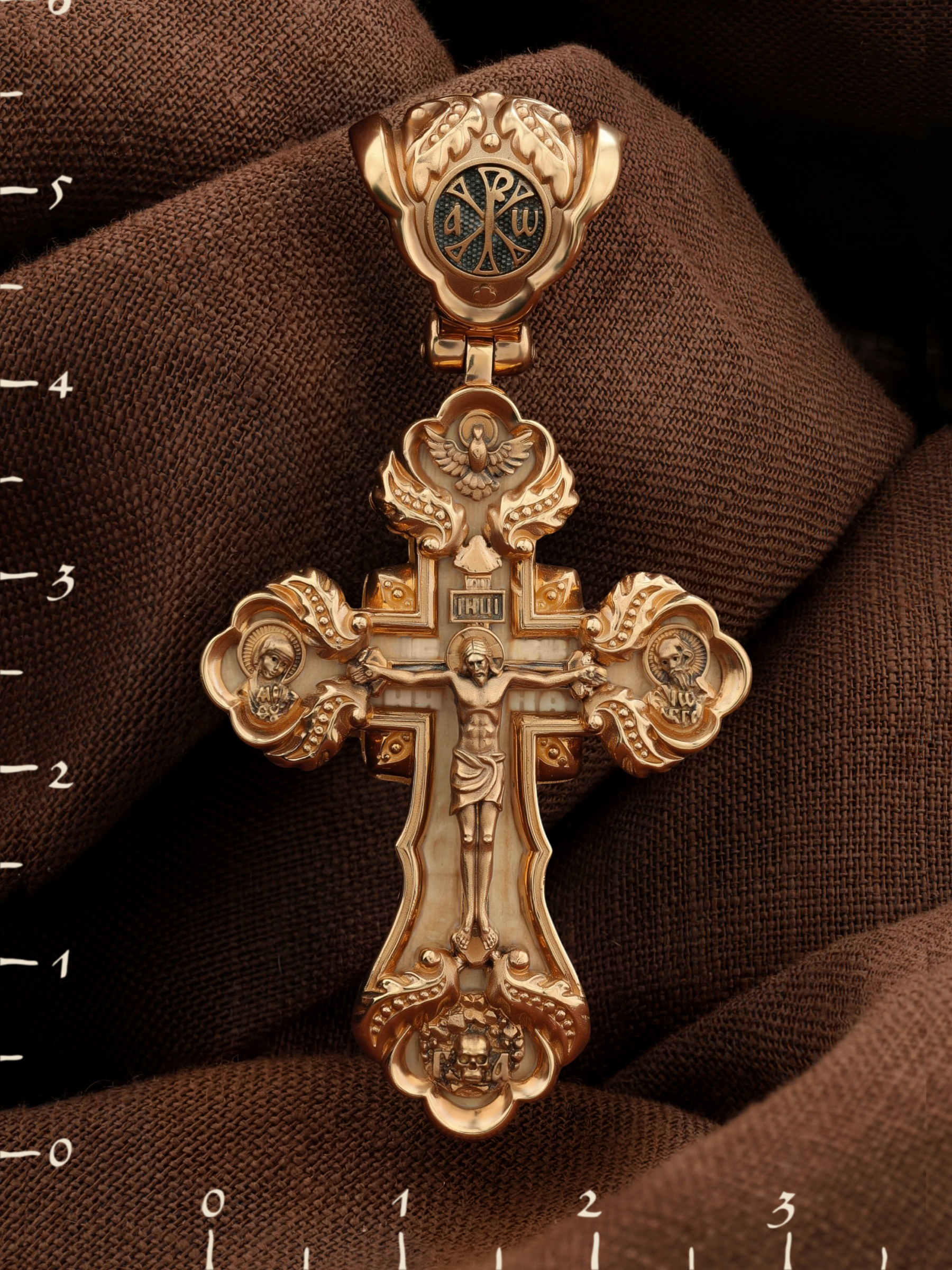 На лицевой стороне креста изображено Распятие Господа и Спасителя нашего Иисуса Христа. Крест- символ спасения и искупления рода человеческого, знамение победы над смертью и адом. Иисус Христос, как искупительная жертва освобождения человечества от власти греха, умер крестной смертью и в третий день воскрес. На верхней табличке, выше головы Иисуса, расположена надпись, составленная Понтием Пилатом — «ИНЦИ». Она означает «Иисус Назорей, Царь Иудейский». Над перекладиной написано сокращенно имя Спасителя «IC» «XC» — Иисус Христос. Ниже перекладины написано слово «НИКА» (греч. — Победитель). Крест стоит на горе камней, символизирующих Голгофу. В ее основании различается череп и надписи «Г.А.» — это голова Адама. Слева от Распятия помещен лик Пречистой Богородицы, скорой помощницы и заступницы рода Христианского. Слева изображен апостол и евангелист Иоанн Богослов, один из ближайших учеников Иисуса Христа. Над Распятием — изображение Духа Святого в виде голубя, сходящего с Небес. На кулонном кольце помещен крест.
