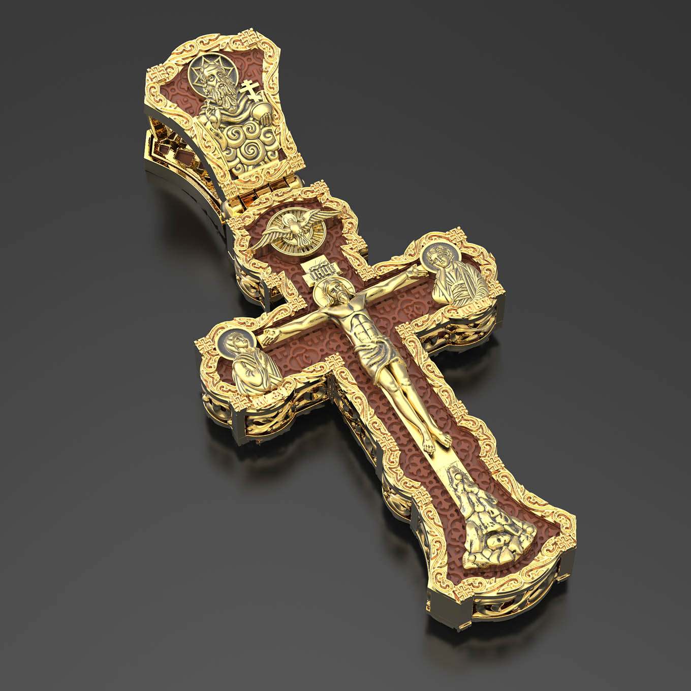 На лицевой стороне креста изображено Распятие Господа и Спасителя нашего Иисуса Христа. Христос, подвергнутый на кресте мучительной казни, своими страданиями искупил нас от древнего греха и даровал нам жизнь вечную. Без Распятия не было бы Воскресения Христова, и поэтому Крест из орудия казни обратился в святыню, в которой действует Благодать Божия. Через крестную жертву Бог раскрывает нам Свою безмерную любовь и призывает к ответной любви. На верхней табличке, выше головы Иисуса, расположена надпись, составленная Понтием Пилатом на трех языках — «IНЦI». Она означает «Иисус Назорей, Царь Иудейский». Надпись «IС ХС» означает Иисус Христос и помещается на разных сторонах поперечной (большой) перекладины креста. Крест стоит на горе камней, символизирующих Голгофу. В ее основании различается череп– это голова Адама. У Креста стоят оплакивающие Господа Божия Матерь и апостол Иоанн Богослов. Из всех апостолов об одном лишь Иоанне Богослове говорится, что он стоял на Голгофе у креста Спасителя, не заботясь о собственной безопасности. Он услышал обращенные к Ней с высоты Креста слова Распятого Господа: «Жено, се сын Твой» и к нему: «Се Мати твоя». С этого времени Иоанн взял Матерь Божию к себе, и Она жила в его доме до самой смерти. Над Распятием — изображение Духа Святого в виде голубя, сходящего с Небес. На кулонном кольце изображен Бог Отец.