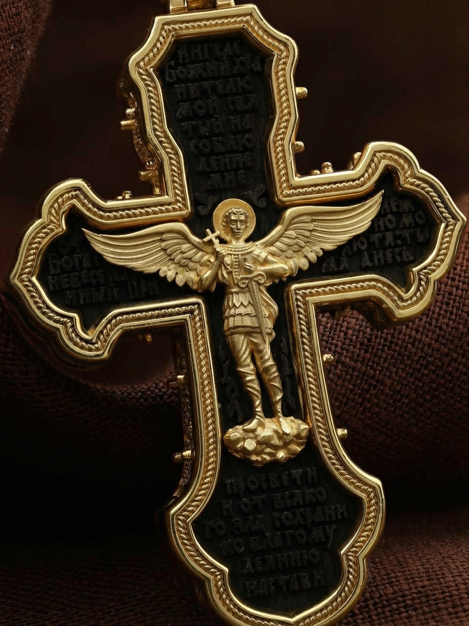 В центре оборотной стороне креста изображен Святой Агнгел-Хранитель в виде юноши держащего в правой руке крест, а в левой — мечь. Агнгел-Хранитель — это Ангел приставляемый Богом к человеку при крещении для охраны и помощи в добрых делах. Он невидимо находится при человеке на протяжении всей его жизни, если человек сохраняет в себе любовь к Богу и истинную веру перед Ним. По сторонам от изображения помещена молитва: «Ангеле Божий, хранителю мой святый, на соблюдение мне от Бога с небесе данный! Прилежно молю тя: ты мя днесь просвети, и от всякаго зла сохрани, ко благому деянию настави…». На кулонном кольце изображена икона Божией Матери «Покров Пресвятой Богородицы».