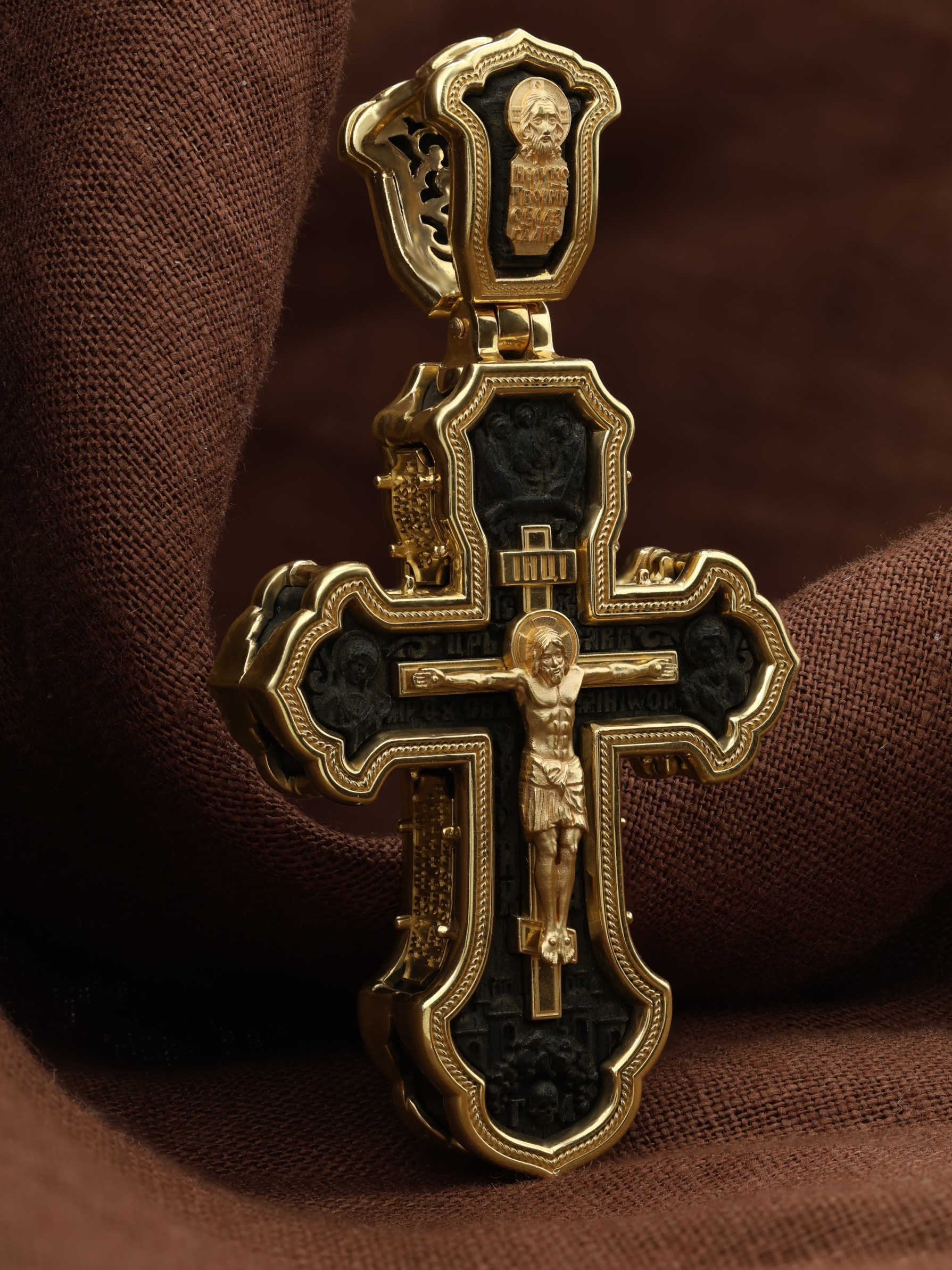 На лицевой стороне креста изображено Распятие Господа и Спасителя нашего Иисуса Христа, отдавшего Себя на смерть, чтобы другие могли жить — жить вечной жизнью, жить с Богом. Через крестную жертву Бог раскрывает нам Свою безмерную любовь и призывает к ответной любви. Своею кровью Господь освятил крест и сделал его проводником Своей благодати, источником освящения верующих. На верхней табличке, выше головы Иисуса, расположена надпись, составленная Понтием Пилатом — «IНЦI». Она означает «Иисус Назорей, Царь Иудейский». Распятие сопровождается каноническими надписями. Надпись «IС» « ХС» означает Иисус Христос и помещается над Распятием. Надпись «Царь Славы» помещается на разных сторонах поперечной (большой) перекладины креста. Ниже расположены надпись «Сын Божий» и слово «НИКА», что означает «победитель». Слева от Распятия изображена Пресвятая Богородица, Справа изображен Пророк Предтеча и Креститель Господень Иоанн. За Распятием высится Иерусалимская стена, в знак того, что Господь был распят вне стен города. Возвышение, на котором стоит Крест, символизирует гору Голгофу, на которой произошло Распятие. Под подножием Креста изображена покоящаяся голова (череп) Адама и надпись «Г.А.». Над распятием помещено изображение иконы Святой Троицы в виде трех ангелов. На кулонном кольце изображен Нерукотворный образ Господа и Спасителя нашего Иисуса Христа, чудесно отпечатавшийся на плате, котором Христос вытер свой лик.