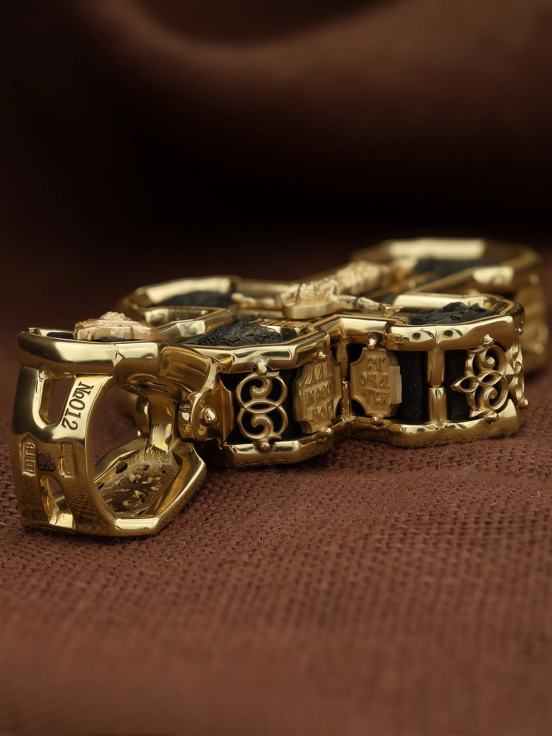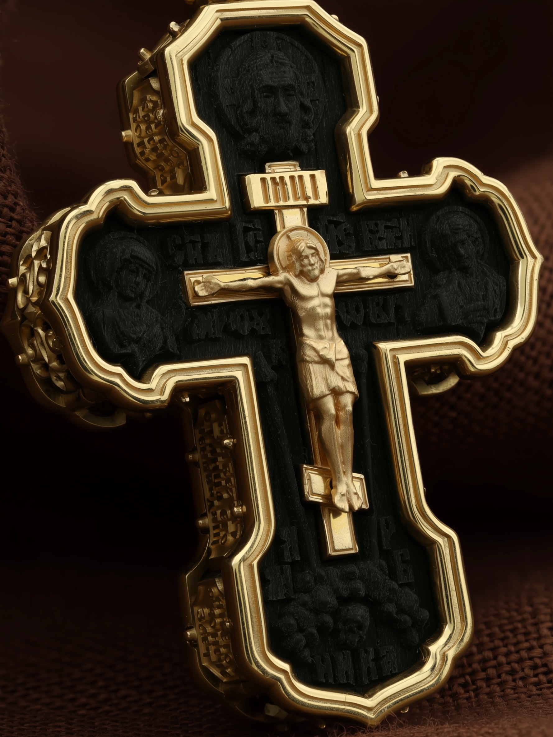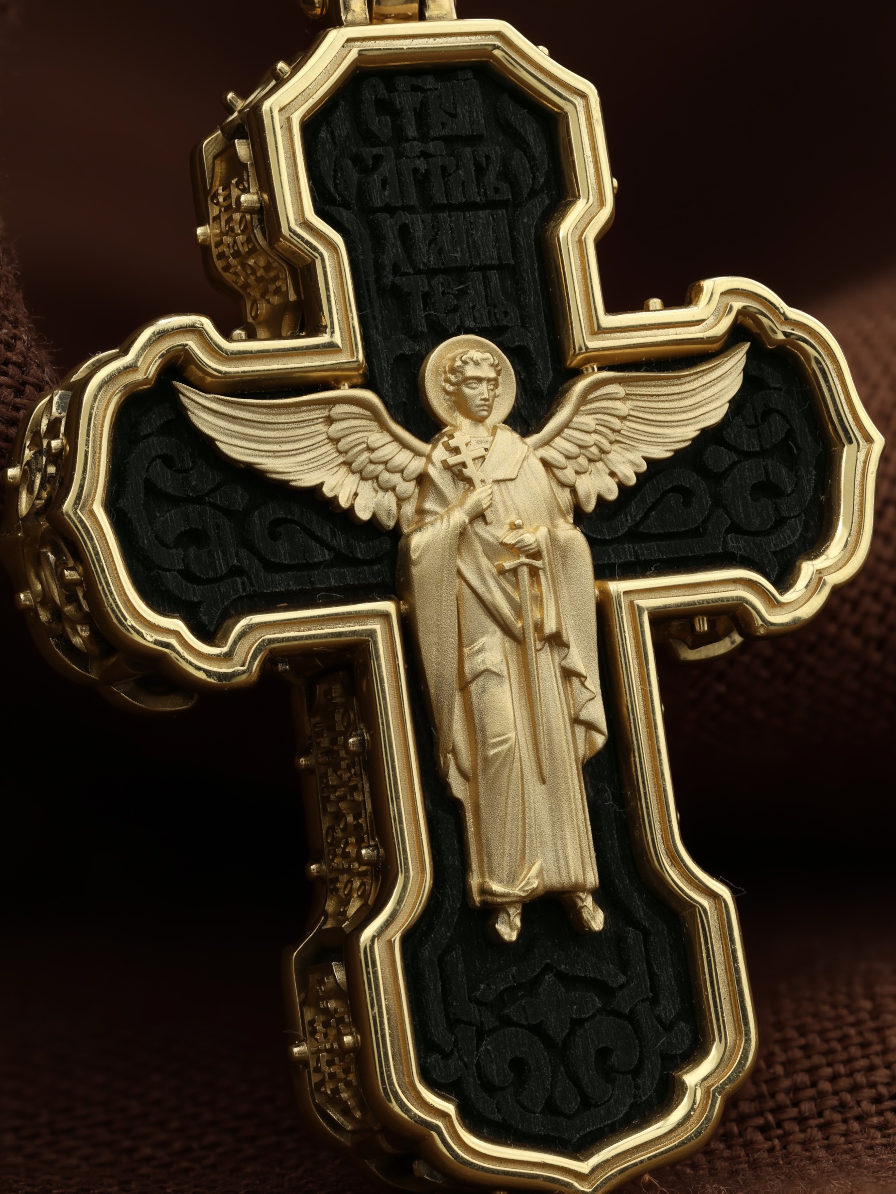 На лицевой стороне креста изображено Распятие Господа и Спасителя нашего Иисуса Христа. Крест- символ спасения и искупления рода человеческого, знамение победы над смертью и адом. Иисус Христос, как искупительная жертва освобождения человечества от власти греха, умер крестной смертью и в третий день воскрес. На верхней табличке, выше головы Иисуса, расположена надпись, составленная Понтием Пилатом — «IНЦI». Она означает «Иисус Назорей, Царь Иудейский». Надпись «IС» « ХС» означает Иисус Христос и помещается на разных сторонах поперечной (большой) перекладины креста. Рядом расположена надпись «Сын Божий». Выше Распятия изображен Нерукотворный образ Господа и Спасителя нашего Иисуса Христа. Слева от Распятия изображена Пресвятая Богородица, справа — апостол и евангелист Иоанн Богослов, один из ближайших учеников Иисуса Христа. Крест стоит на горе камней, символизирующих Голгофу. В ее основании различается череп — это голова Адама. Вдоль креста изображены копие сотника Лонгина и трость с губкой и буквы «К» и «Т». Надпись «МЛРБ» — «место лобное рай бысть» означает, что место лобное стало раем и помещаются в нижней части креста. Рядом — слово «НИКА», что означает «победитель». На православном кресте Христос не умирает, а свободно простирает руки, ладони Иисуса открыты, будто он хочет обнять все человечество, даря им свою любовь и открывая путь к вечной жизни. На кулонном кольце изображен шестикрылый Серафим.