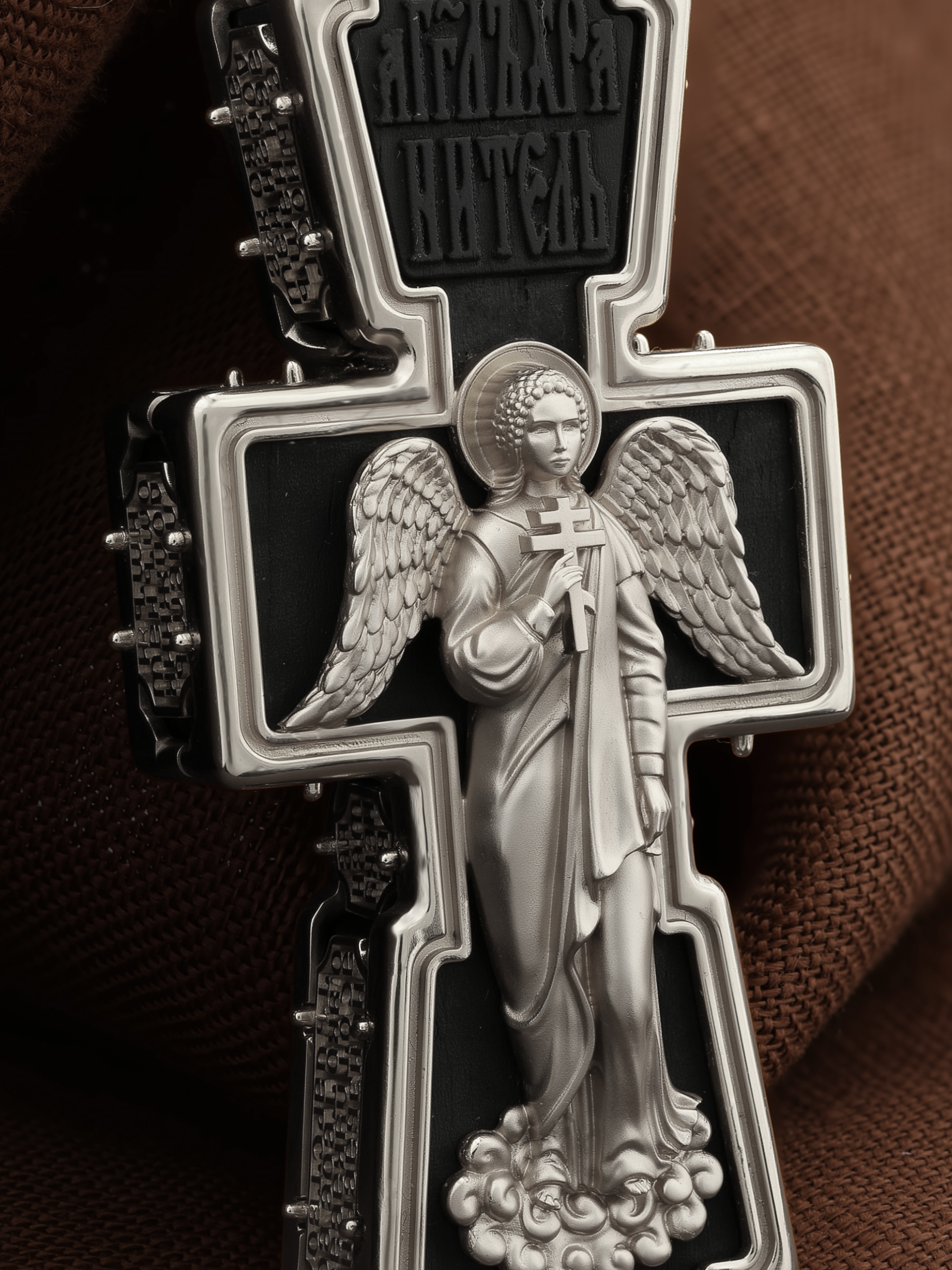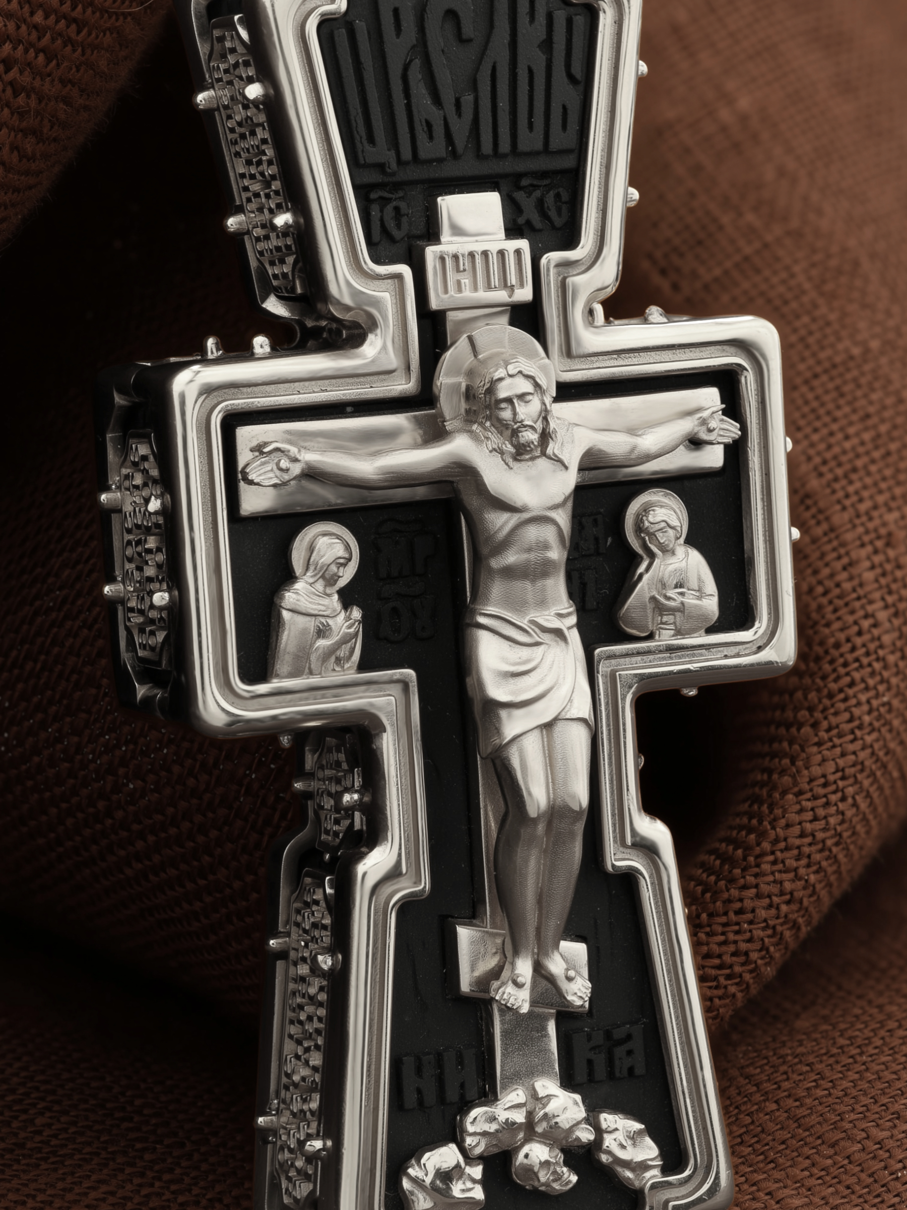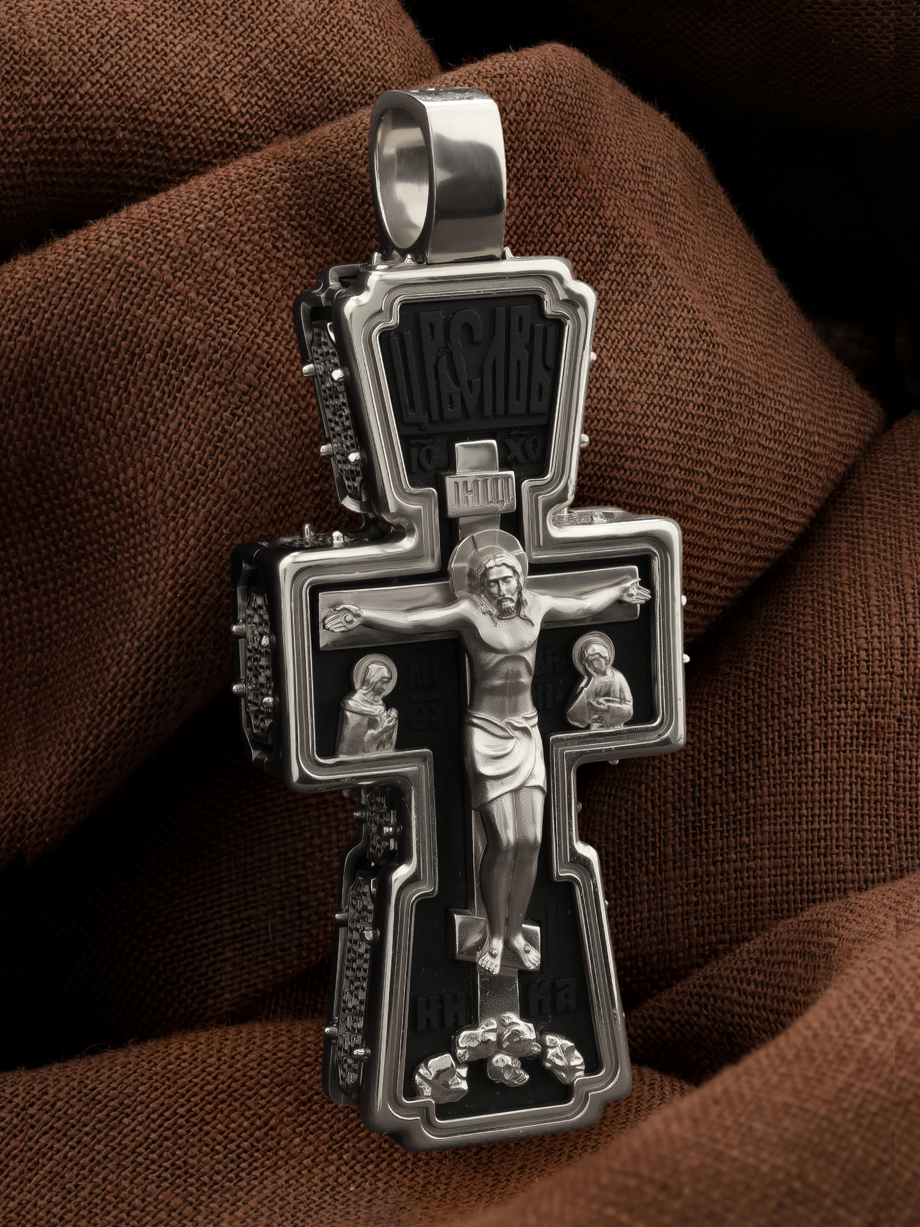 На лицевой стороне креста изображено Распятие Господа и Спасителя нашего Иисуса Христа. В Голгофе сокрыта непостижимая тайна бесконечной правды и любви Бога. Крест стал символом победы добра над злом, жизни над смертью, напоминанием бесконечной Божьей любви, предметом радости. Воплотившийся Сын Божий Своею кровью освятил крест и сделал его проводником Своей благодати, источником освящения верующих. Господь сказал: кто хочет идти за Мною, отвергнись себя, и возьми крест свой, и следуй за Мною. (Мк. 8: 34). Над Распятием помещена надпись «Царь Славы». Ниже расположена надпись «IC» «ХC», означает Иисус Христос. Слева от Распятия изображена Пресвятая Богородица, справа — апостол и евангелист Иоанн Богослов, один из ближайших учеников Иисуса Христа. В нижней части креста помещено слово «НИКА», что означает «победитель». Крест стоит на горе камней, символизирующих Голгофу. В ее основании различается череп — это голова Адама.