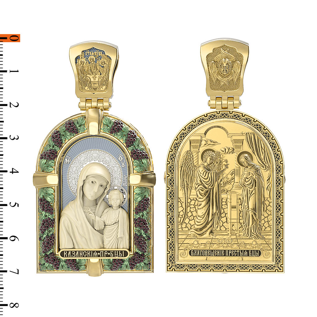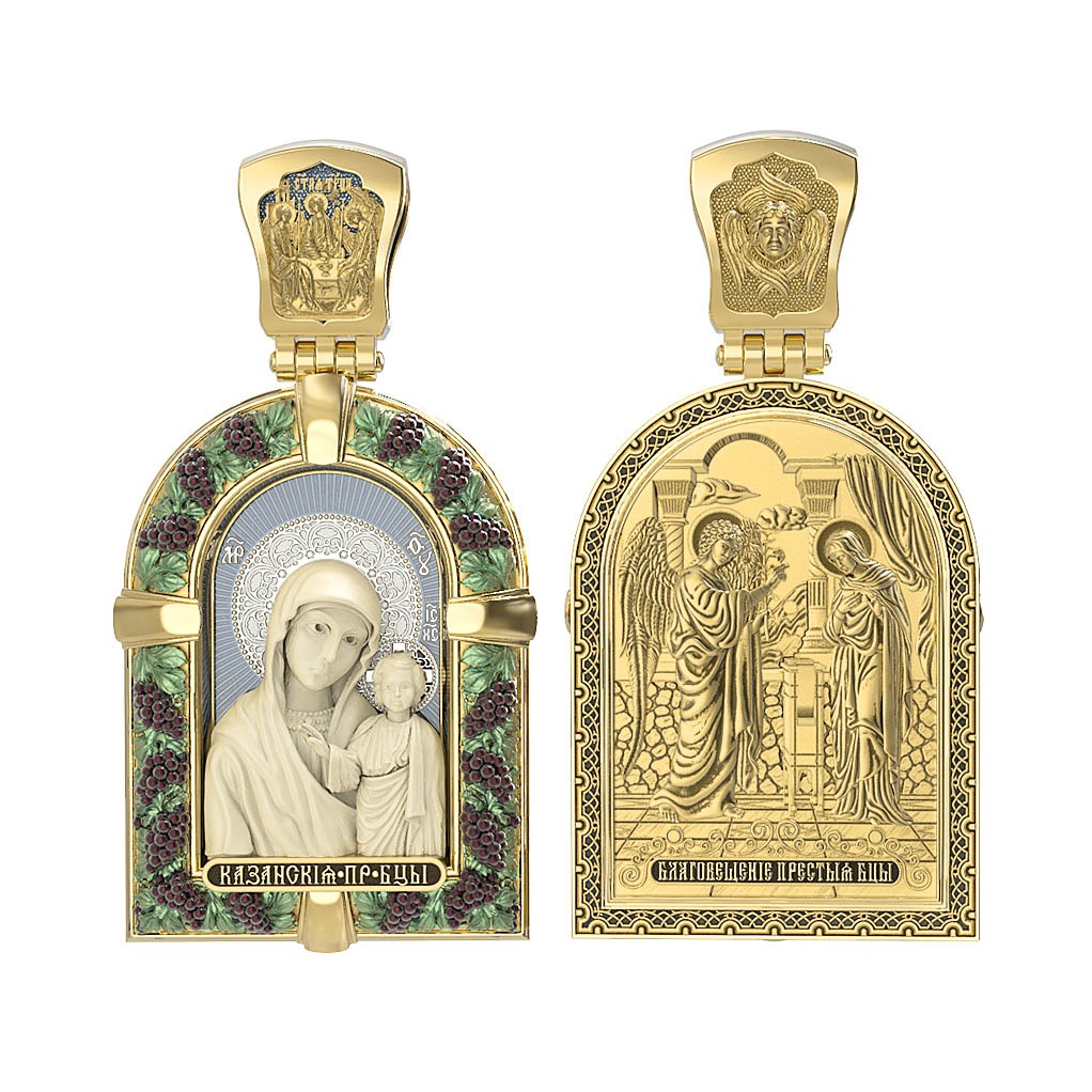 Казанская икона Божией Матери — одна из самых почитаемых в России чудотворных икон Богородицы. Богословское значение Казанской иконы — указать верующим истинный Путь к спасению, который лежит через Христа. Только Божия Матерь имеет настолько сильное дерзновение к Спасителю, что может ходатайствовать перед Ним за всех верных. Именно этот образ дарится новой повенчанной паре, как хранитель очага и семейная реликвия. Молитва перед Казанской иконой Божьей Матери помогает во всех сложных случаях жизни, в болезнях, во всех печалях, невзгодах, скорбях. Уникальная история появления, чудеса, случившиеся по молитвам православных людей возле образа — все это делает Казанскую Богородицу особенной, среди тысяч других икон. Вверху — икона Святой Троицы, на которой запечатлено явление Триединого Бога праотцу Аврааму в виде трех ангелов. Образок обвивает виноградная лоза — один из самых распространенных символических образов христианства. Она является символом Иисуса Христа, Который в Евангелии говорит о Себе: «Я есмь истинная виноградная лоза, и Отец мой — виноградарь». (Ин. 15:1). Поэтому именно из винограда изготавливается вино для Причастия, призванное символизировать Кровь Христову.