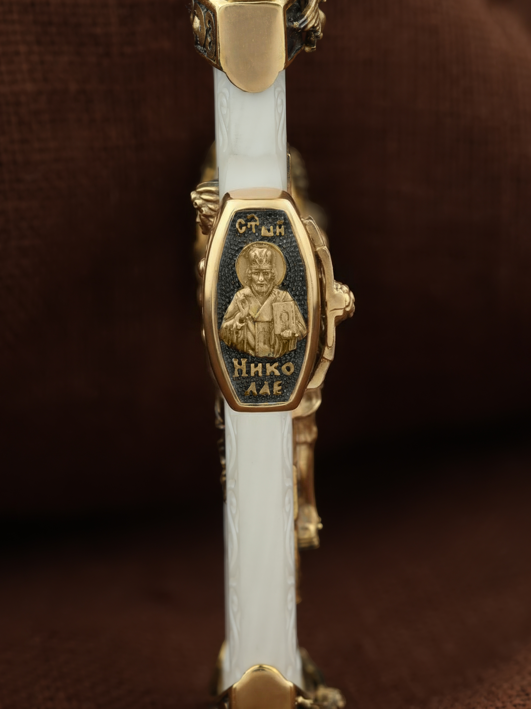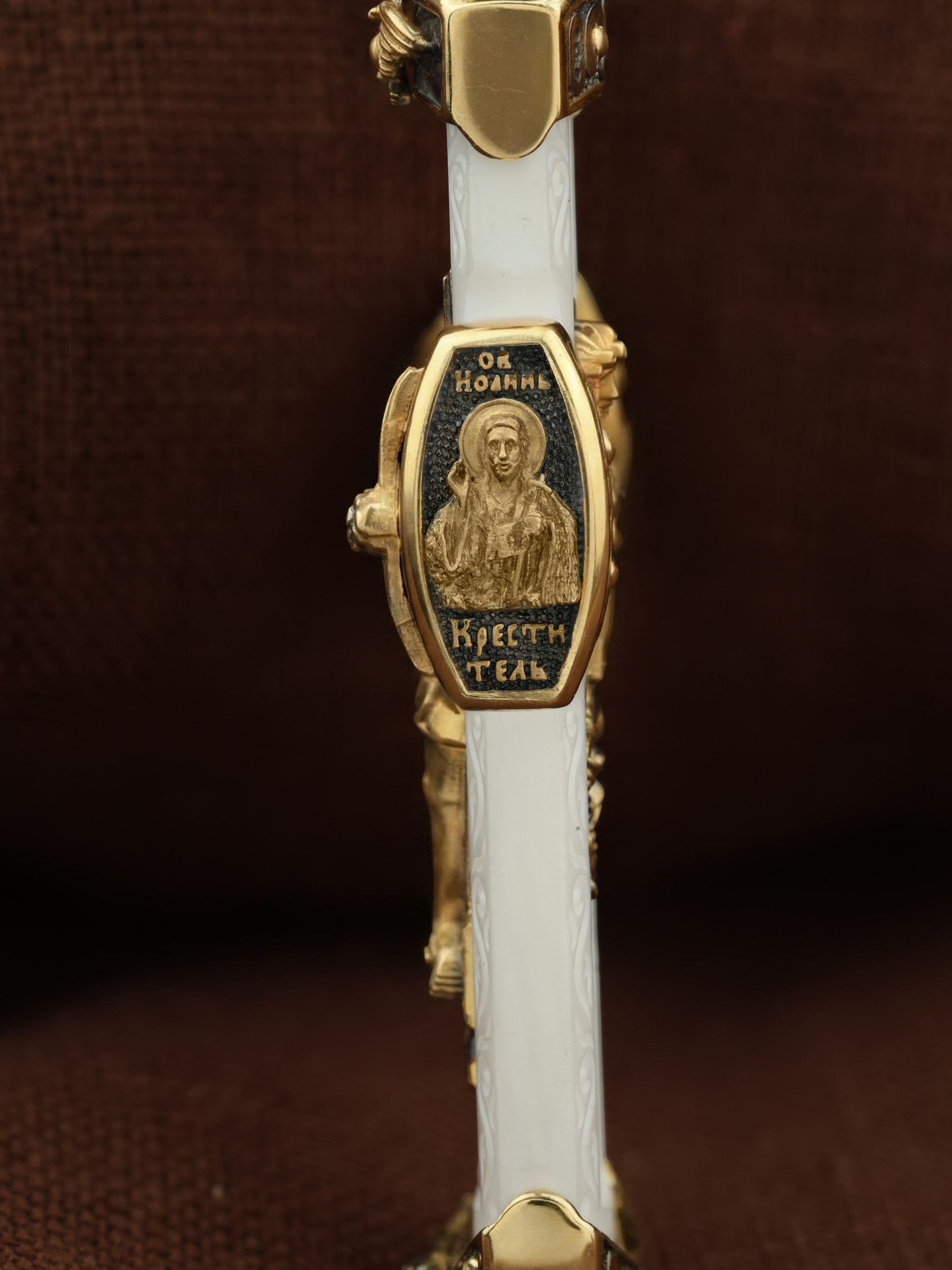 На торце изделия с левой стороны помещена икона Святого Николая Чудотворца — самый почитаемый в Православной Церкви, которого еще называют Николай Угодник за то, что он угодил своей жизнью Богу. Николай Чудотворец, помощник в делах, покровитель учащихся, утешитель обиженных и нуждающихся, целитель самых страшных и тяжелых недугов, предстатель и молитвенник за людей перед Богом. Также Святитель Николай Чудотворец известен своими молитвами за путешественников, когда непрестанный ветер и бушующие волны утихают и корабль заходит в спокойную гавань. На торце изделия с правой стороны — икона Святого Иоанна Крестителя. Святой Иоанн был последним пророком Израиля. Он призывал к покаянию, предвозвещая приближение Царствия Небесного (Мф. 3, 2), и удостоился стать Крестителем Христа. Иисус Христос говорит о нем: «Сей есть о котором написано: «Вот, Я посылаю Ангела Моего пред лицем Твоим, который приготовит путь Твой пред Тобою» (Лк. 7, 27). И еще: «Из рожденных женами нет ни одного пророка больше Иоанна Крестителя» (Лк. 7, 28).