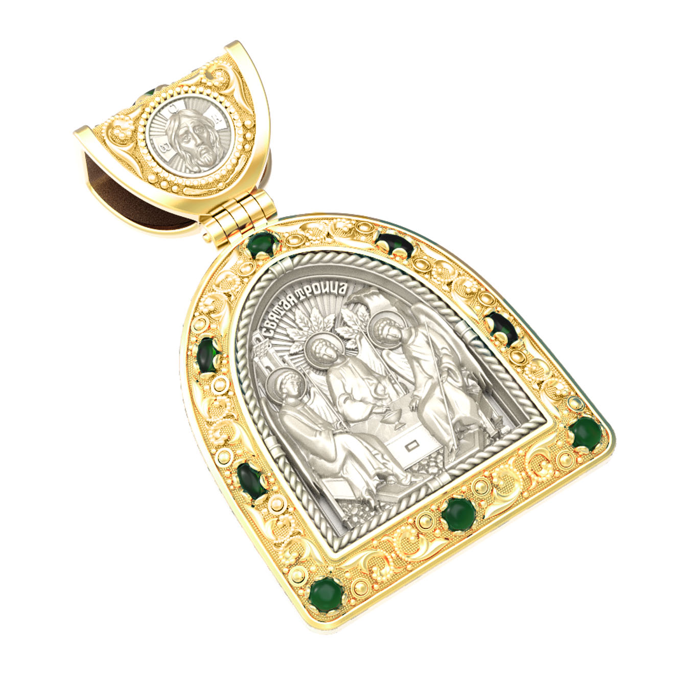 Основой композиции лицевой стороны является икона Святой Троицы.