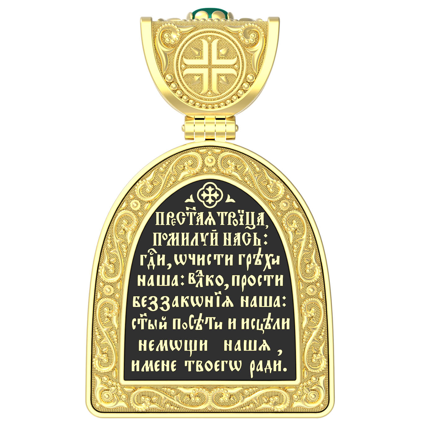 На обороте образка написана молитва: «Пресвятая Троице, помилуй нас; Господи, очисти грехи наша; Владыко, прости беззакония наша; Святый, посети и исцели немощи наша, имене Твоего ради.»