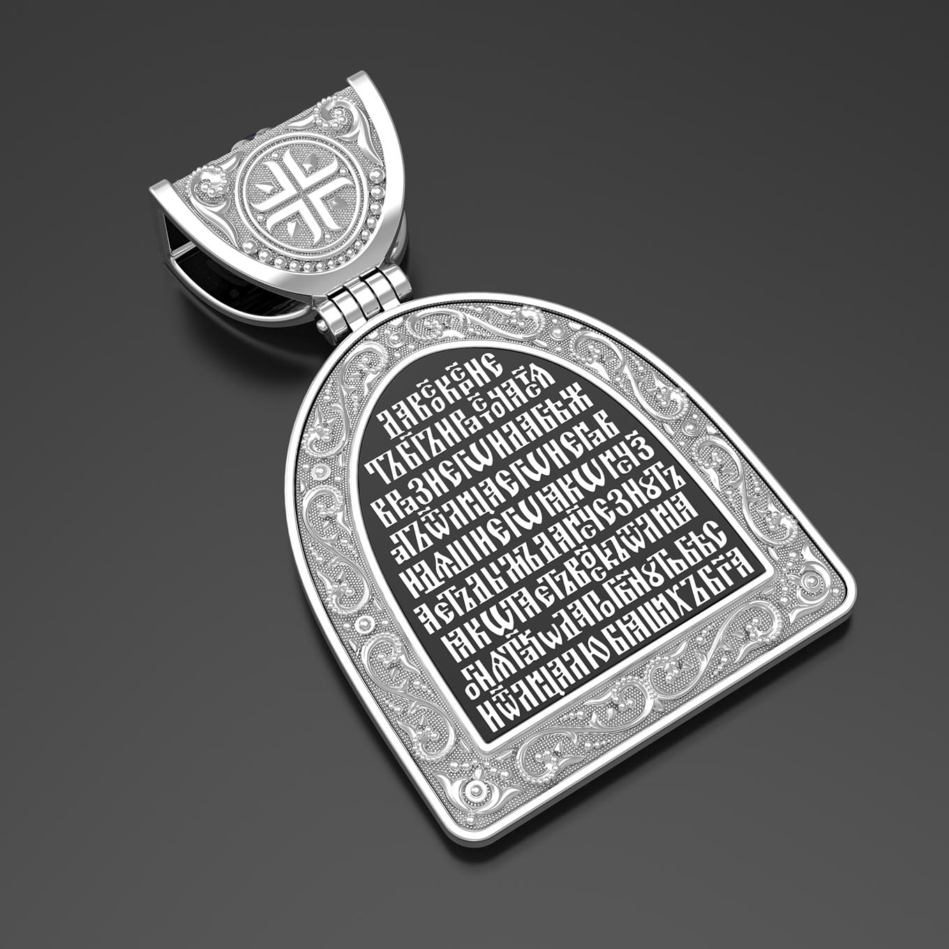 На обороте образка молитва Животворящему Кресту Господню «Да воскреснет Бог, и расточатся врази Его, и да бежат от лица Его ненавидящии Его. Яко исчезает дым, да исчезнут; яко тает воск от лица огня, тако да погибнут беси от лица любящих Бога»
