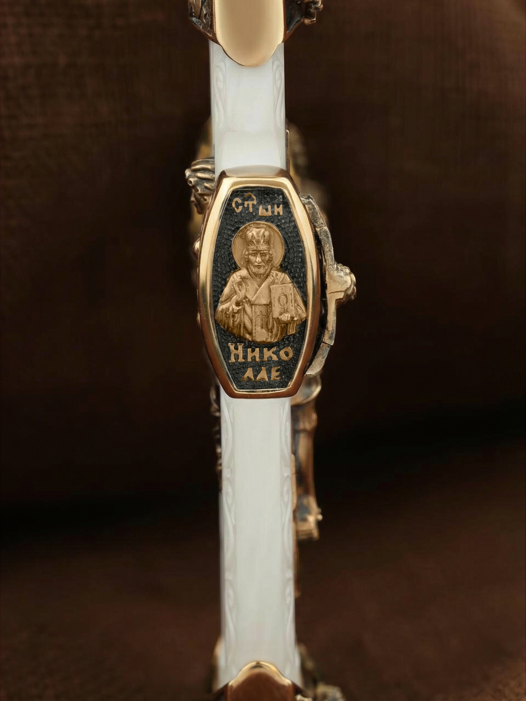 На торце изделия с левой стороны помещена икона Святого Николая Чудотворца — самый почитаемый в Православной Церкви, которого еще называют Николай Угодник за то, что он угодил своей жизнью Богу. Николай Чудотворец, помощник в делах, покровитель учащихся, утешитель обиженных и нуждающихся, целитель самых страшных и тяжелых недугов, предстатель и молитвенник за людей перед Богом. Также Святитель Николай Чудотворец известен своими молитвами за путешественников, когда непрестанный ветер и бушующие волны утихают и корабль заходит в спокойную гавань. На торце изделия с правой стороны — икона Святого Иоанна Крестителя. Святой Иоанн был последним пророком Израиля. Он призывал к покаянию, предвозвещая приближение Царствия Небесного (Мф. 3, 2), и удостоился стать Крестителем Христа. Иисус Христос говорит о нем: «Сей есть о котором написано: «Вот, Я посылаю Ангела Моего пред лицем Твоим, который приготовит путь Твой пред Тобою» (Лк. 7, 27). И еще: «Из рожденных женами нет ни одного пророка больше Иоанна Крестителя» (Лк. 7, 28).