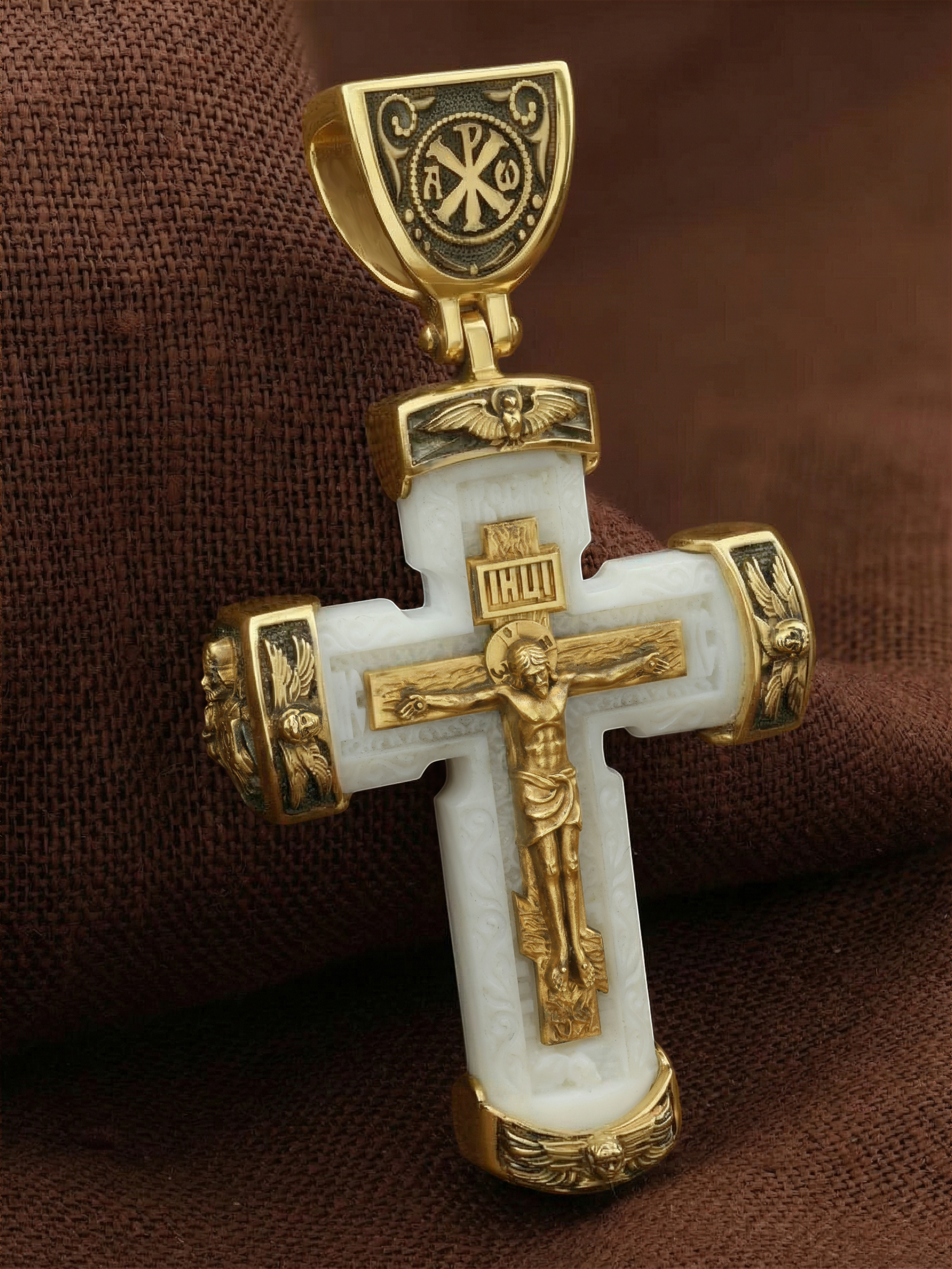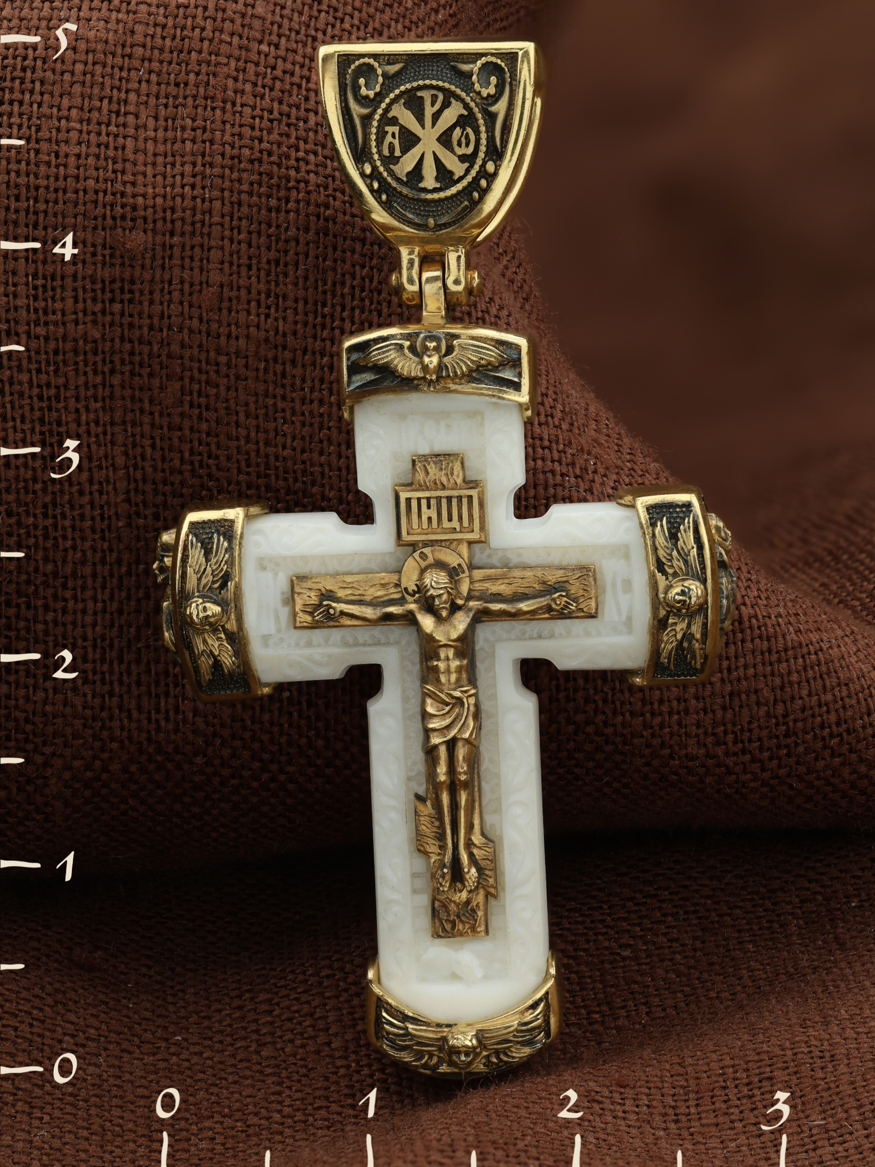 На лицевой стороне креста изображено Распятие, потому что это орудие казни Иисус Христос сделал орудием победы над грехом и смертью. Своими страданиями Он искупил грехи человечества, умерев и сошествовав во ад, победил сатану, освободил души праведников от вечной смерти и открыл им небесные врата рая. Жертва Христа сделала возможным спасение для каждого человека. На православном кресте Христос не умирает, а свободно простирает руки, ладони Иисуса открыты, будто он хочет обнять все человечество, даря им свою любовь и открывая путь к вечной жизни.