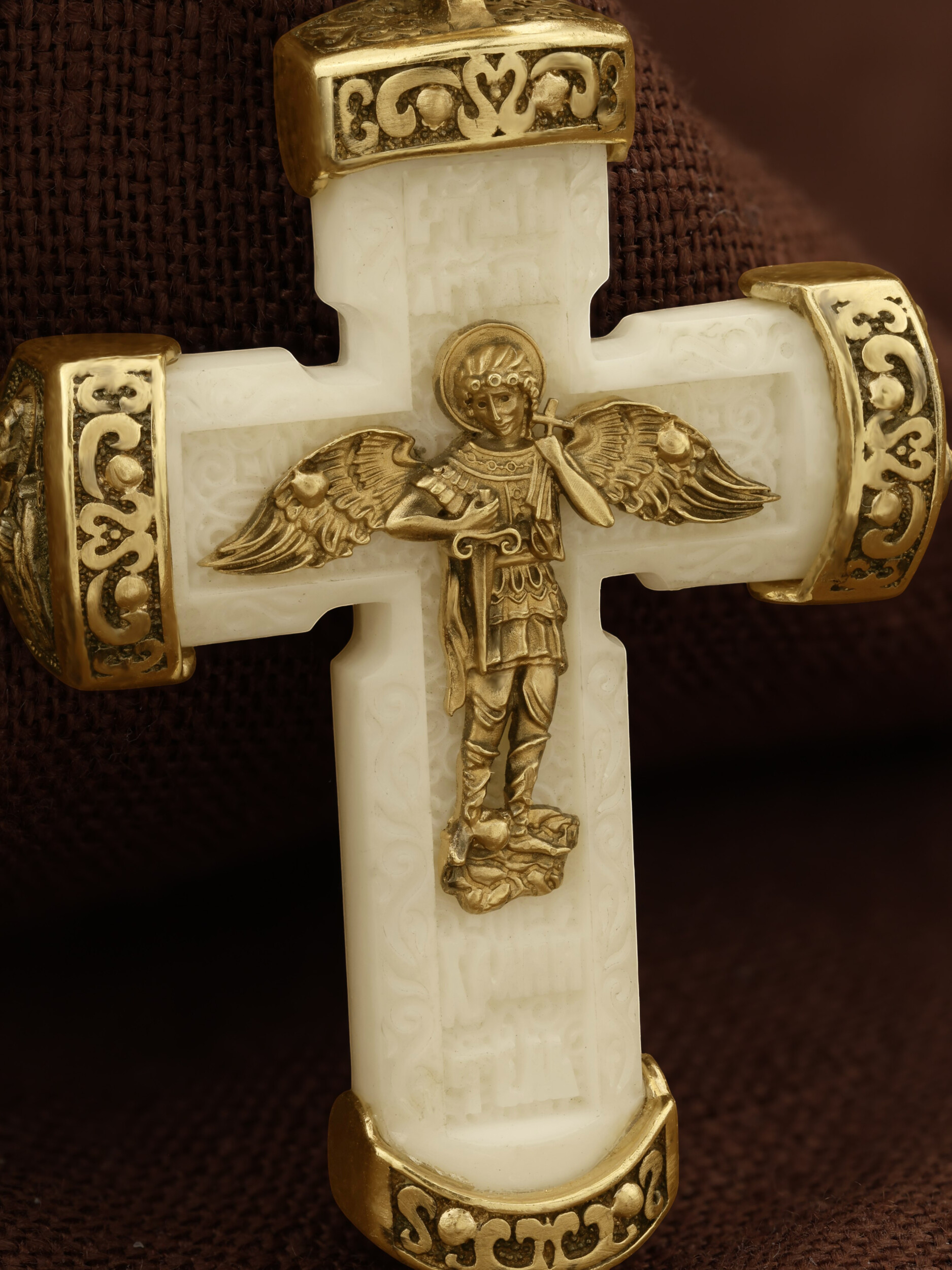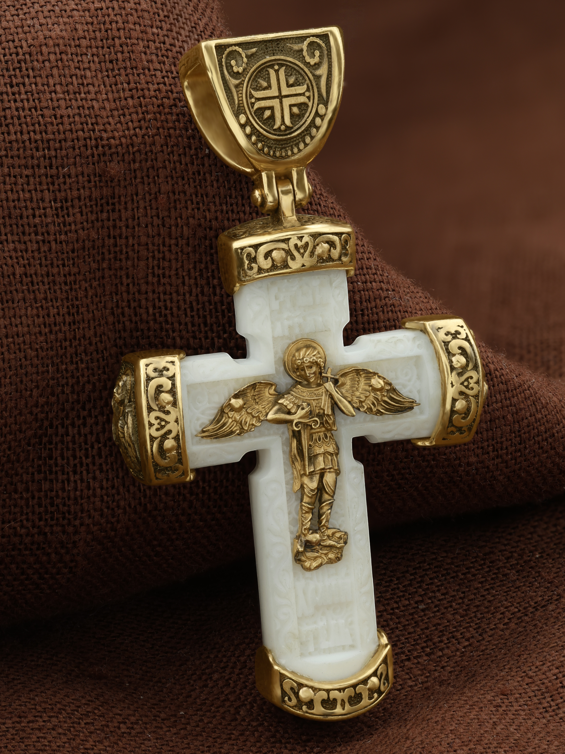 В центре оборота креста изображен Ангела Хранителя с традиционными атрибутами в руках: крестом, которым он осеняет человека, и мечом для прогнания бесов. По Православному учению, каждому, принявшему святое крещение, дается Господом Ангел Хранитель, который сопровождает человека всю его жизнь, помогая в добрых делах и охраняя от нападок злых духов. Святые отцы утверждают, что только верующий человек имеет рядом с собой Ангела Хранителя: «Тем, которые сподобились крещения и возносятся на высоту добродетелей, даны от Бога Ангелы, заботящиеся о них и содействующие им. В этом уверяет нас Господь, когда говорит, что есть Ангелы Хранители у всякого, кто верует в Него» (преп. Анастасий Синаит). Но Ангел Хранитель пребывает с христианином, если только мы не прогоним его греховными делами, поскольку «как дым разгоняет пчел, так и грех прогоняет от нас Ангела Хранителя» (свт. Василий Великий). Но и после завершения земного пути Ангел Хранитель не покидает христианина, а помогает душе преодолеть воздушные мытарства на пути в Царство Небесное.