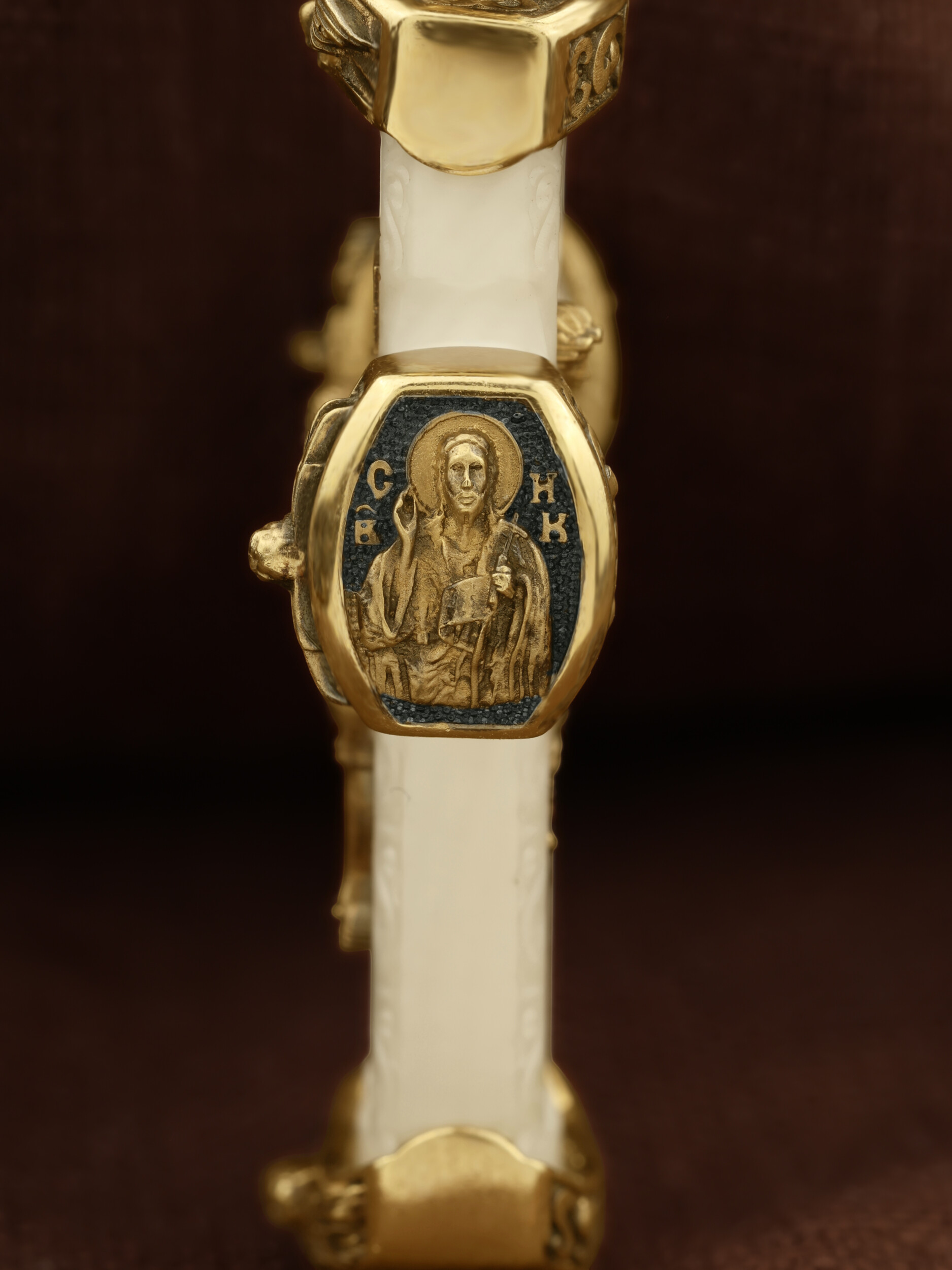 На торце изделия с левой стороны помещена икона Святого Николая Чудотворца — самый почитаемый в Православной Церкви, которого еще называют Николай Угодник за то, что он угодил своей жизнью Богу. Николай Чудотворец, помощник в делах, покровитель учащихся, утешитель обиженных и нуждающихся, целитель самых страшных и тяжелых недугов, предстатель и молитвенник за людей перед Богом. Также Святитель Николай Чудотворец известен своими молитвами за путешественников, когда непрестанный ветер и бушующие волны утихают и корабль заходит в спокойную гавань. На торце изделия с правой стороны — икона Святого Иоанна Крестителя. Святой Иоанн был последним пророком Израиля. Он призывал к покаянию, предвозвещая приближение Царствия Небесного (Мф. 3, 2), и удостоился стать Крестителем Христа. Иисус Христос говорит о нем: «Сей есть о котором написано: «Вот, Я посылаю Ангела Моего пред лицем Твоим, который приготовит путь Твой пред Тобою» (Лк. 7, 27). И еще: «Из рожденных женами нет ни одного пророка больше Иоанна Крестителя» (Лк. 7, 28).