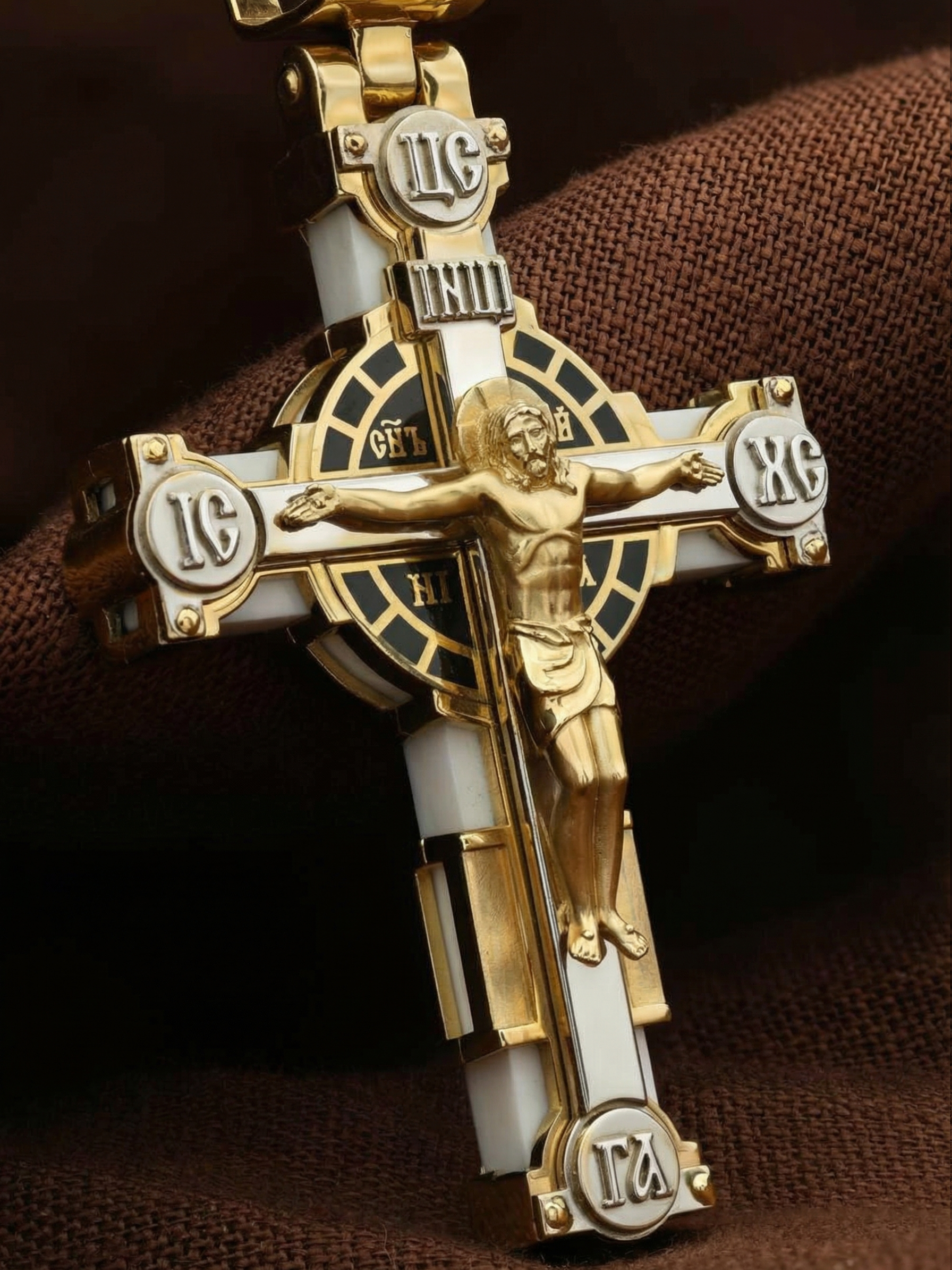 На лицевой стороне креста изображено Распятие Господа и Спасителя нашего Иисуса Христа. Христос, подвергнутый на кресте мучительной казни, своими страданиями искупил нас от древнего греха и даровал нам жизнь вечную. Без Распятия не было бы Воскресения Христова, и поэтому Крест из орудия казни обратился в святыню, в которой действует Благодать Божия. В Голгофе сокрыта непостижимая тайна бесконечной правды и любви Бога. Крест стал символом победы добра над злом, жизни над смертью, напоминанием бесконечной Божьей любви, предметом радости. Воплотившийся Сын Божий Своею кровью освятил крест и сделал его проводником Своей благодати, источником освящения верующих. Через крестную жертву Бог раскрывает нам Свою безмерную любовь и призывает к ответной любви. Над вершиной Распятия помещена надпись «Царь Славы». На верхней табличке, выше головы Иисуса, расположена надпись, составленная Понтием Пилатом — «IНЦI». Она означает «Иисус Назорей, Царь Иудейский». Надпись «IС ХС» означает Иисус Христос помещается на разных сторонах поперечной перекладины креста. Рядом помещены словосочетание «СЫН БОЖИЙ», что означает божественную природу Иисуса Христа и надпись –«НИКА», что означает победитель. Надпись «Г.А.» — голова Адама, грехи которого Христос омыл Своею Кровью, размещена под подножием креста. На православном кресте Христос не умирает, а свободно простирает руки, ладони Иисуса открыты, будто он хочет обнять все человечество, даря им свою любовь и открывая путь к вечной жизни. На кулонном кольце помещен крест Константина — монограмма, известная как «Хи-Ро» («хи» и «ро» — первые две буквы имени Христа по-гречески). Монограмма стала первым общепринятым символом христианства — как знак победы и спасения.
