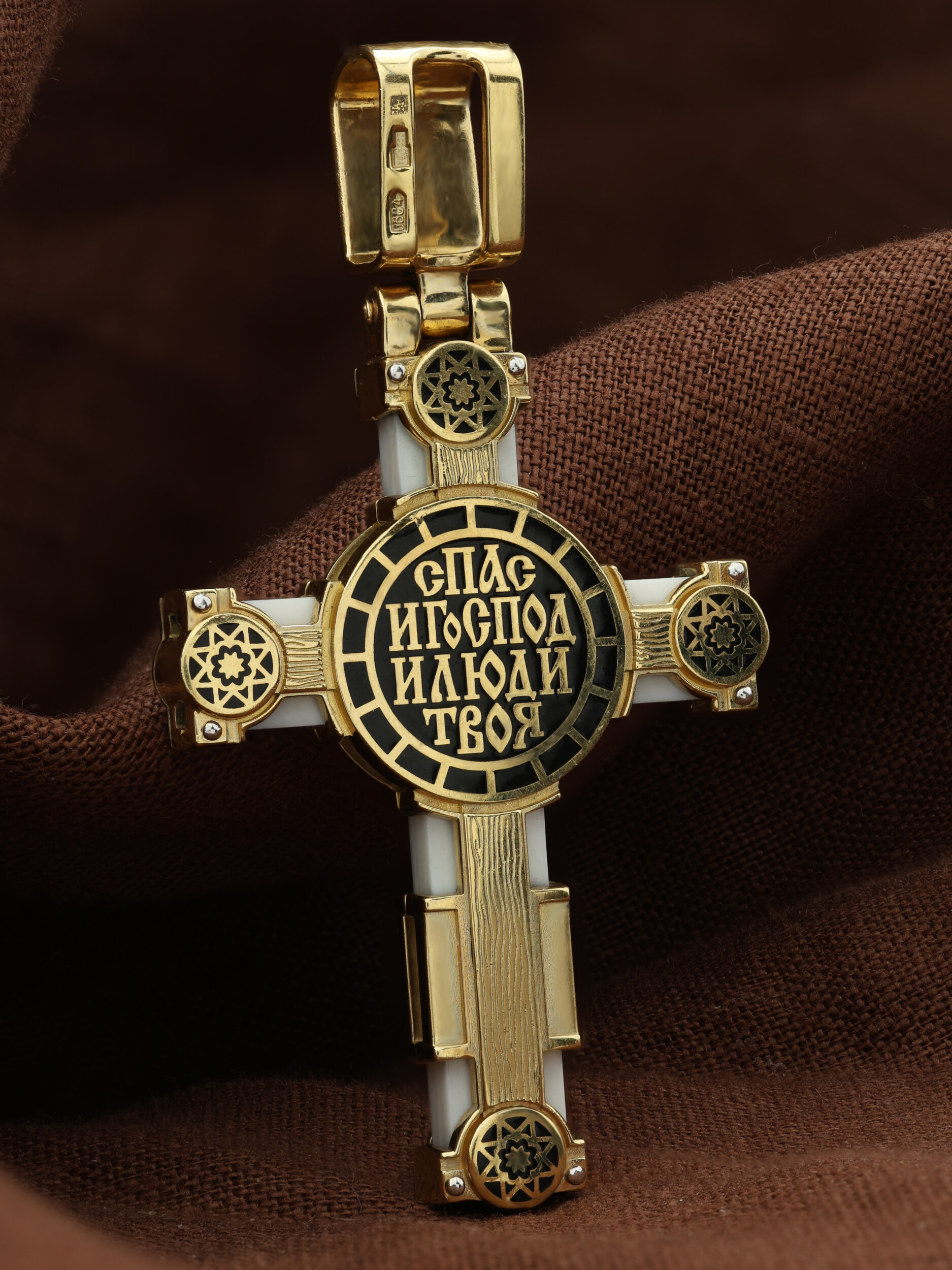 На оборотной стороне креста написан начальный стих молитвы Животворящему Кресту Господню: «Спаси, Господи, люди Твоя…»