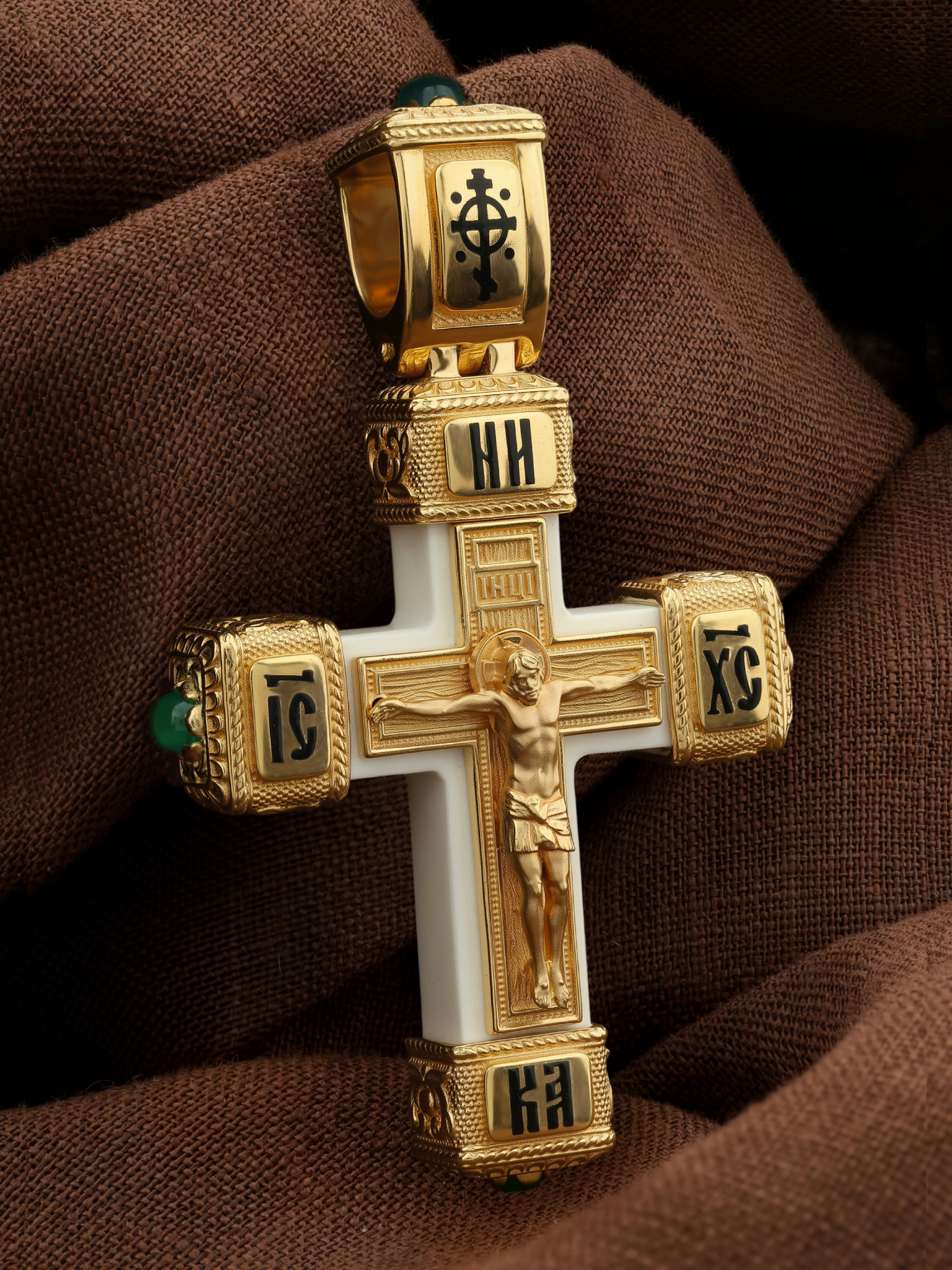 Крест из лимонного золота c эмалью, хризопразом и бивнем мамонта