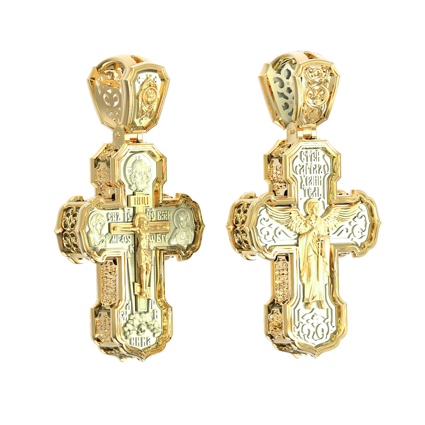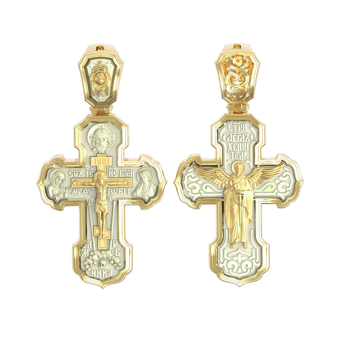 На лицевой стороне креста изображено Распятие Господа и Спасителя нашего Иисуса Христа. Крест- символ спасения и искупления рода человеческого, знамение победы над смертью и адом. Иисус Христос, как искупительная жертва освобождения человечества от власти греха, умер крестной смертью и в третий день воскрес. На верхней табличке, выше головы Иисуса, расположена надпись, составленная Понтием Пилатом — «IНЦI». Она означает «Иисус Назорей, Царь Иудейский». Надпись «IС» « ХС» означает Иисус Христос и помещается на разных сторонах поперечной (большой) перекладины креста. Рядом расположена надпись «Сын Божий». Выше Распятия изображен Нерукотворный образ Господа и Спасителя нашего Иисуса Христа. Слева от Распятия изображена Пресвятая Богородица, справа — апостол и евангелист Иоанн Богослов, один из ближайших учеников Иисуса Христа. Крест стоит на горе камней, символизирующих Голгофу. В ее основании различается череп — это голова Адама. Вдоль креста изображены копие сотника Лонгина и трость с губкой и буквы «К» и «Т». Надпись «МЛРБ» — «место лобное рай бысть» означает, что место лобное стало раем и помещаются в нижней части креста. Рядом — слово «НИКА», что означает «победитель». На православном кресте Христос не умирает, а свободно простирает руки, ладони Иисуса открыты, будто он хочет обнять все человечество, даря им свою любовь и открывая путь к вечной жизни. На кулонном кольце изображен шестикрылый Серафим.