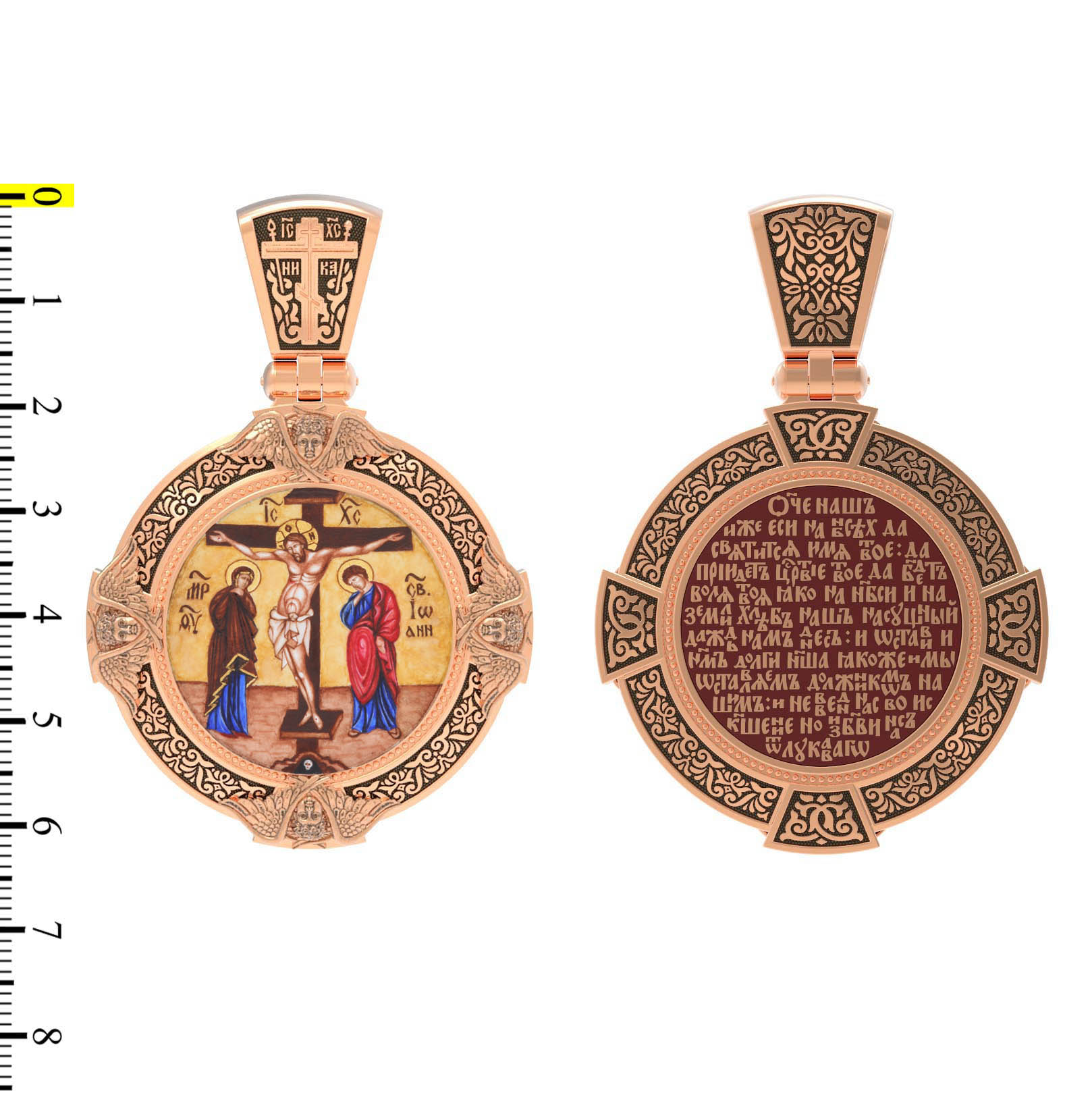 На лицевой стороне образка изображено Распятие Господа и Спасителя нашего Иисуса Христа. Своими крестными страданиями Господь смыл наши грехи, покрыл наш долг перед Богом или, на языке Писания, нас «искупил». В Голгофе сокрыта непостижимая тайна бесконечной правды и любви Бога. Крест стал символом победы добра над злом, жизни над смертью, напоминанием бесконечной Божьей любви, предметом радости. Воплотившийся Сын Божий Своею кровью освятил крест и сделал его проводником Своей благодати, источником освящения верующих. На верхней табличке, выше головы Иисуса, расположена надпись, составленная Понтием Пилатом — «IНЦI». Она означает «Иисус Назорей, Царь Иудейский». Ниже перекладины написано сокращенно имя Спасителя «IC» «XC» — Иисус Христос. Крест стоит на горе камней, символизирующих Голгофу. Под подножием Креста изображена покоящаяся голова (череп) Адама. Слева от Распятия стоят оплакивающие Господа Пресвятая Богородица и святая мироносица Мария Клеопова. Справа — апостол и евангелист Иоанн Богослов, один из ближайших учеников Иисуса Христа и сотник Лонгин с крестом в правой руке и копьем — в левой. По преданию, увидя, что они горько плачут, Иисус сказал Матери Своей: «Жено! Се сын Твой!» Потом сказал ученику Иоанну: «Се мати твоя». С этого времени Иоанн взял Матерь Божию к себе, и Она жила в его доме до самой смерти.