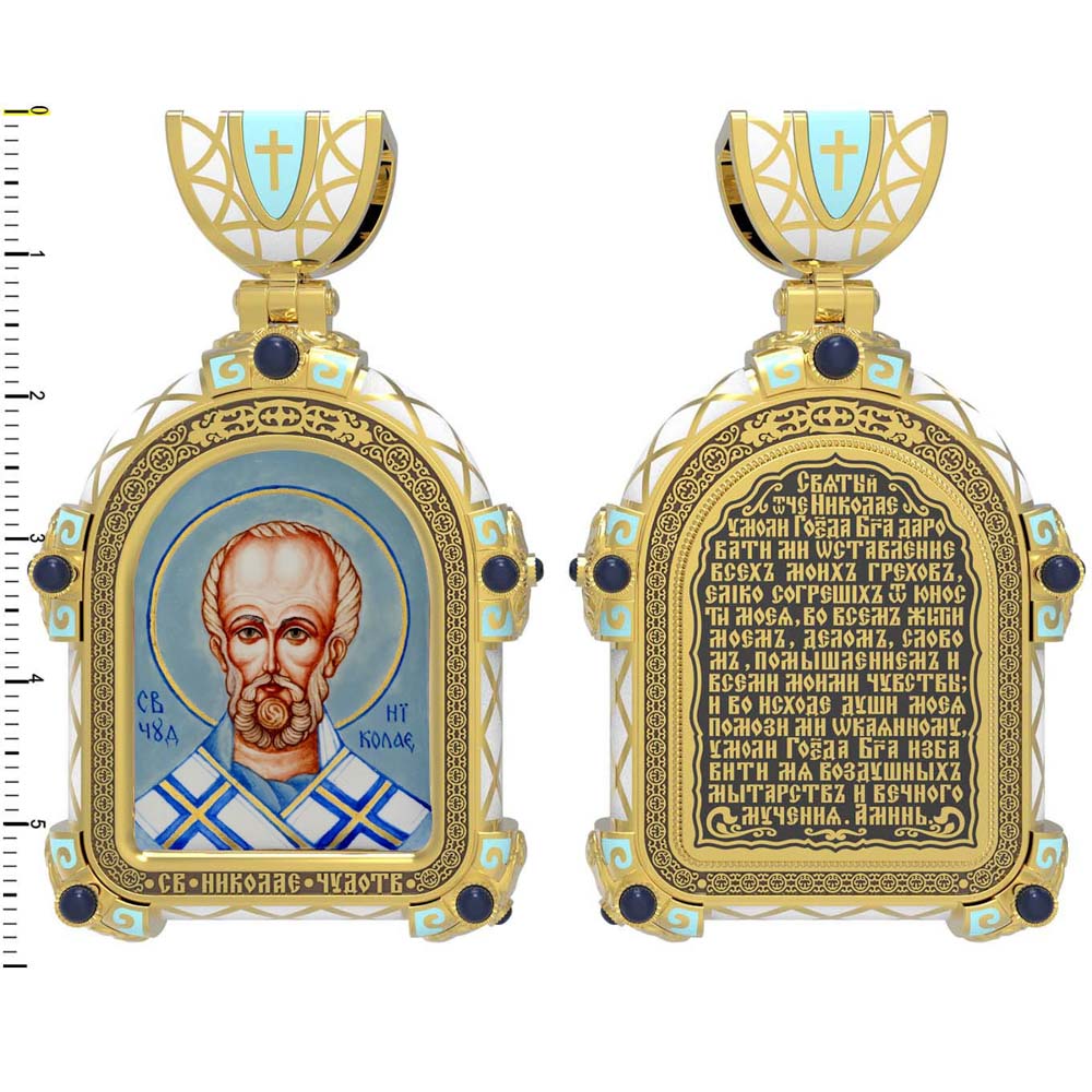 На лицевой стороне образка изображен Святитель Николай архиепископ Мир Ликийских, Чудотворец. Он является одним из самых известных на Руси святых, издревле считающийся помощником и молитвенником за всех, притекающих к нему. Чудес его исчислить невозможно. Николай Чудотворец подавал многим исцеления в болезнях и телесных недугах, обогащал бедствующих в крайней нищете, подавал голодным пищу, спасал от потопления, освобождал из плена и избавлял от смерти.