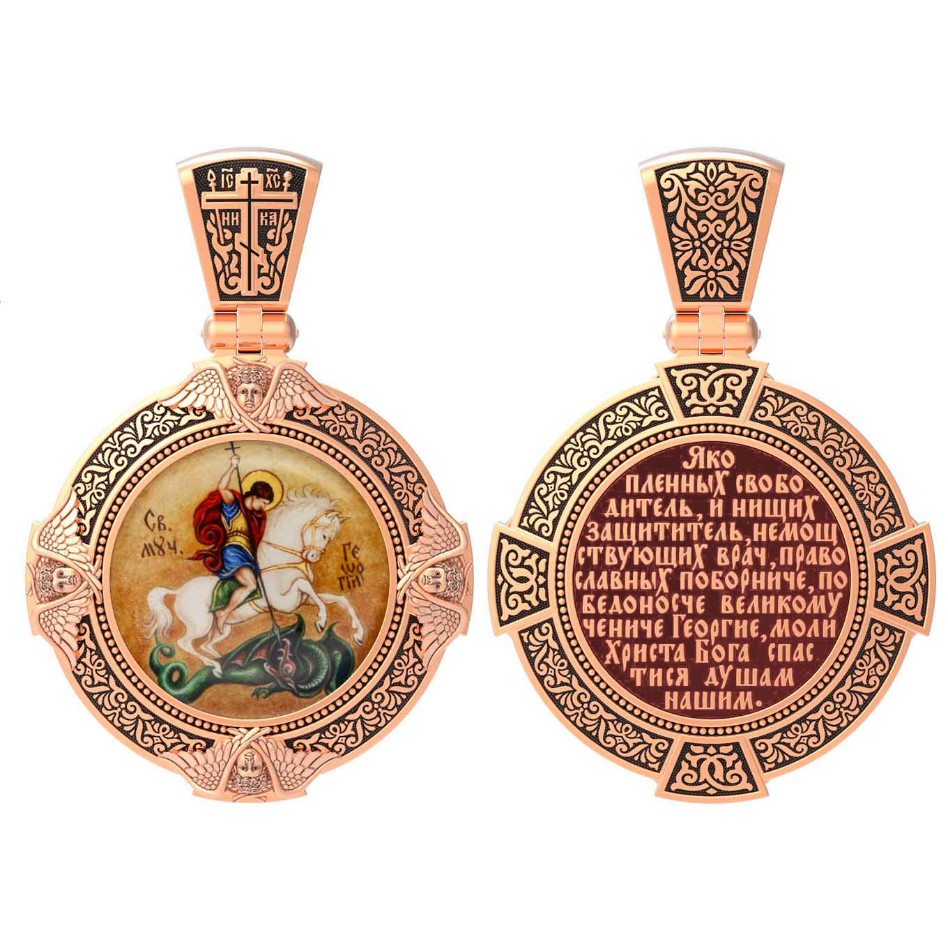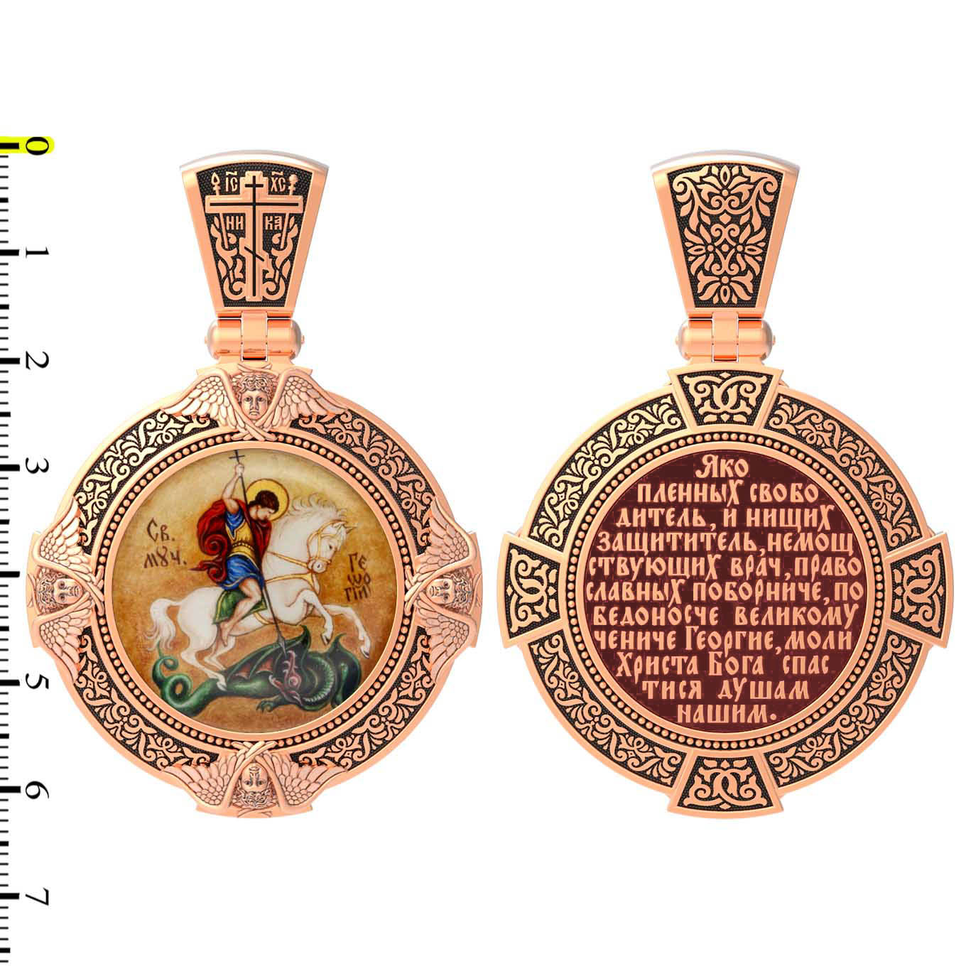 На обороте написана молитва"Яко пленных свободитель, и нищих защититель, немощствующих врач, православных поборниче, победоносче великому чениче Георгие, моли Христа Бога спастися душам нашим.»