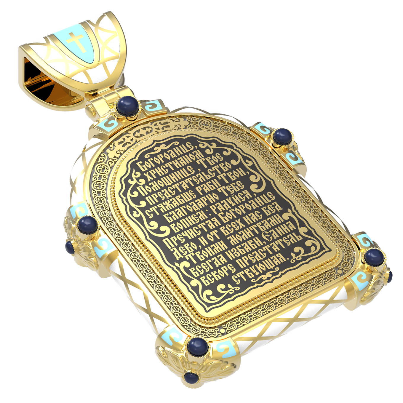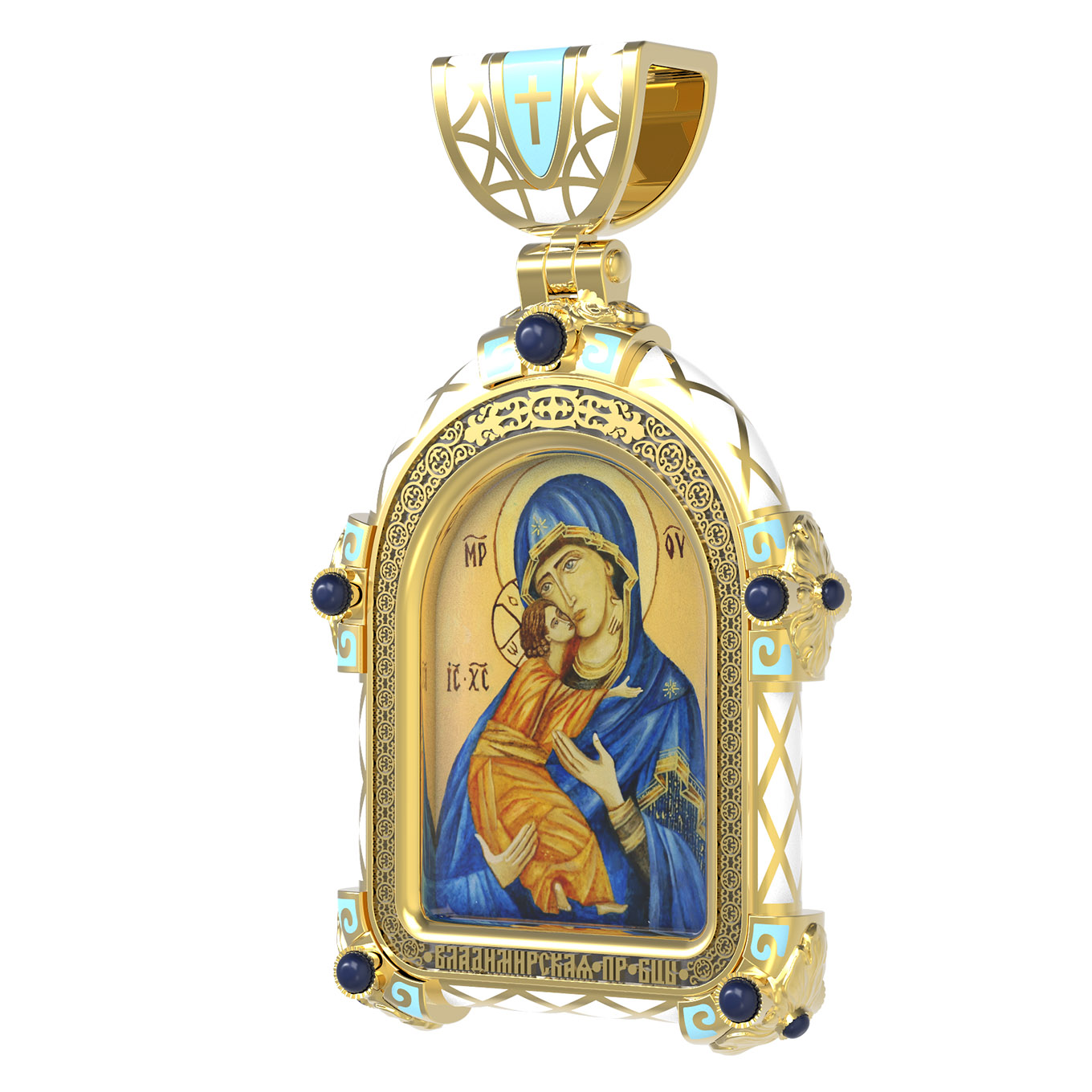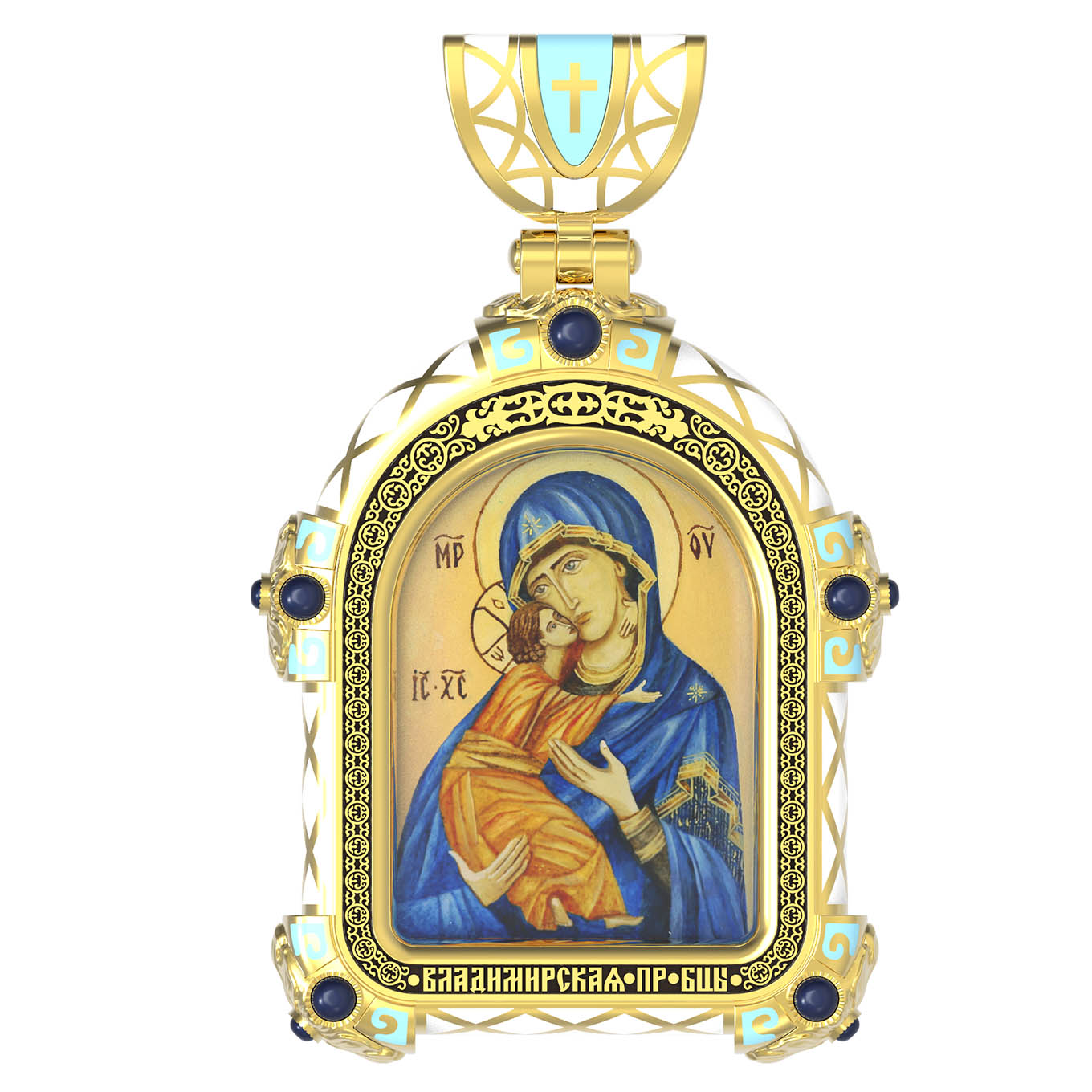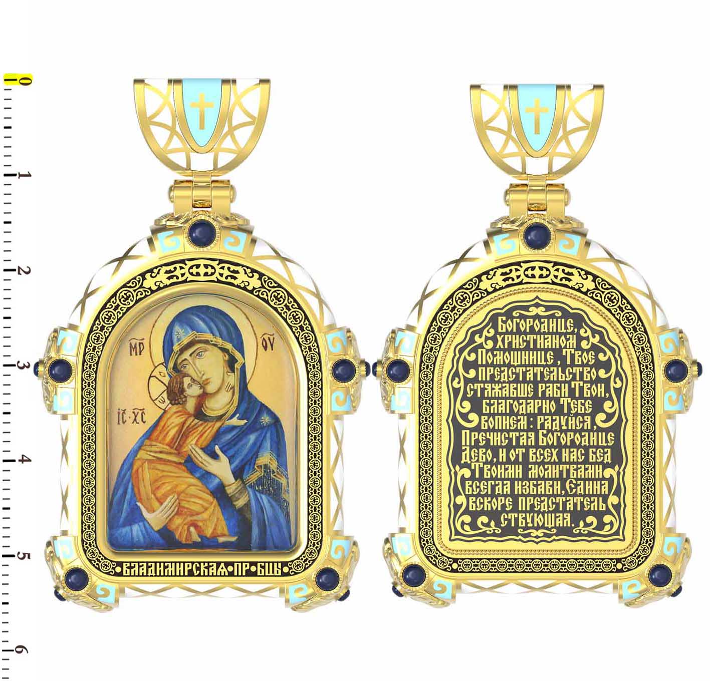 На лицевой стороне образка изображена Владимирская икона Божией Матери — одна из самых чтимых святынь Русской православной церкви. По преданию, икона была написана Святым апостолом и евангелистом Лукой во время земной жизни Богородицы. Дева Мария, увидев Свое изображение, молвила: «Отныне ублажат Мя вси роди. Благодать Рождшегося от Меня и Моя с сим образом да будет». Образ написан в лирическом иконографическом типе «Умиление». Младенец припал щекой к щеке Матери и тянется к ней правой рукой, другой нежно обнимая за шею. Икона вплоть до V века находилась в Иерусалиме, затем была перевезена в Византию. На Русь икона была привезена в 1131 г. За прошедшие столетия святыня неоднократно переезжала из Владимира в Москву и обратно, не раз спасая страну от захватчиков. Русская Православная Церковь установила троекратное празднование Владимирской иконе Божьей Матери. Каждый из дней празднования связан с избавлением русского народа от порабощения иноплеменниками по молитвам ко Пресвятой Богородице. В последующие века у иконы происходили многие важные исторические события: подписание актов, принятие присяги значимых государственных деятелей и возведение на престол. На кулонном кольце изображен Спас Нерукотворный — образ Господа и Спасителя нашего Иисуса Христа, чудесно отпечатавшийся на плате, котором Христос вытер свой лик.