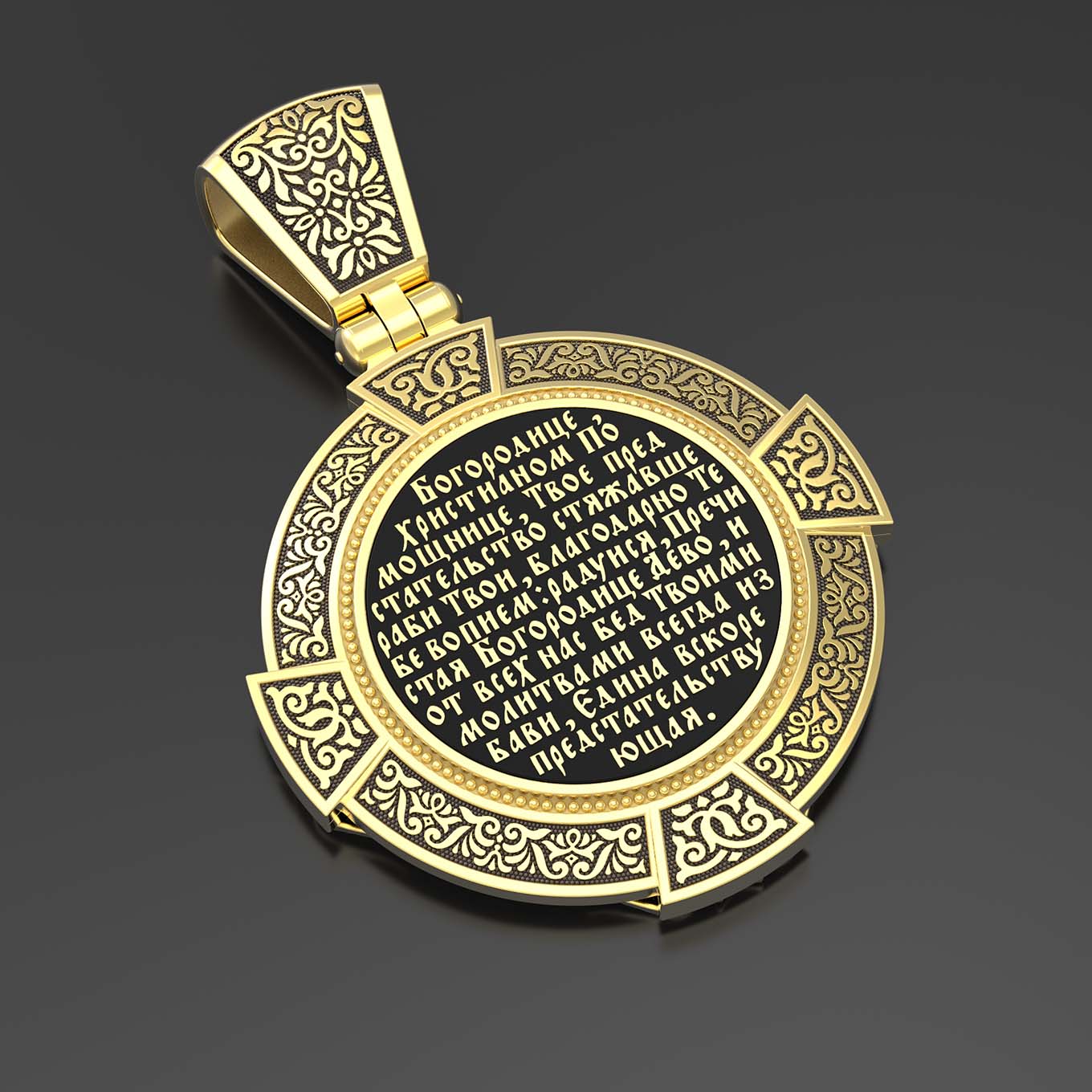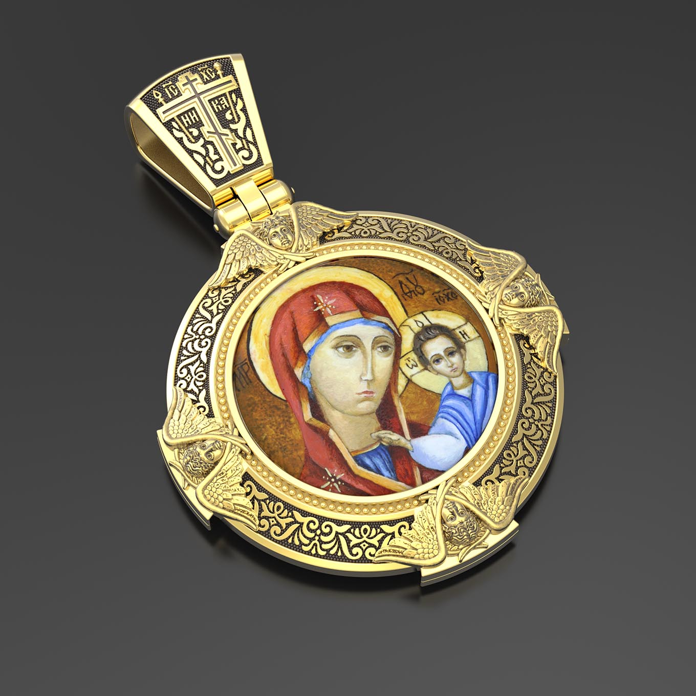 На лицевой стороне образка изображена Казанская икона Божией Матери. Пресвятая Богородица — милосердная заступница, просительница за нас перед Богом. Она стала воистину нашей Матушкой, охраняющей и поддерживающей нас от рождения до самой смерти, а Ее благодатная помощь изливается на нас по молитвам у ее чудотворных икон. Казанская икона явилась в 1579 году в Казани, вскоре после взятия Казанского царства у татар Иоанном Грозным. Этот образ Богородицы не раз сопровождал русский народ в бедствиях. Икона Божией Матери Казанская вдохновляла русских ратников в период Смутного времени при освобождении Москвы от поляков. Перед Казанской иконой в 1709 году, накануне Полтавской победы, император Петр I молился о даровании победы русскому войску. В 1812 году накануне отъезда в действующую армию перед чудотворной иконой Божией Матери молился князь Михаил Кутузов. Не только государственным мужам и дружинам указывала путь икона — по доброй традиции именно этой иконой благословляют на брак молодых родители, длинным списком чудес сопровождается этот образ Богоматери — один из самых любимых на Руси. Существует множество древних списков с этой удивительной иконы. На кулонном кольце изображен Спас Нерукотворный — образ Господа и Спасителя нашего Иисуса Христа, чудесно отпечатавшийся на плате, котором Христос вытер свой лик.