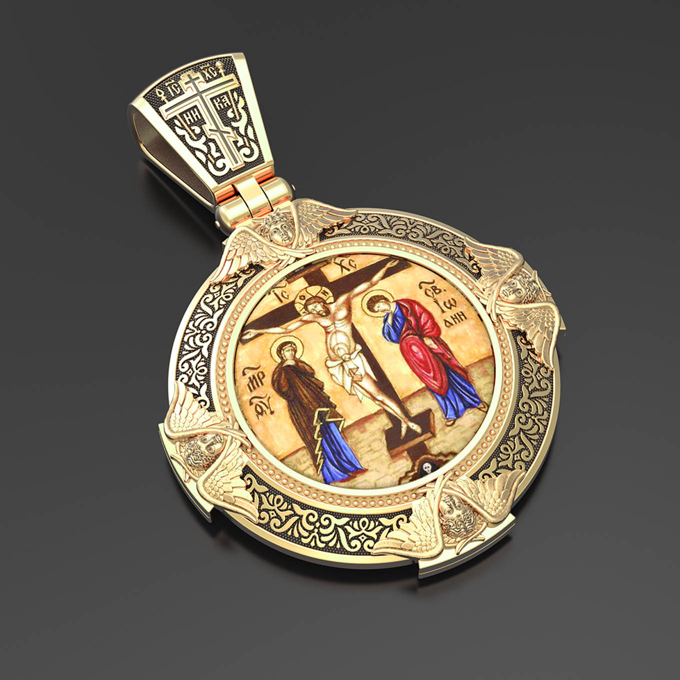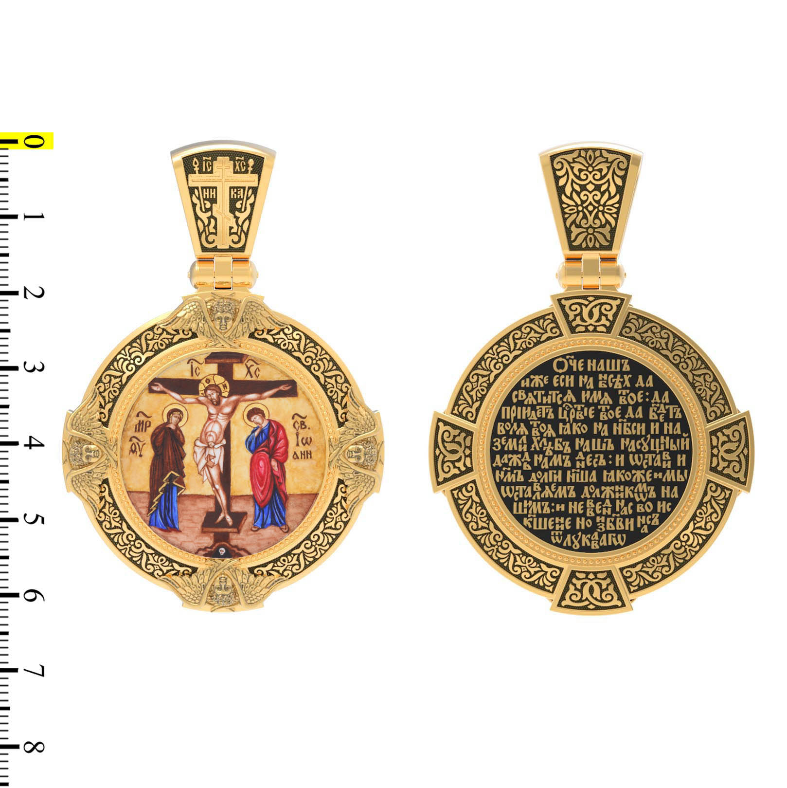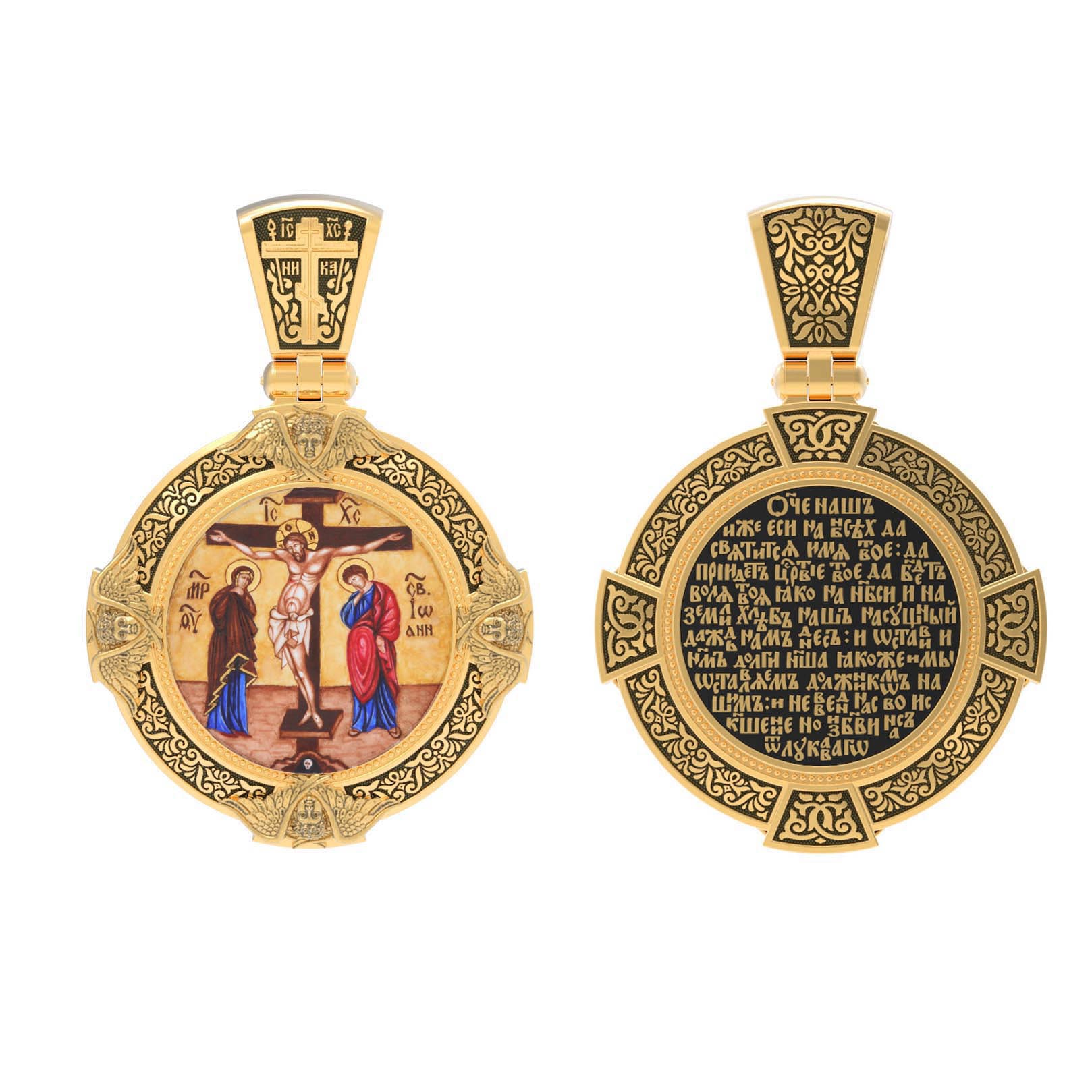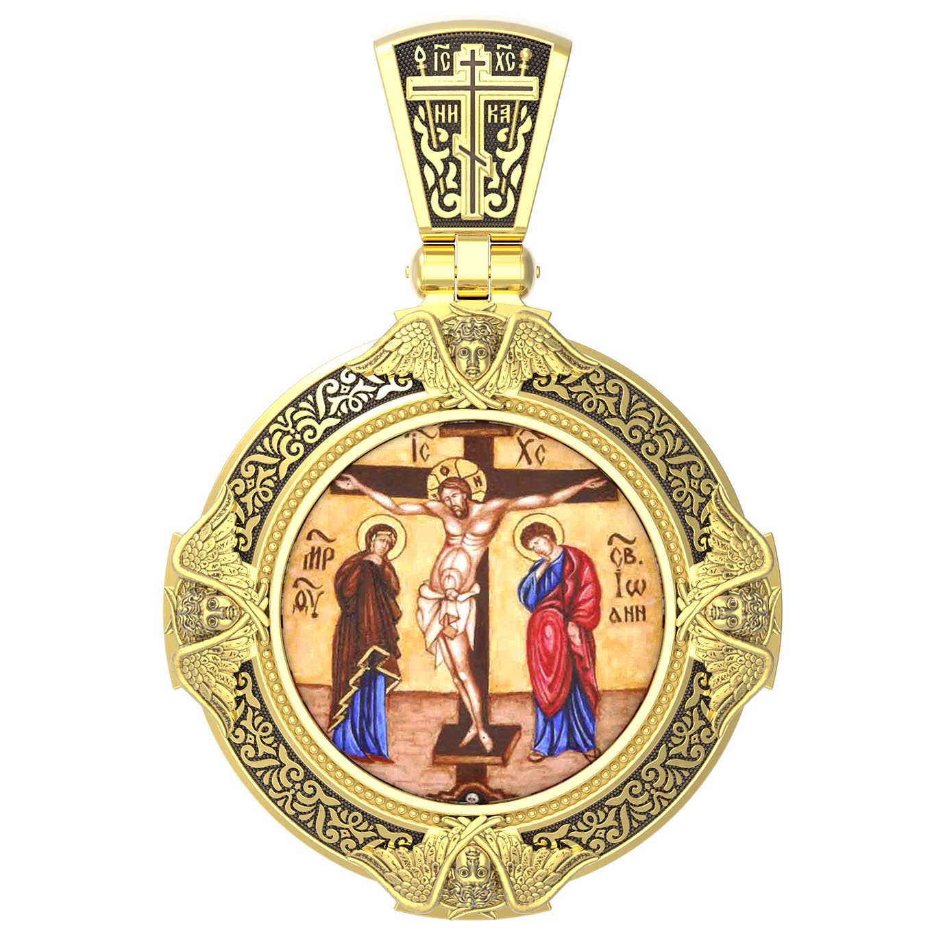 На лицевой стороне образка изображено Распятие Господа и Спасителя нашего Иисуса Христа. Своими крестными страданиями Господь смыл наши грехи, покрыл наш долг перед Богом или, на языке Писания, нас «искупил». В Голгофе сокрыта непостижимая тайна бесконечной правды и любви Бога. Крест стал символом победы добра над злом, жизни над смертью, напоминанием бесконечной Божьей любви, предметом радости. Воплотившийся Сын Божий Своею кровью освятил крест и сделал его проводником Своей благодати, источником освящения верующих. На верхней табличке, выше головы Иисуса, расположена надпись, составленная Понтием Пилатом — «IНЦI». Она означает «Иисус Назорей, Царь Иудейский». Ниже перекладины написано сокращенно имя Спасителя «IC» «XC» — Иисус Христос. Крест стоит на горе камней, символизирующих Голгофу. Под подножием Креста изображена покоящаяся голова (череп) Адама. Слева от Распятия стоят оплакивающие Господа Пресвятая Богородица и святая мироносица Мария Клеопова. Справа — апостол и евангелист Иоанн Богослов, один из ближайших учеников Иисуса Христа и сотник Лонгин с крестом в правой руке и копьем — в левой. По преданию, увидя, что они горько плачут, Иисус сказал Матери Своей: «Жено! Се сын Твой!» Потом сказал ученику Иоанну: «Се мати твоя». С этого времени Иоанн взял Матерь Божию к себе, и Она жила в его доме до самой смерти.