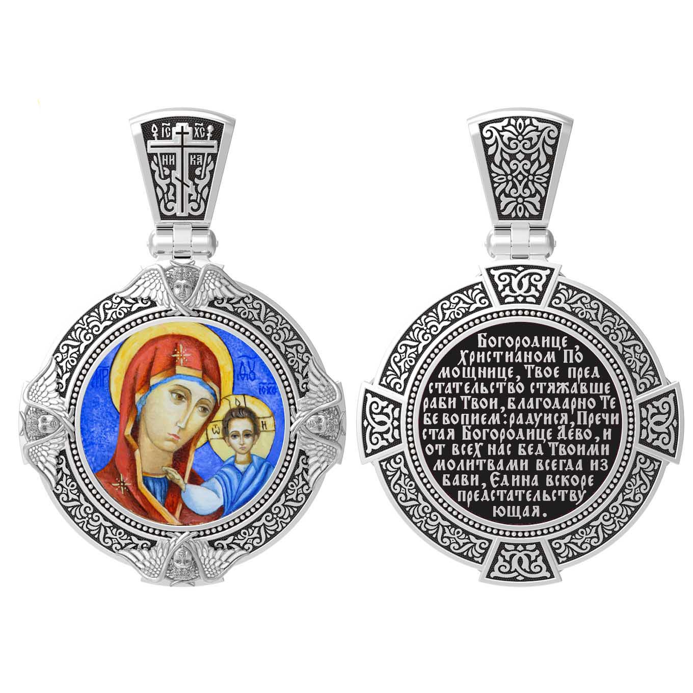 На лицевой стороне образка изображена Казанская икона Божией Матери. Пресвятая Богородица — милосердная заступница, просительница за нас перед Богом. Она стала воистину нашей Матушкой, охраняющей и поддерживающей нас от рождения до самой смерти, а Ее благодатная помощь изливается на нас по молитвам у ее чудотворных икон. Казанская икона явилась в 1579 году в Казани, вскоре после взятия Казанского царства у татар Иоанном Грозным. Этот образ Богородицы не раз сопровождал русский народ в бедствиях. Икона Божией Матери Казанская вдохновляла русских ратников в период Смутного времени при освобождении Москвы от поляков. Перед Казанской иконой в 1709 году, накануне Полтавской победы, император Петр I молился о даровании победы русскому войску. В 1812 году накануне отъезда в действующую армию перед чудотворной иконой Божией Матери молился князь Михаил Кутузов. Не только государственным мужам и дружинам указывала путь икона — по доброй традиции именно этой иконой благословляют на брак молодых родители, длинным списком чудес сопровождается этот образ Богоматери — один из самых любимых на Руси. Существует множество древних списков с этой удивительной иконы. На кулонном кольце изображен Спас Нерукотворный — образ Господа и Спасителя нашего Иисуса Христа, чудесно отпечатавшийся на плате, котором Христос вытер свой лик.