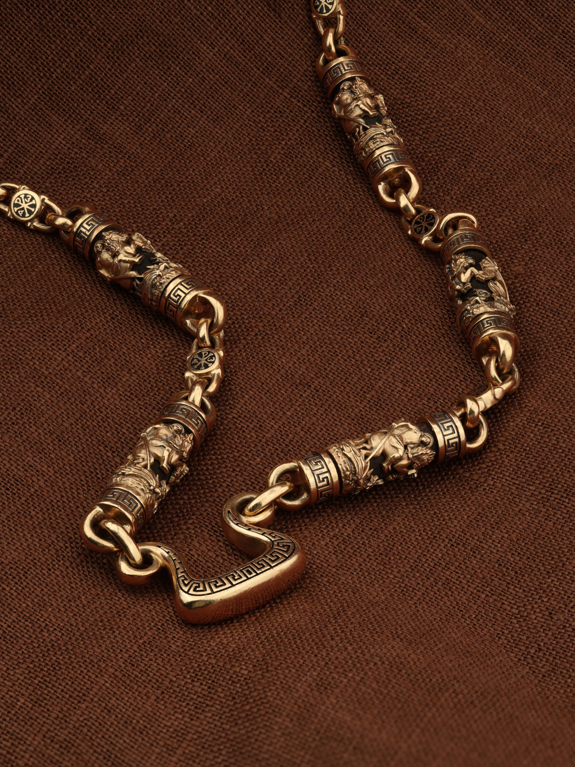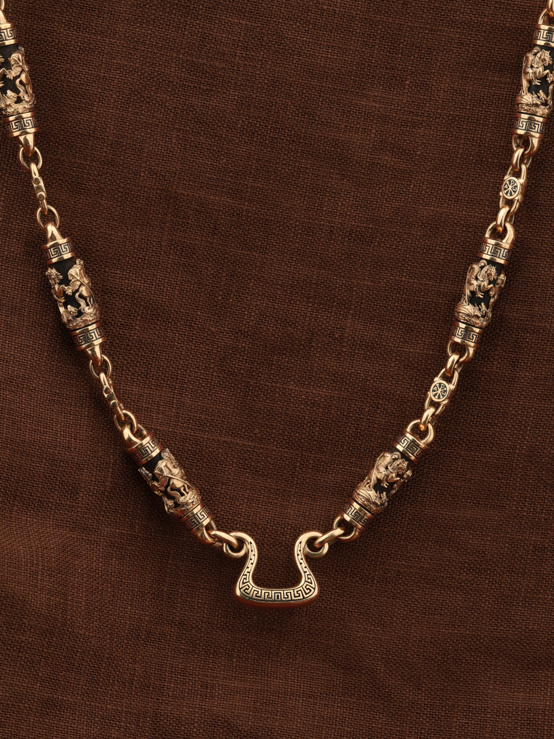 На звеньях цепи изображена Хризма — монограмма имени Христа, которая состоит из двух начальных греческих букв имени — Х (хи) и Р (ро), скрещённых между собой. По краям монограммы помещены греческие буквы a и w. Такое употребление этих букв восходит к тексту Апокалипсиса: «Аз есмь Альфа и Омега, начало и конец, говорит Господь, Который есть и был и грядет, Вседержитель.» (Откр. 1:8; см. также Откр. 22:13). Также на звеньях цепи помещено изображен святого великомученика Георгия Победоносца — одного из самых почитаемых и удивительных святых. Георгий родился в Каппадокии (Малая Азия) в семье богатых и знатных горожан. Юношей поступил на службу к римскому императору Диоклетиану, за отличное знание военного дела и проявленную в боях и походах храбрость был приближен к императору и удостоен высокого воинского звания. Во время начавшихся гонений на христиан, перешел на сторону гонимых и, отвергнув человеческий страх, стал ярым проповедником учения Христа. Мучители подвергли опального воеводу жесточайшим восьмидневным пыткам и казнили его (обезглавили) в возрасте около тридцати лет в 303 году. На Руси он известен как Юрий или Егорий, заступник для верующих, чья жизнь имеет какое-либо отношение к военным делам, помощник в крестьянском труде. На цепи Георгий изображен как воитель, сидящий на вздыбленном коне и поражающий копьем огнедышащего змея. Змей символизирует собою сатанинские силы. Молитвами вознесенными к Всевышнему и своей непреклонной верой он смог одолеть чудовище. Святой убил змея, спас царскую дочь, принесенную в жертву, и жителей города, их души от влияния дьявола, породив в них надежду и веру в Господа, призывая людей принять христианскую веру. Цепь украшена орнаментом.