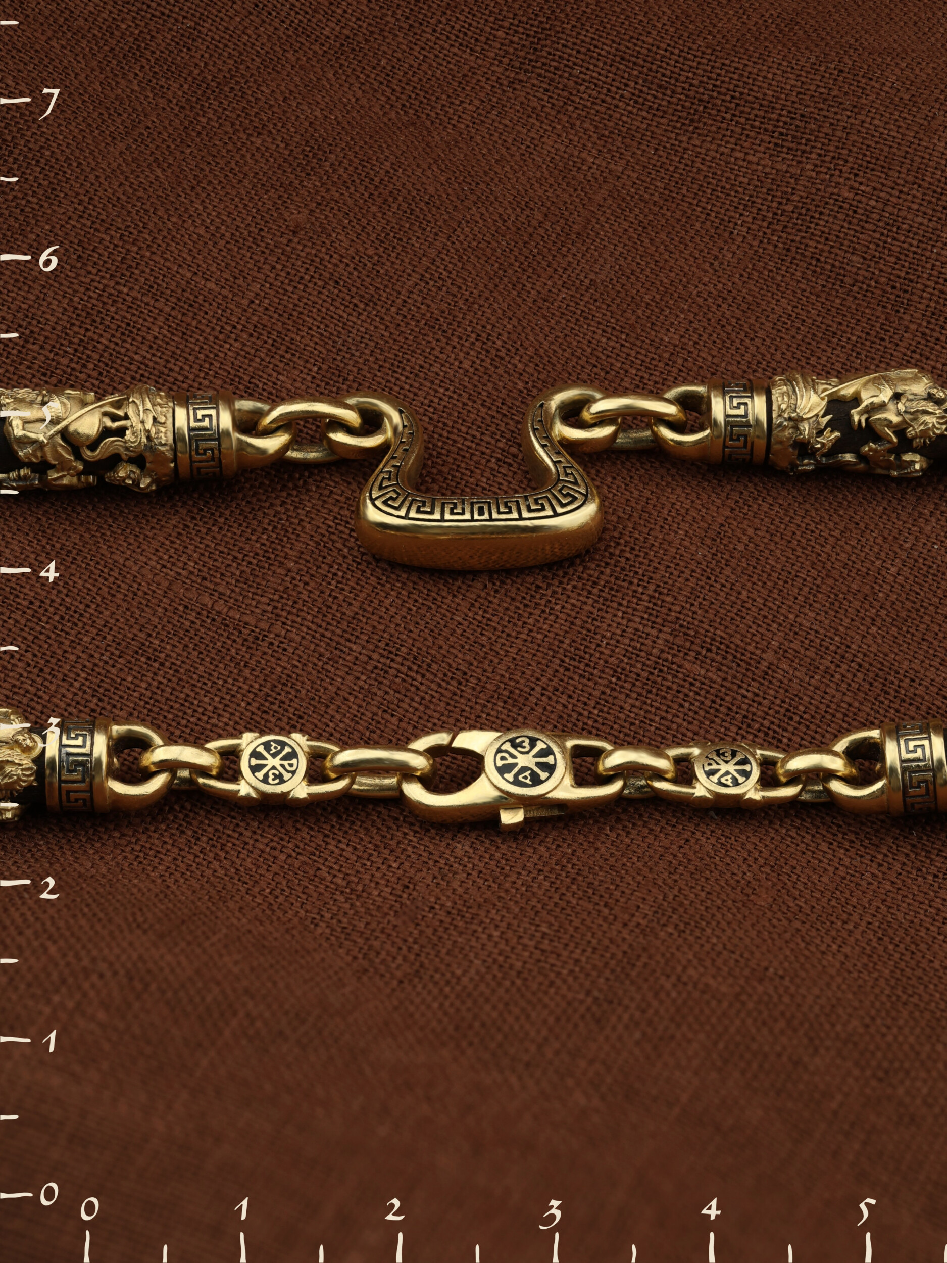 На звеньях цепи изображена Хризма — монограмма имени Христа, которая состоит из двух начальных греческих букв имени — Х (хи) и Р (ро), скрещённых между собой. По краям монограммы помещены греческие буквы a и w. Такое употребление этих букв восходит к тексту Апокалипсиса: «Аз есмь Альфа и Омега, начало и конец, говорит Господь, Который есть и был и грядет, Вседержитель.» (Откр. 1:8; см. также Откр. 22:13). Также на звеньях цепи помещено изображен святого великомученика Георгия Победоносца — одного из самых почитаемых и удивительных святых. Георгий родился в Каппадокии (Малая Азия) в семье богатых и знатных горожан. Юношей поступил на службу к римскому императору Диоклетиану, за отличное знание военного дела и проявленную в боях и походах храбрость был приближен к императору и удостоен высокого воинского звания. Во время начавшихся гонений на христиан, перешел на сторону гонимых и, отвергнув человеческий страх, стал ярым проповедником учения Христа. Мучители подвергли опального воеводу жесточайшим восьмидневным пыткам и казнили его (обезглавили) в возрасте около тридцати лет в 303 году. На Руси он известен как Юрий или Егорий, заступник для верующих, чья жизнь имеет какое-либо отношение к военным делам, помощник в крестьянском труде. На цепи Георгий изображен как воитель, сидящий на вздыбленном коне и поражающий копьем огнедышащего змея. Змей символизирует собою сатанинские силы. Молитвами вознесенными к Всевышнему и своей непреклонной верой он смог одолеть чудовище. Святой убил змея, спас царскую дочь, принесенную в жертву, и жителей города, их души от влияния дьявола, породив в них надежду и веру в Господа, призывая людей принять христианскую веру. Цепь украшена орнаментом.