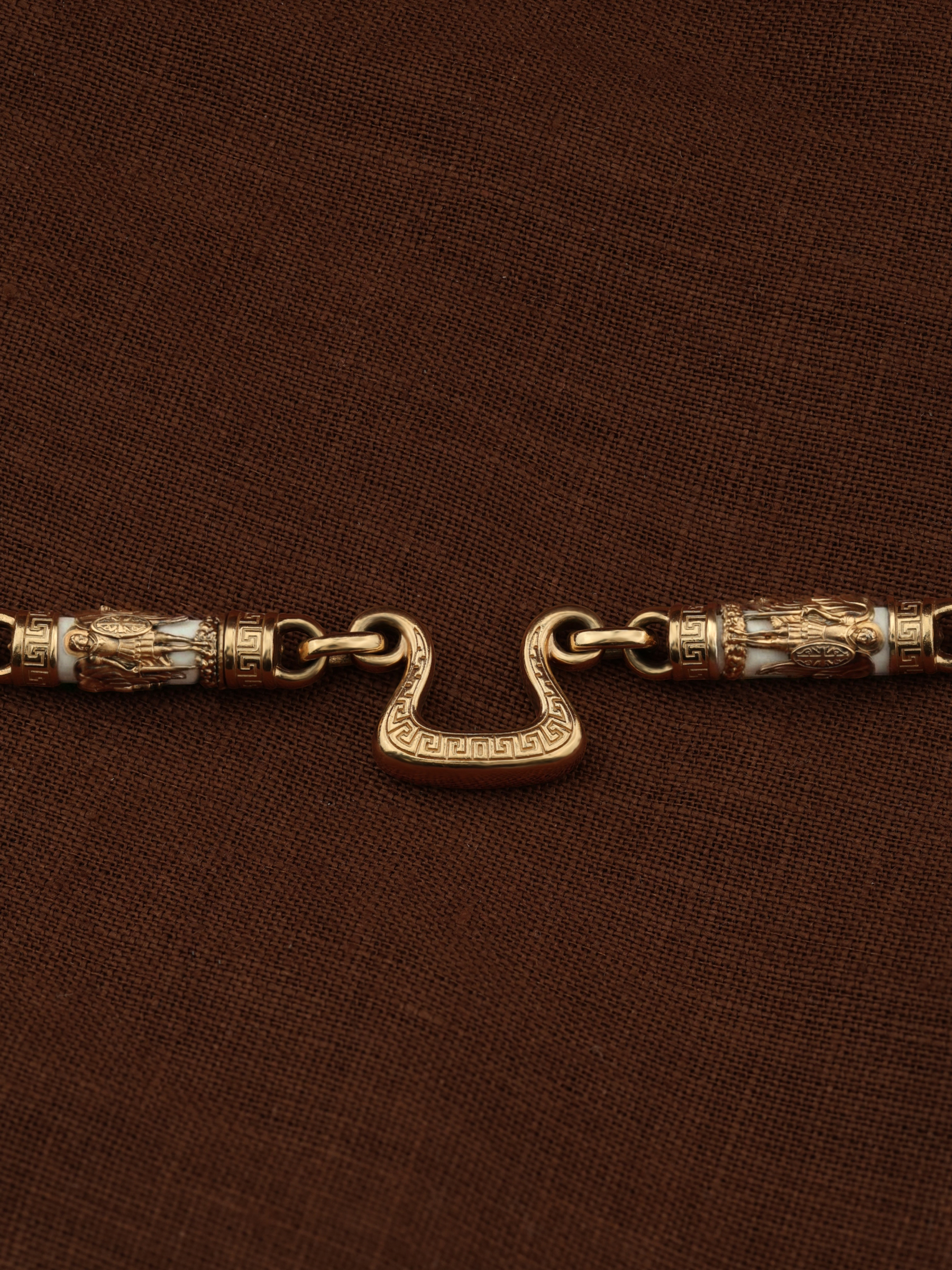 На звеньях цепи изображена Хризма — монограмма имени Христа, которая состоит из двух начальных греческих букв имени — Х (хи) и Р (ро), скрещённых между собой. По краям монограммы помещены греческие буквы a и w. Такое употребление этих букв восходит к тексту Апокалипсиса: «Аз есмь Альфа и Омега, начало и конец, говорит Господь, Который есть и был и грядет, Вседержитель.» (Откр. 1:8; см. также Откр. 22:13). Также на звеньях изображен Святой Ангел-Хранитель в виде прекрасного юноши держащего в правой руке мечь, а в левой — щит. Ангел-Хранитель — это Ангел приставляемый Богом к человеку при крещении для охраны и помощи в добрых делах. Он невидимо находится при человеке на протяжении всей его жизни, если человек сохраняет в себе любовь к Богу и истинную веру перед Ним. Ангел-Xранитель делают для нас все, что служит к истинному нашему благу и спасению. Невидимо пребывая при нас постоянно, он, руководствуя нас ко спасению, не только по нашему желанию таинственно наставляет нас на все доброе и полезное, не только возносит наши молитвы к Богу, но еще и сам от себя охраняют и защищают нас от врагов видимых и невидимых и ходатайствует за нас пред Богом. Ангел-Хранитель так любит нас, как никто на земле любить не может. Одного лишь каждому из нас он желает — спасения души; к этому он направляет все свои заботы. И если видит нас также заботящимися о спасении, радуется, если же видит нас пребывающими в нерадении о душе своей, скорбит. Но и самый великий грешник может примириться со своим Ангелом-Хранителем посредством искреннего раскаяния в грехах и оставления их навсегда. В таком случае, по слову Писания, великая радость бывает для всех ангелов на небесах (Лк. 15:10). Цепь украшена орнаментом.