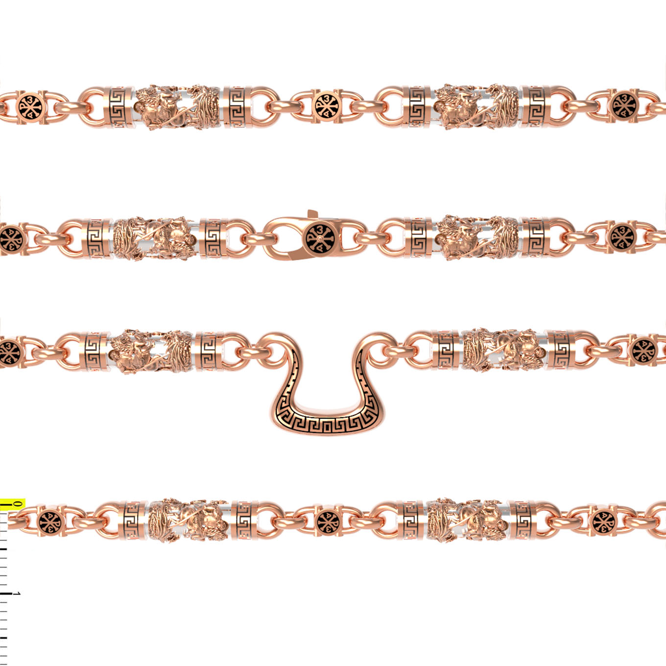 На звеньях цепи изображена Хризма — монограмма имени Христа, которая состоит из двух начальных греческих букв имени  — Х (хи) и Р (ро), скрещённых между собой. По краям монограммы помещены греческие буквы a и w. Такое употребление этих букв восходит к тексту Апокалипсиса: «Аз есмь Альфа и Омега, начало и конец, говорит Господь, Который есть и был и грядет, Вседержитель.» (Откр. 1:8; см. также Откр. 22:13). Также на звеньях цепи помещено изображен святого великомученика Георгия Победоносца — одного из самых почитаемых и удивительных святых. Георгий родился в Каппадокии (Малая Азия) в семье богатых и знатных горожан. Юношей поступил на службу к римскому императору Диоклетиану, за отличное знание военного дела и проявленную в боях и походах храбрость был приближен к императору и удостоен высокого воинского звания. Во время начавшихся гонений на христиан, перешел на сторону гонимых и, отвергнув человеческий страх, стал ярым проповедником учения Христа. Мучители подвергли опального воеводу жесточайшим восьмидневным пыткам и казнили его (обезглавили) в возрасте около тридцати лет в 303 году. На Руси он известен как Юрий или Егорий, заступник для верующих, чья жизнь имеет какое-либо отношение к военным делам, помощник в крестьянском труде. На цепи Георгий изображен как воитель, сидящий на вздыбленном коне и поражающий копьем огнедышащего змея. Змей символизирует собою сатанинские силы. Молитвами вознесенными к Всевышнему и своей непреклонной верой он смог одолеть чудовище. Святой убил змея, спас царскую дочь, принесенную в жертву, и жителей города, их души от влияния дьявола, породив в них надежду и веру в Господа, призывая людей принять христианскую веру. Цепь украшена орнаментом.
